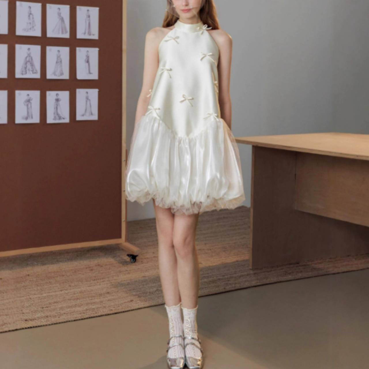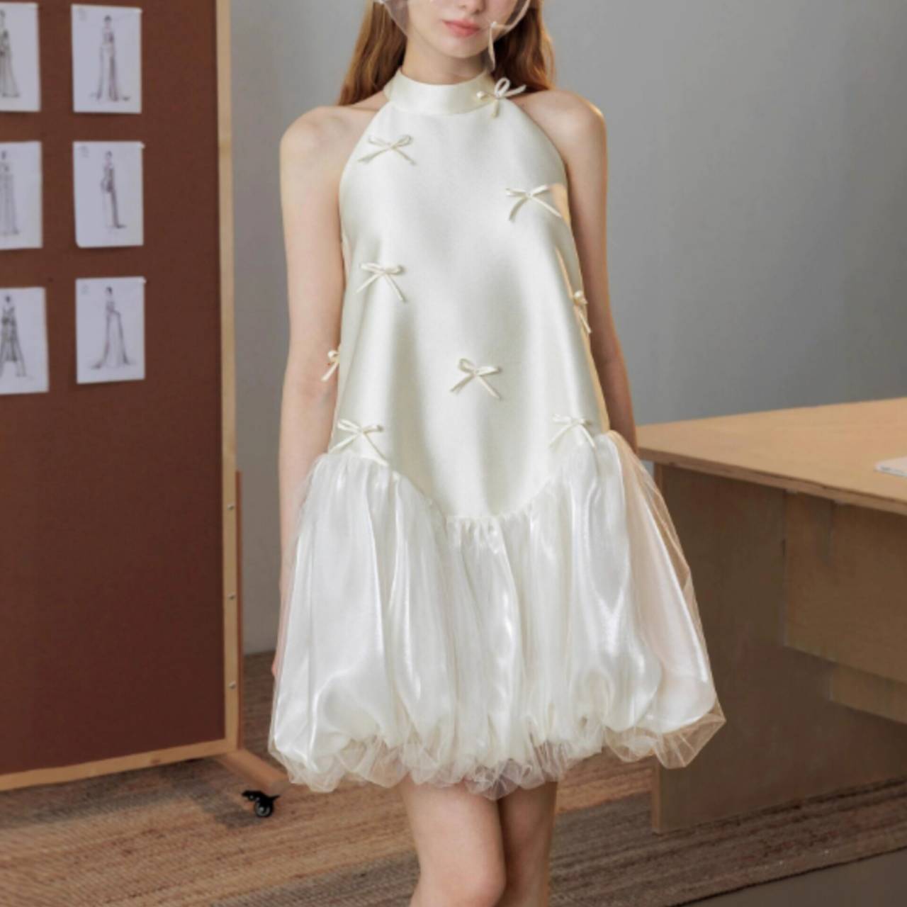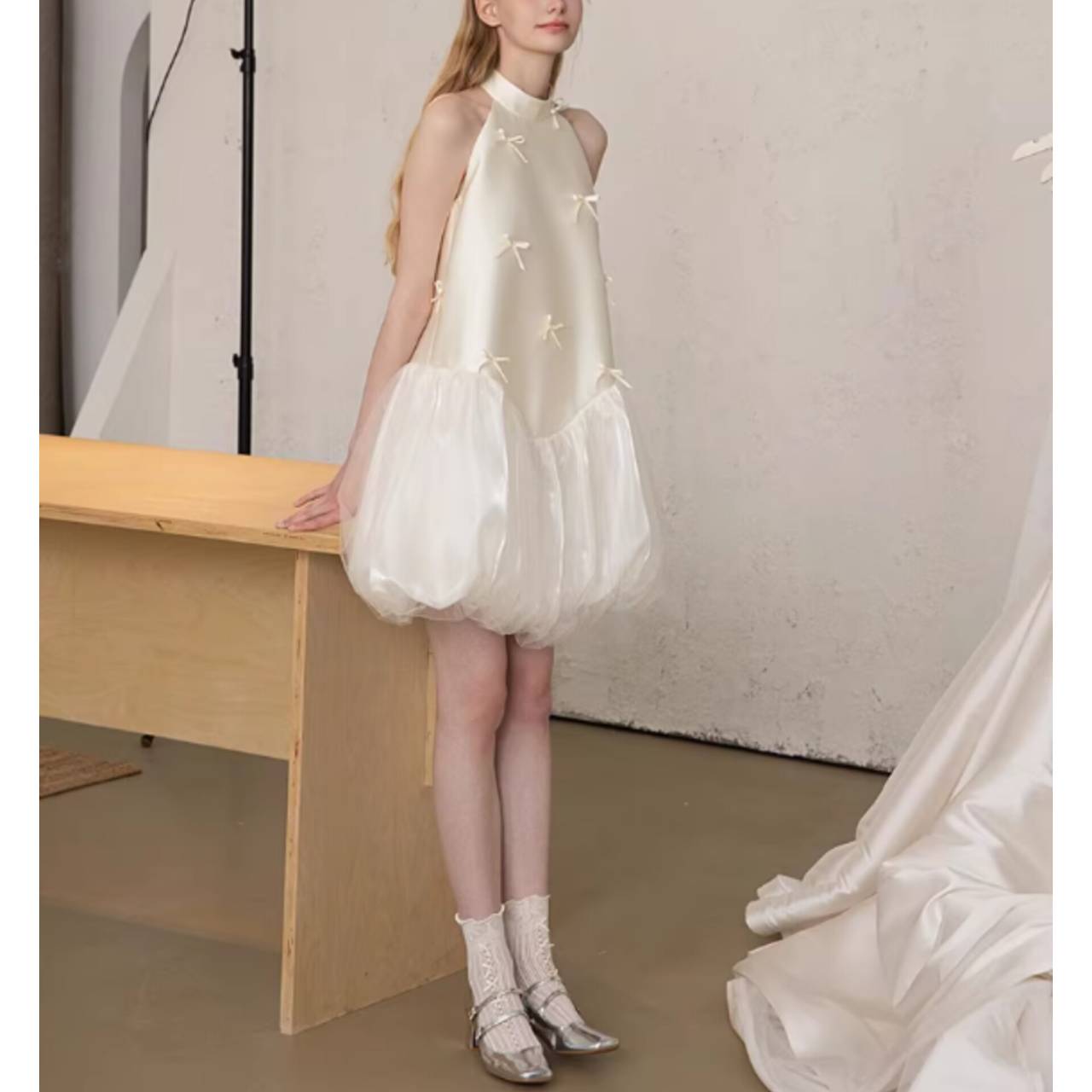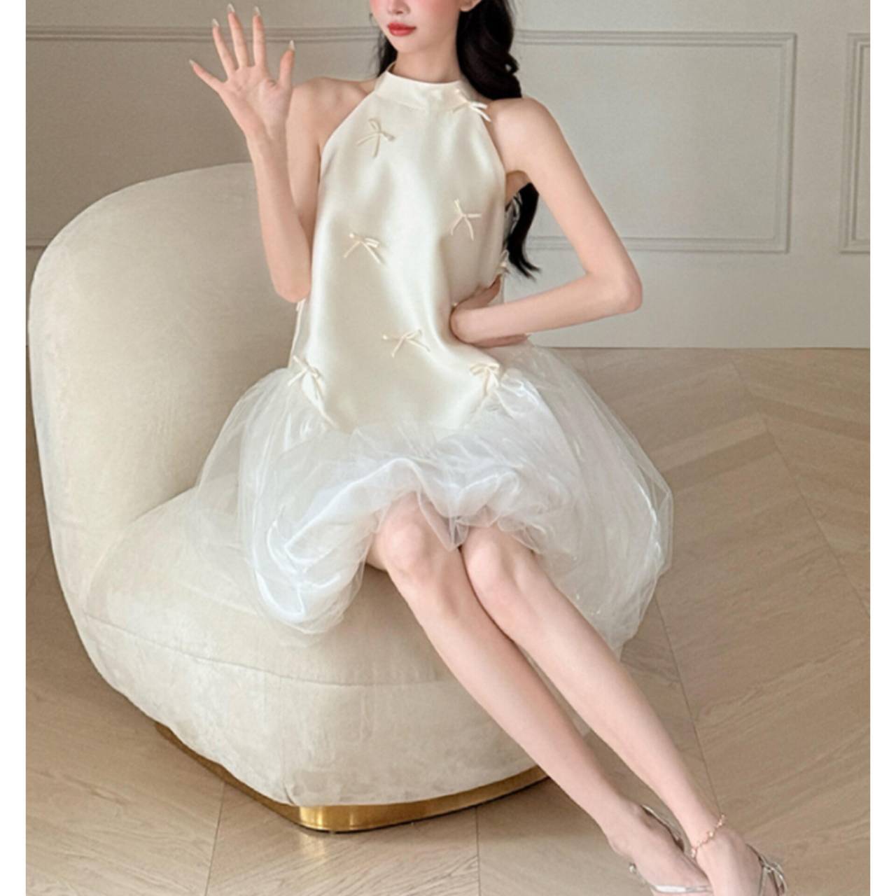 なめらかなサテンが上半身をすっきり見せ、小さなリボンディテールが繊細な可愛らしさを演出します。首元は上品なホルターネック仕様でデコルテを美しく強調し、自然と縦ラインをつくるシルエット設計により脚長効果も抜群。
