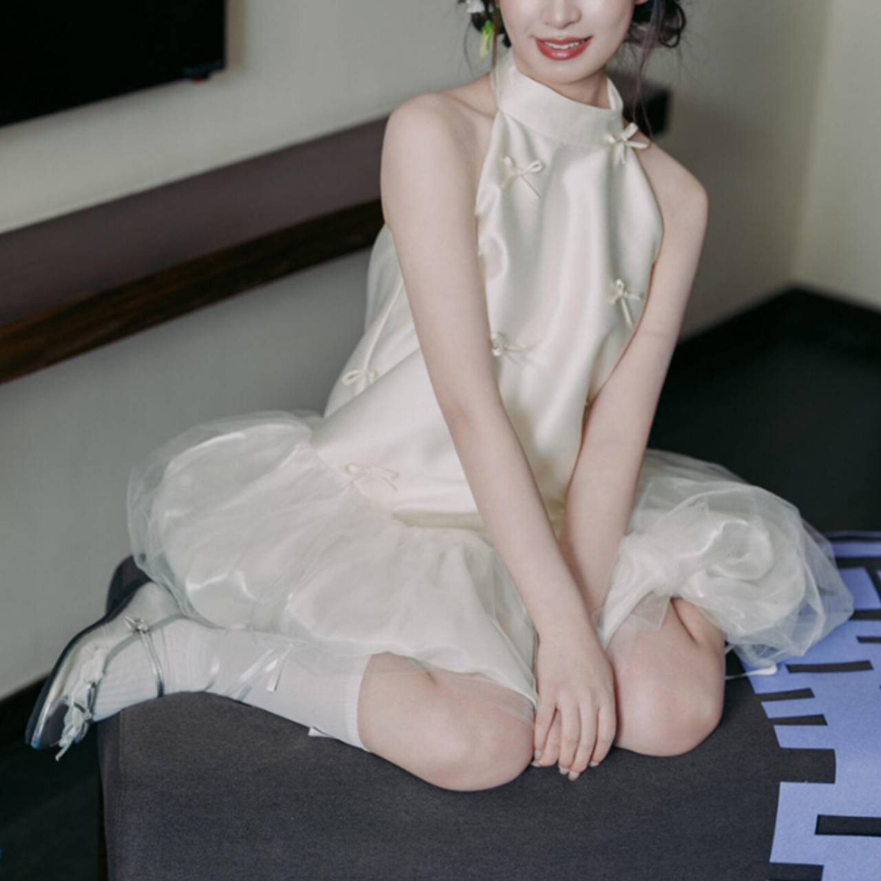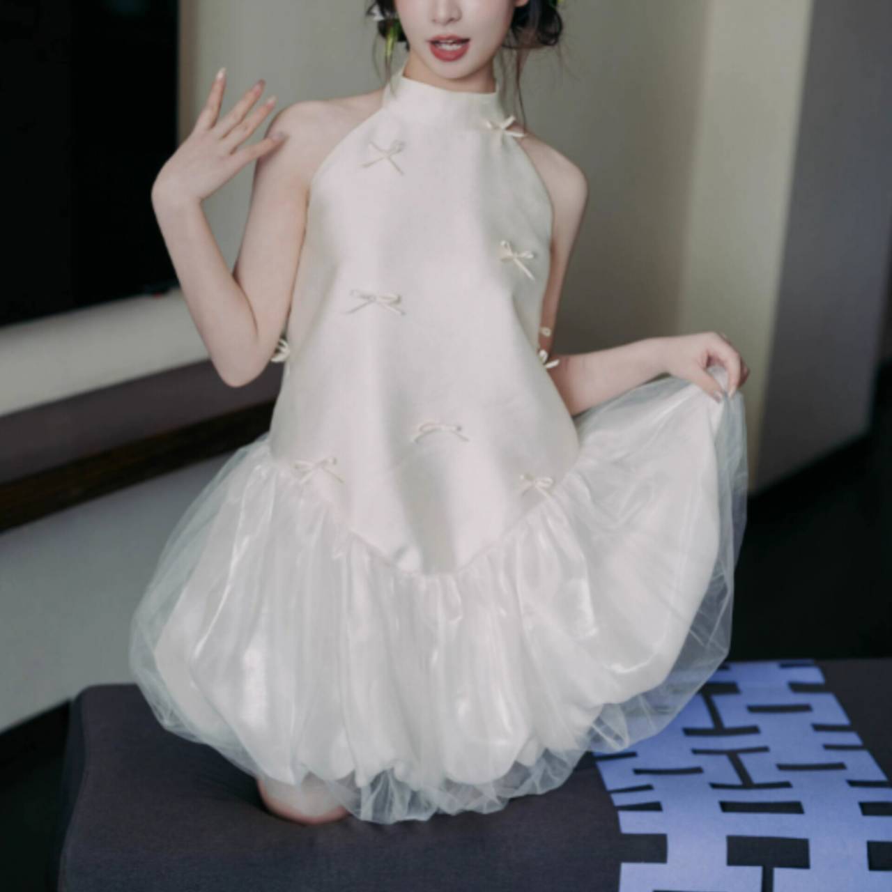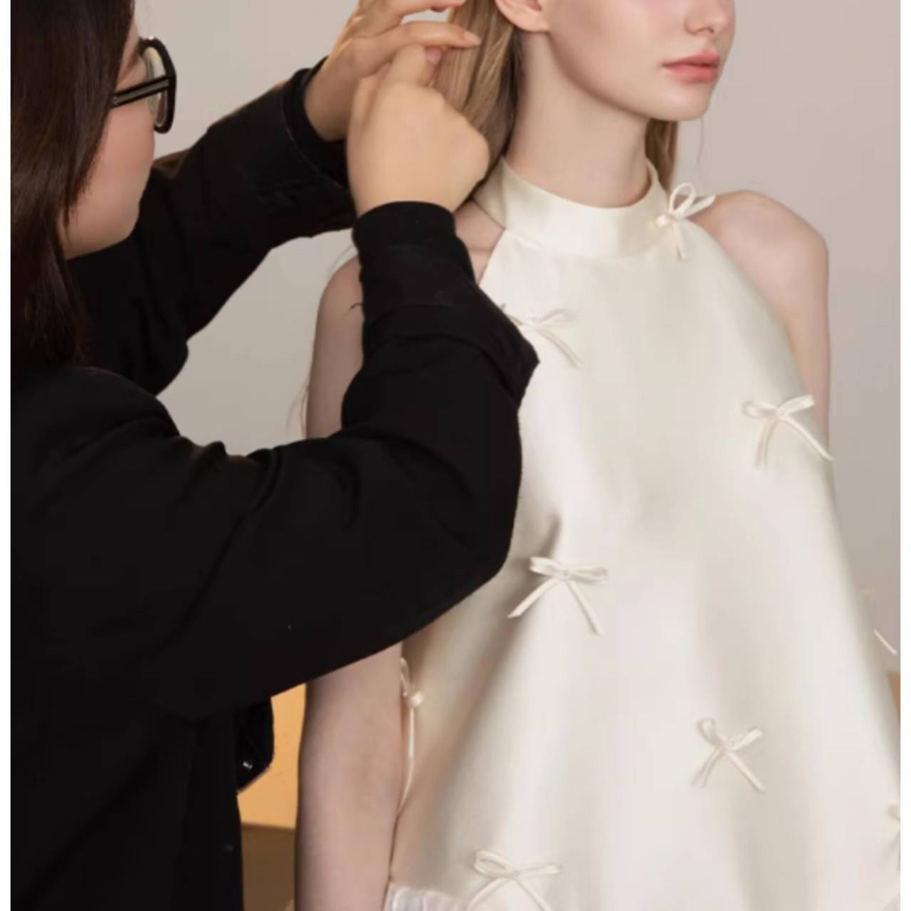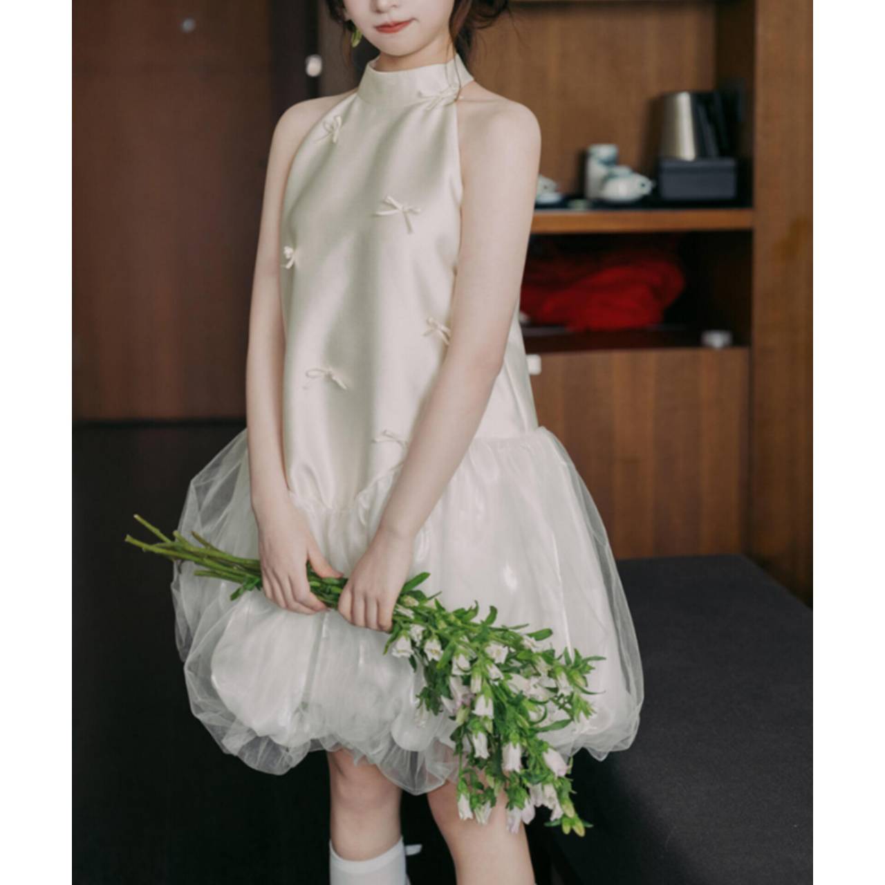 なめらかなサテンが上半身をすっきり見せ、小さなリボンディテールが繊細な可愛らしさを演出します。首元は上品なホルターネック仕様でデコルテを美しく強調し、自然と縦ラインをつくるシルエット設計により脚長効果も抜群。
