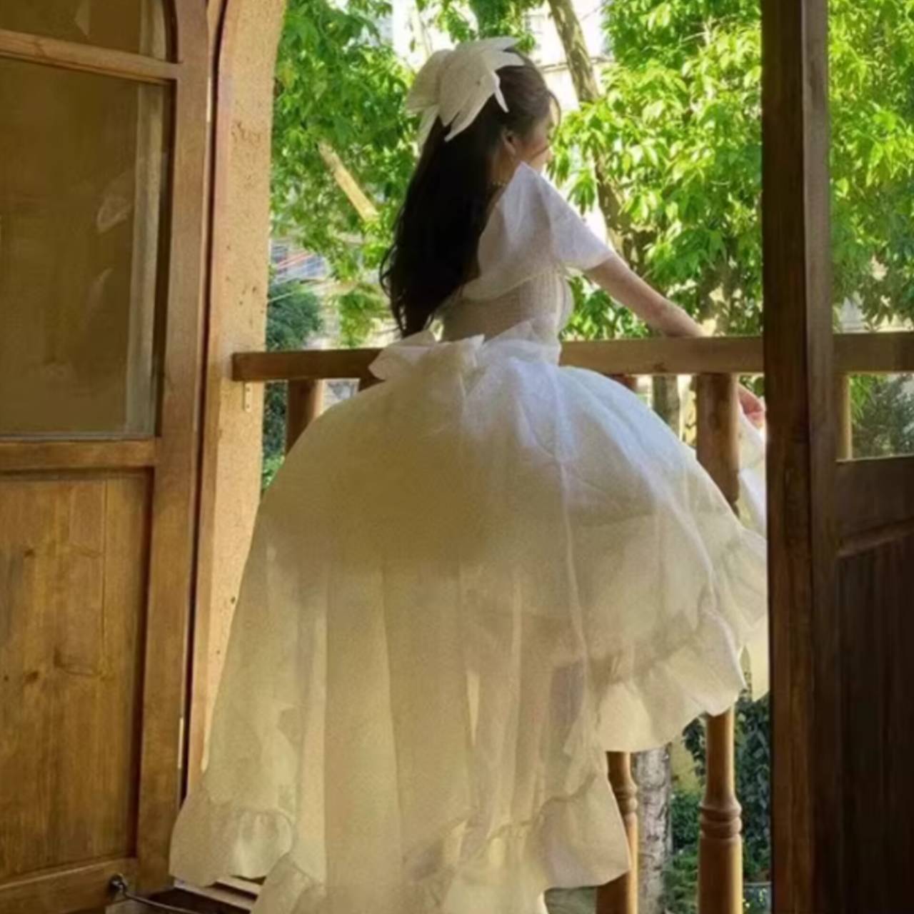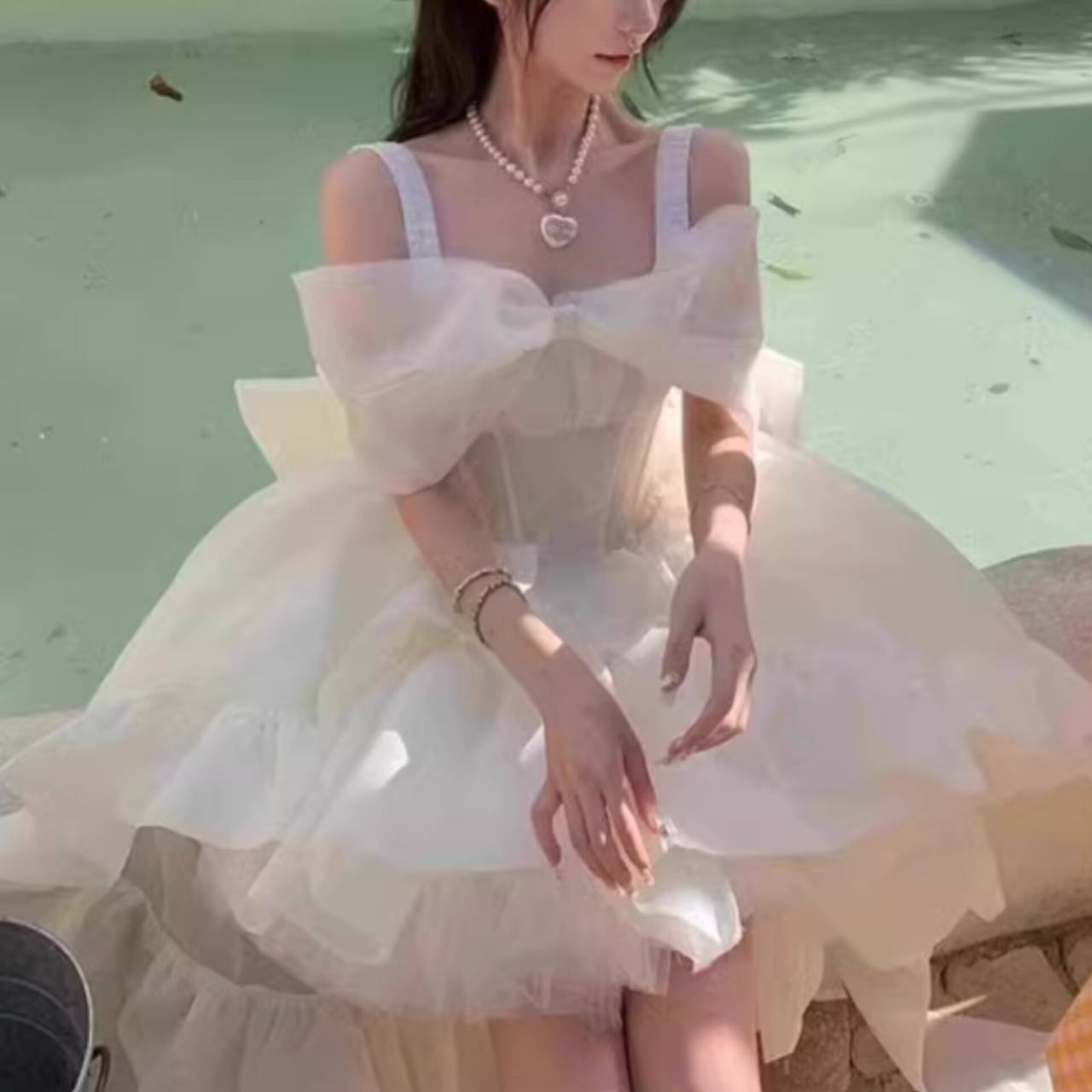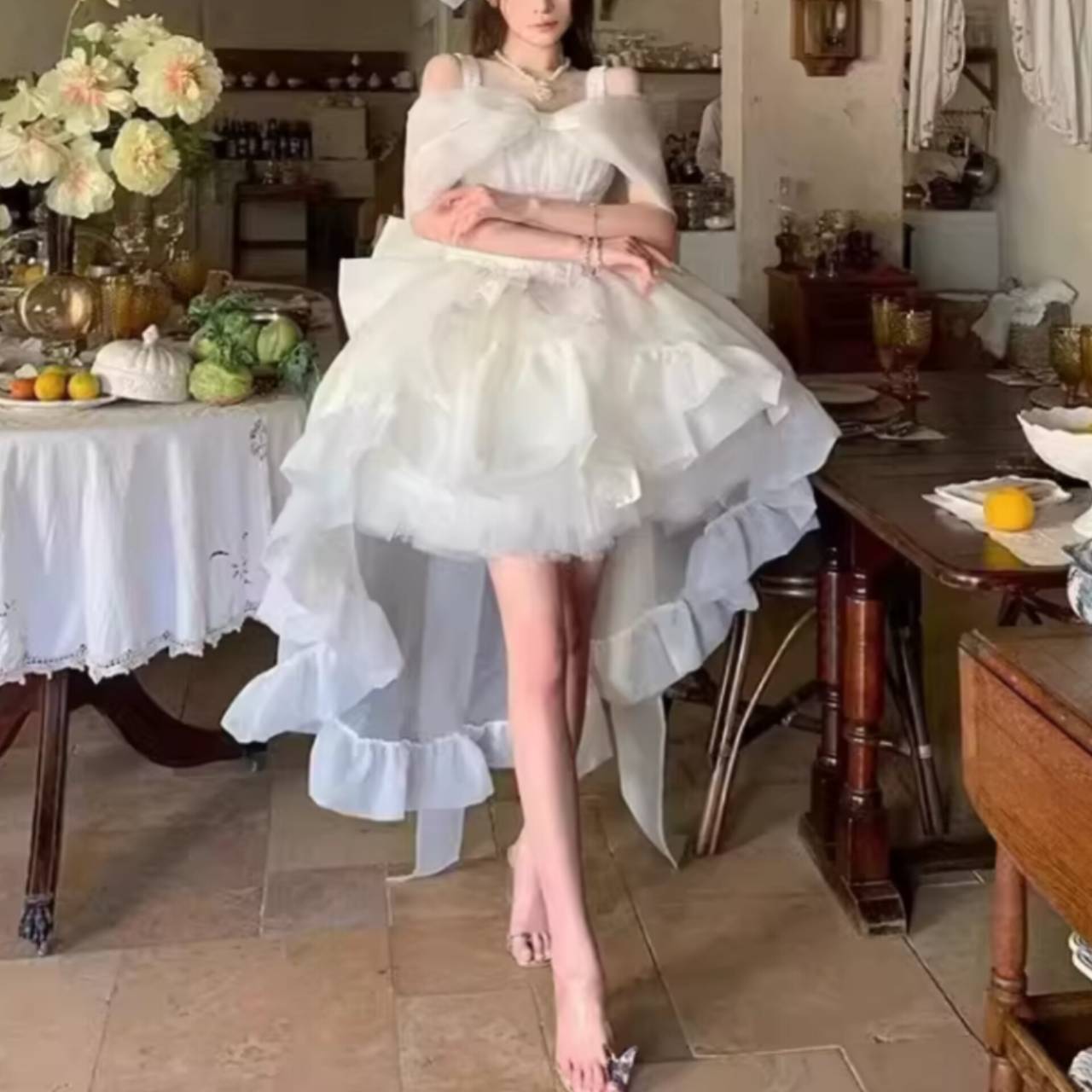 2way ウェディングドレス 韓国ドレス ノースリーブ スクエアネック リボン オーガンジー ハイウエスト ミニ丈 ショート丈 ハイローヘム ヘムスカート ヘムドレス フィッシュテール フレア プリンセスライン フリル トレーン付き ラッフルフリル アシンメトリー スタイルアップ 足長効果 結婚式 二次会 フォトウェディング 前撮り 花嫁 S/XL 韓国【B13554】
