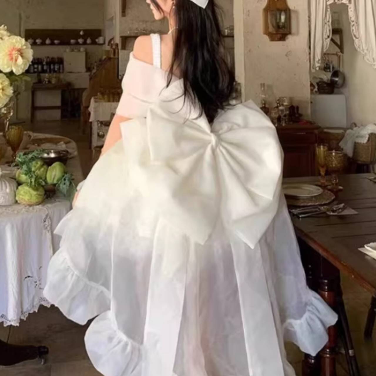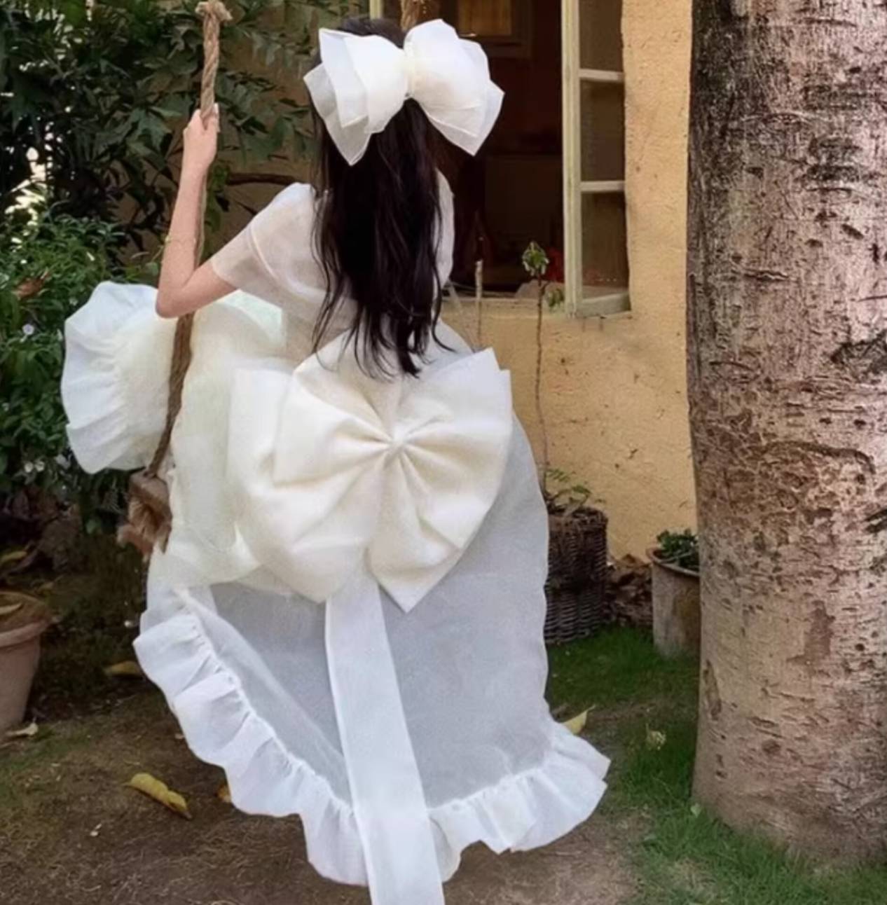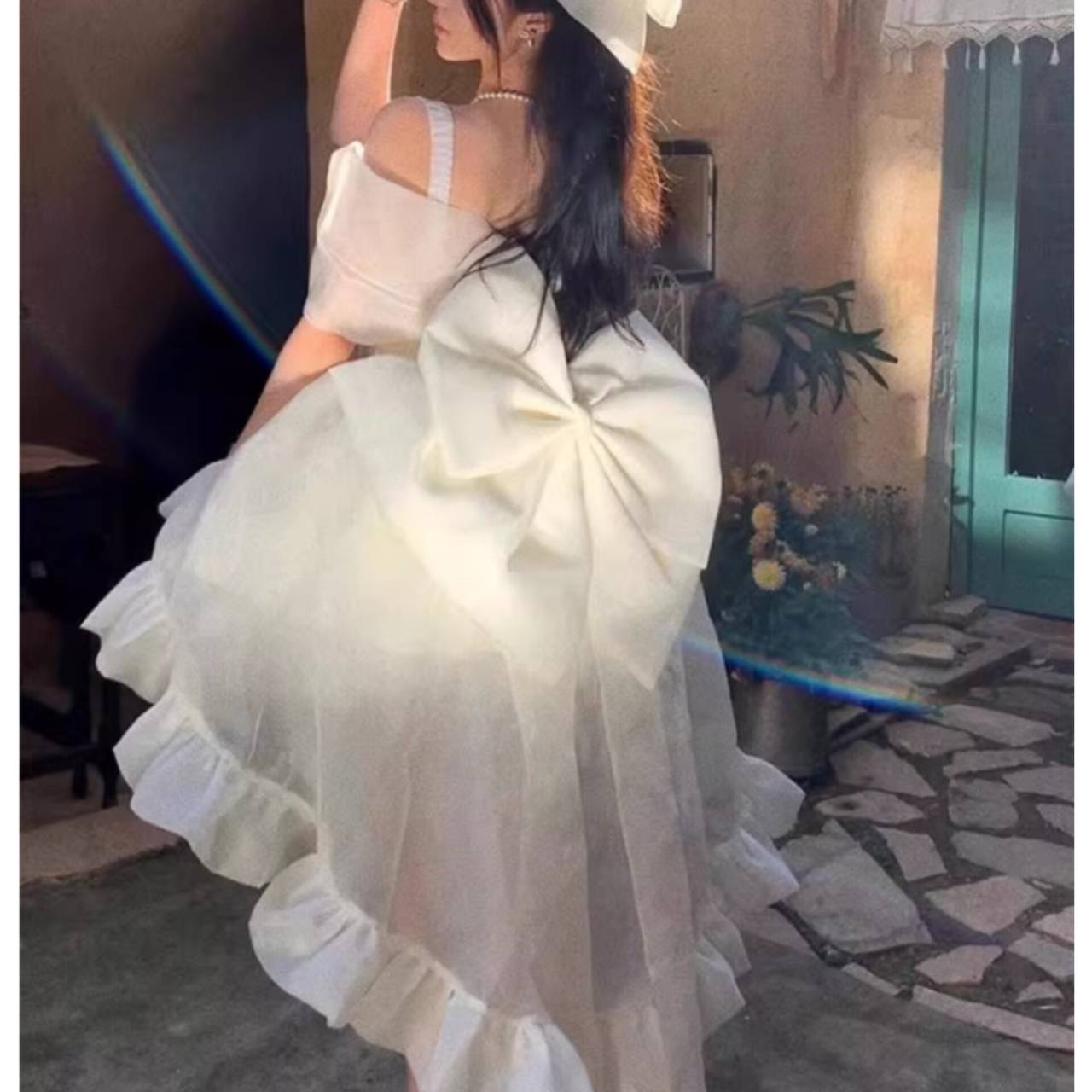 さらに前後差のあるヘムライン設計により、脚をすらりと長く見せながら、バックスタイルでは大胆な大きめリボンが印象的なアクセントに。