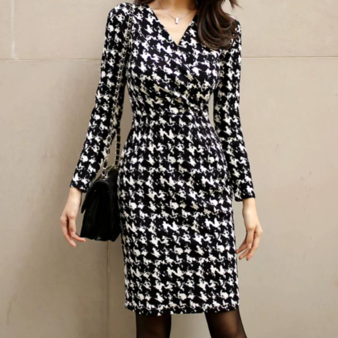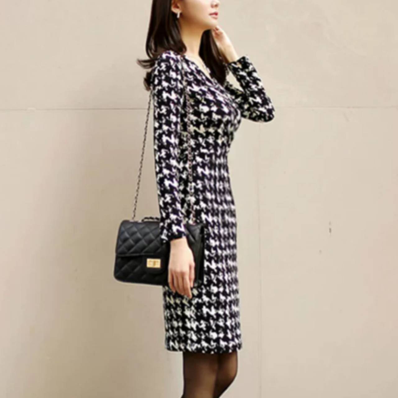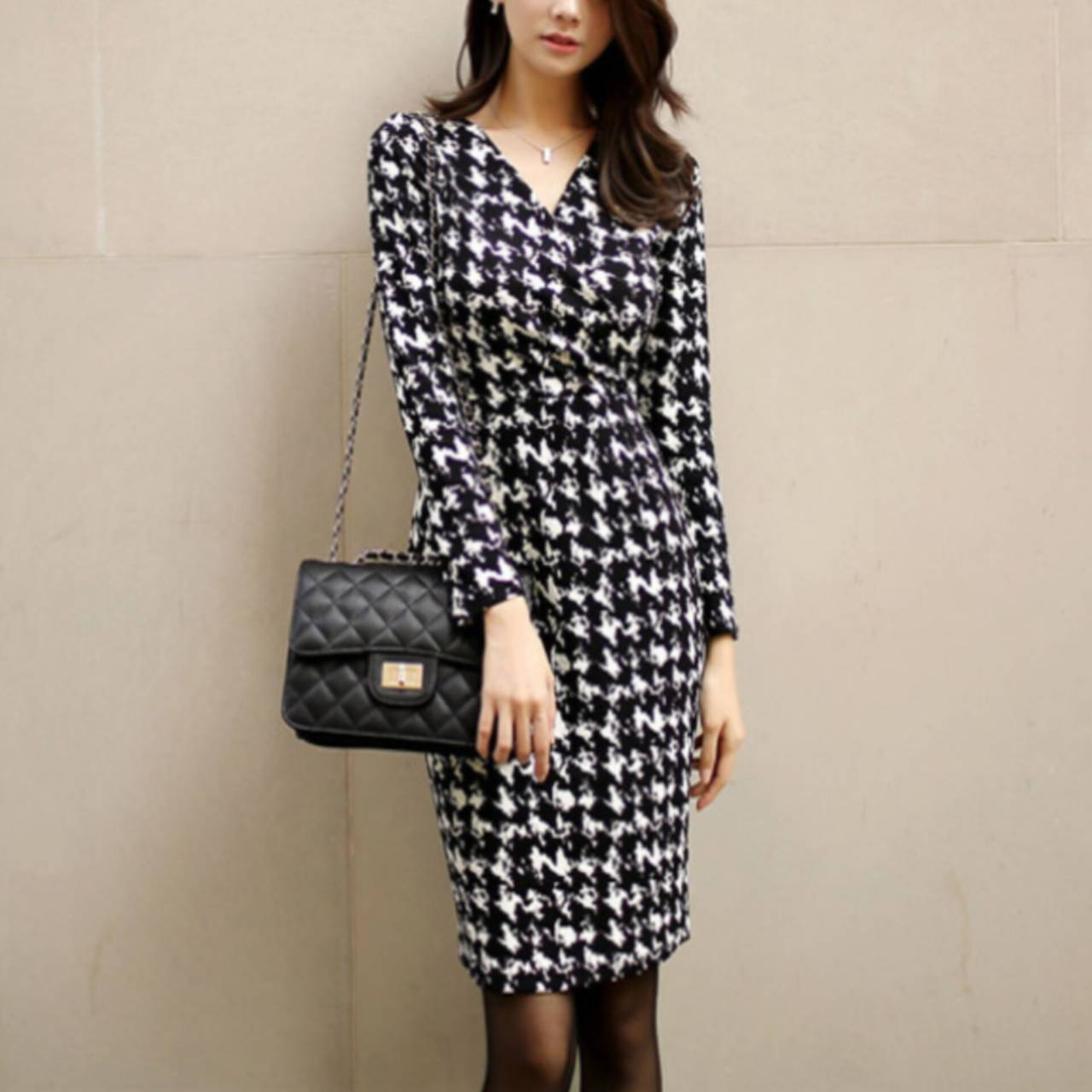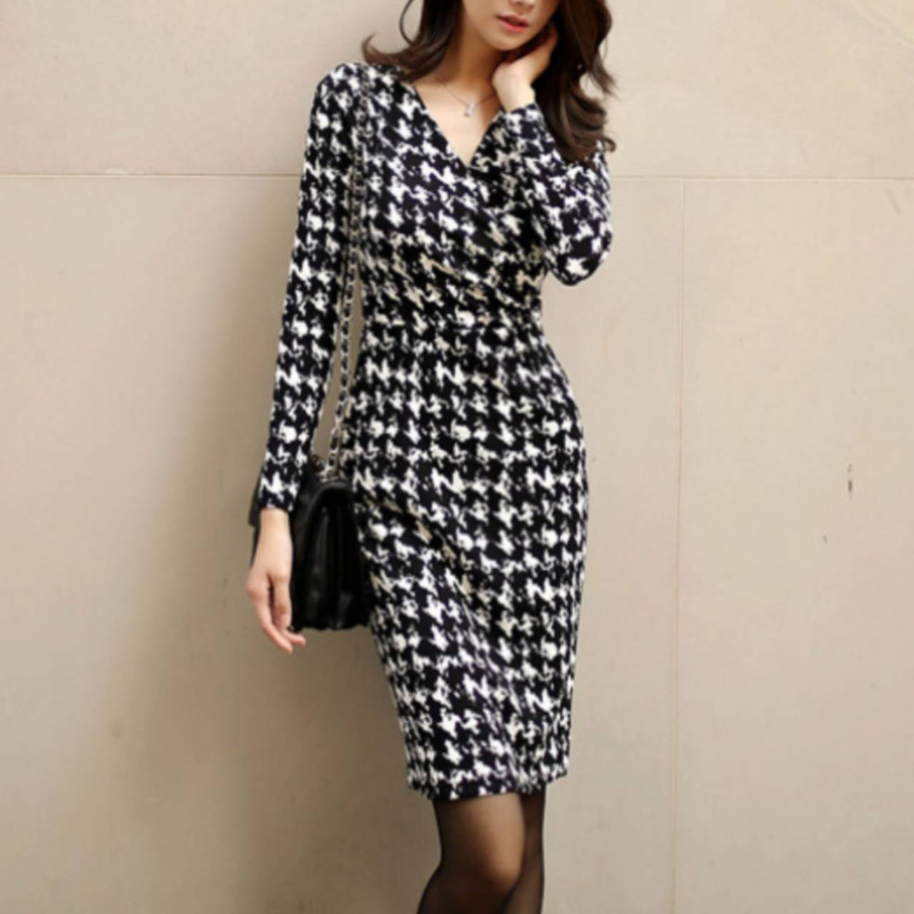 千鳥格子柄 ワンピース 韓国ワンピース ワンピ Vネック カシュクール ハイウエスト ミディアム丈 ミディ丈 膝丈 スリム スレンダー タイト モノトーン 美シルエット スタイルアップ S/XL 韓国【B4549】