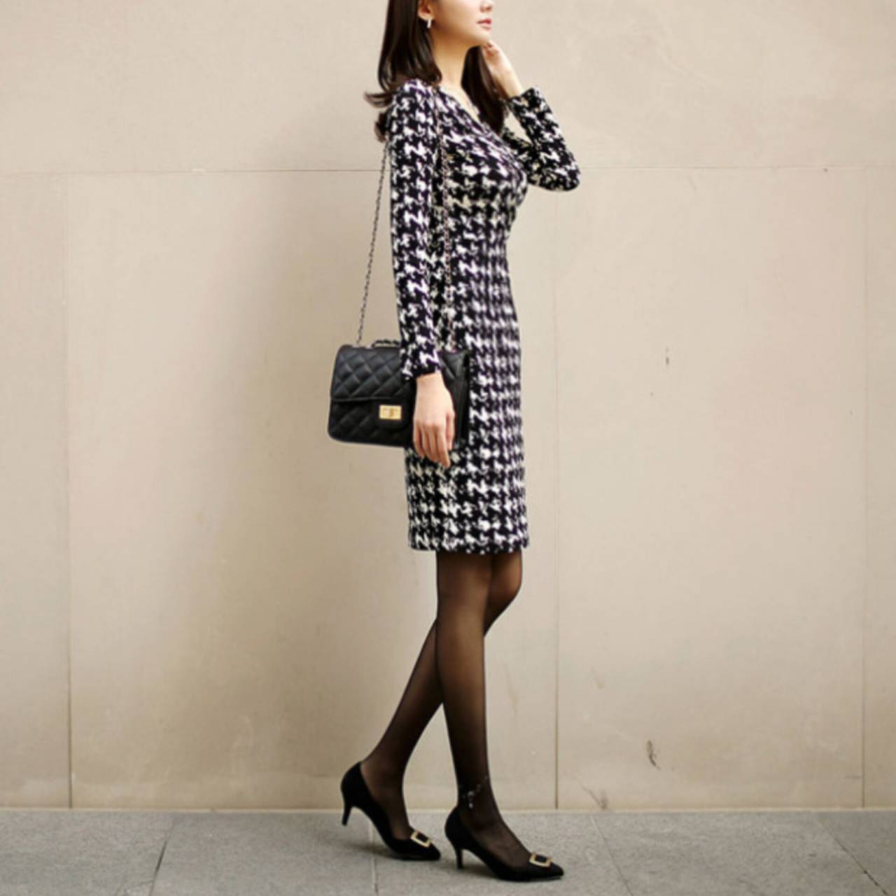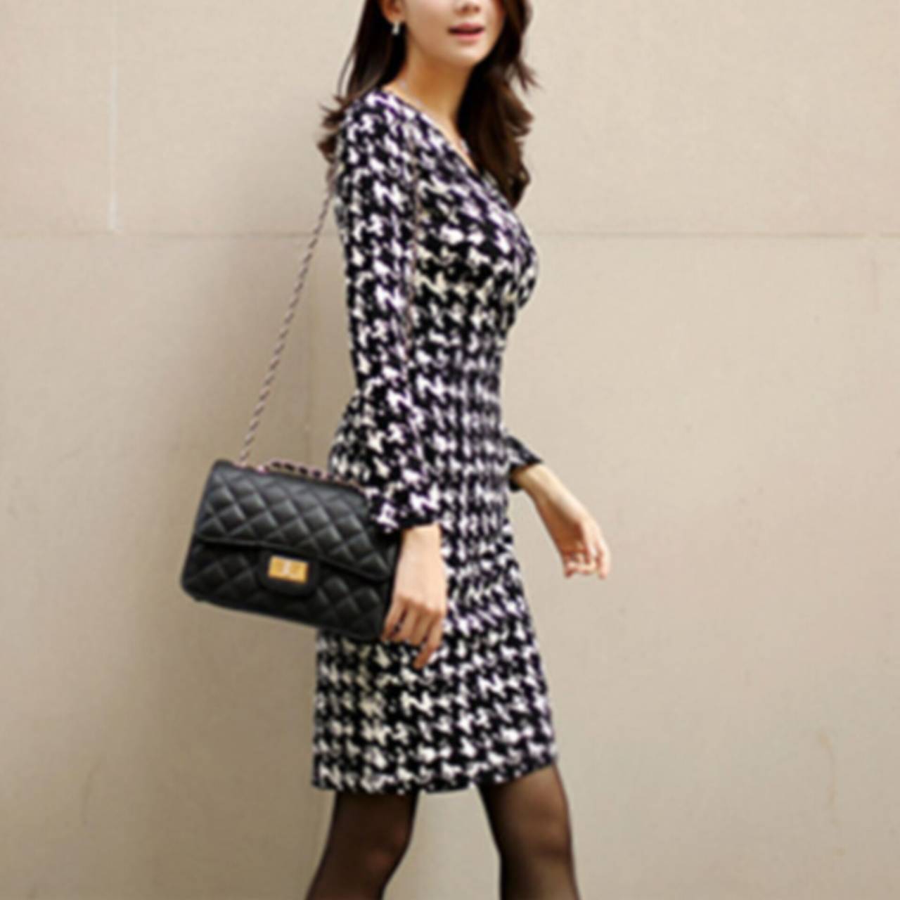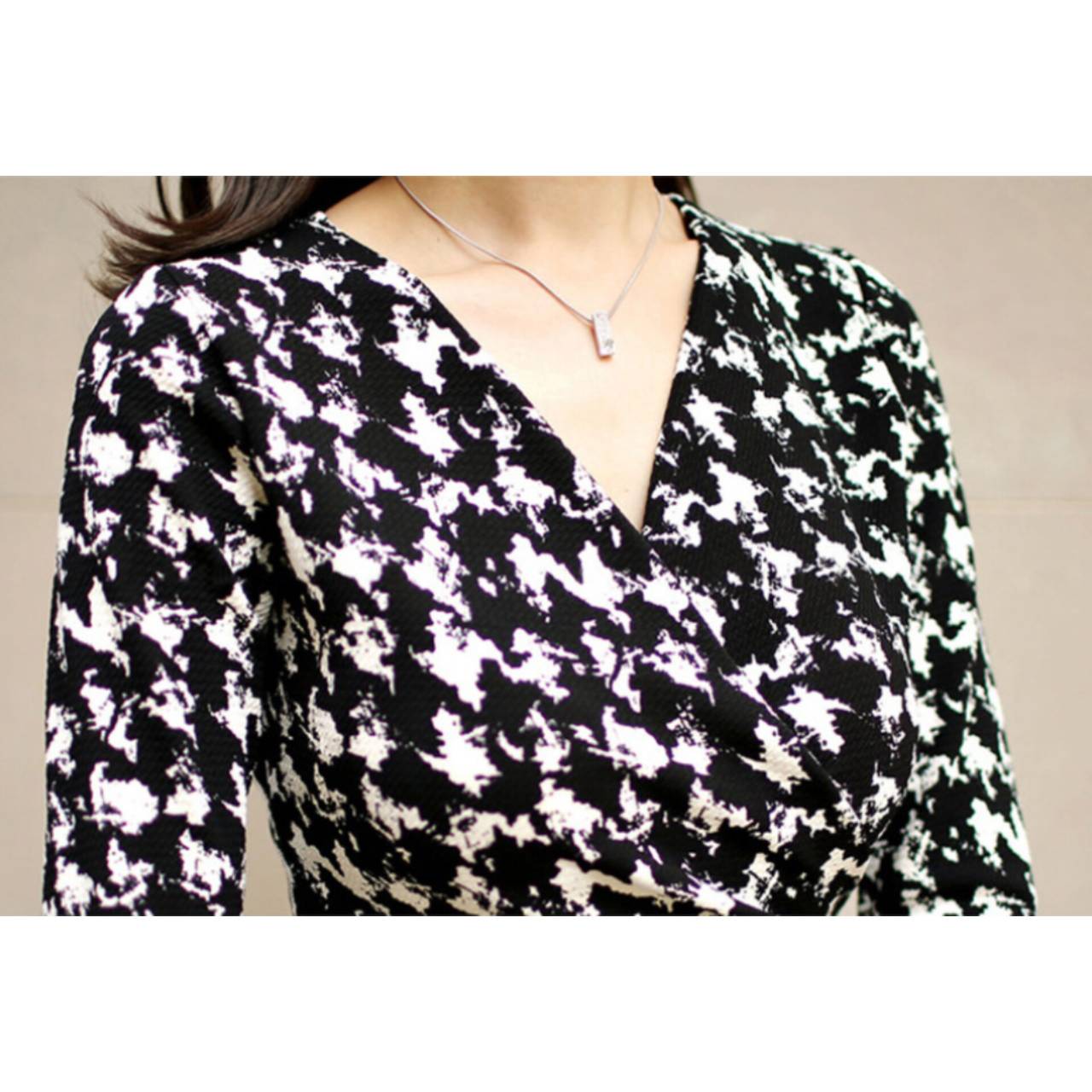 千鳥格子柄 ワンピース 韓国ワンピース ワンピ Vネック カシュクール ハイウエスト ミディアム丈 ミディ丈 膝丈 スリム スレンダー タイト モノトーン 美シルエット スタイルアップ S/XL 韓国【B4549】