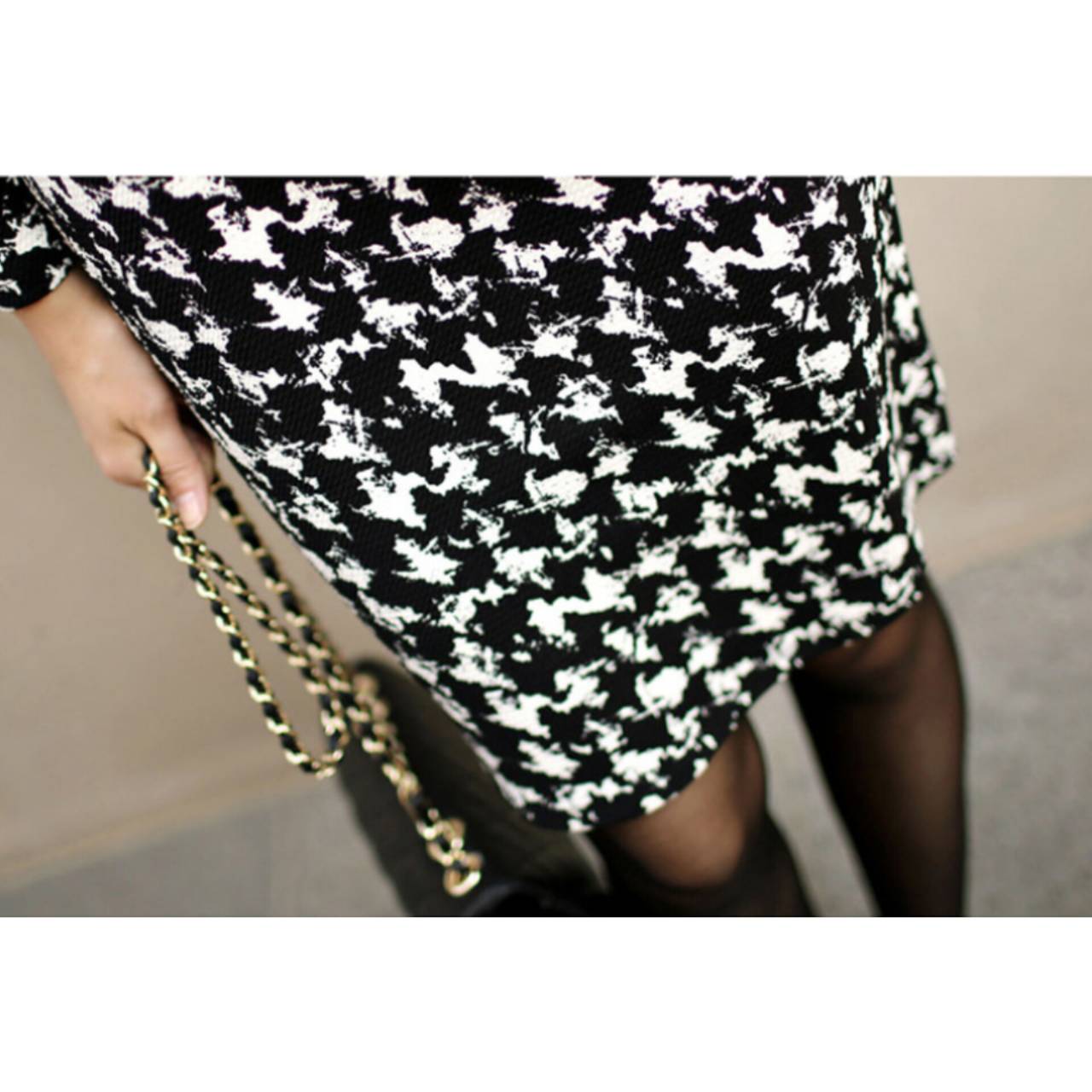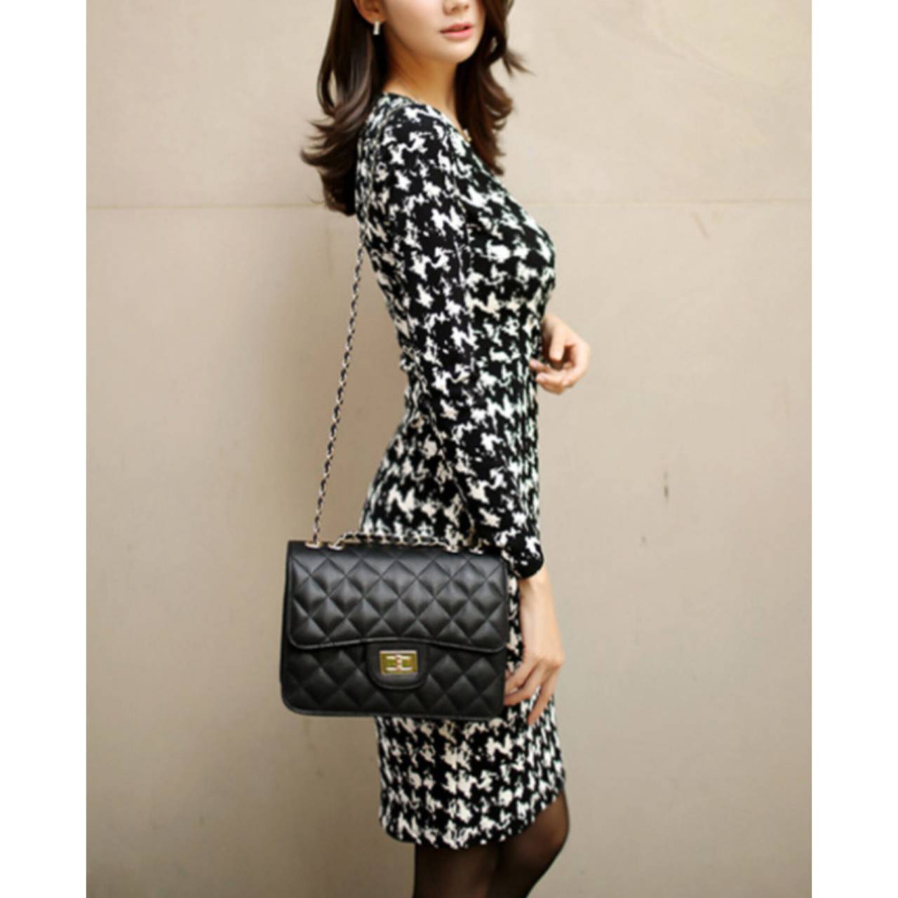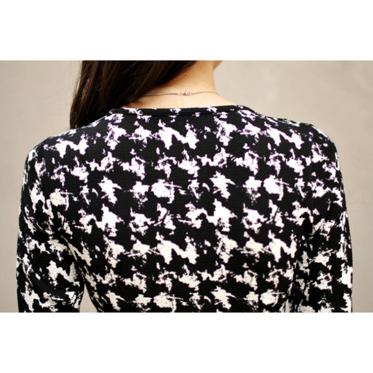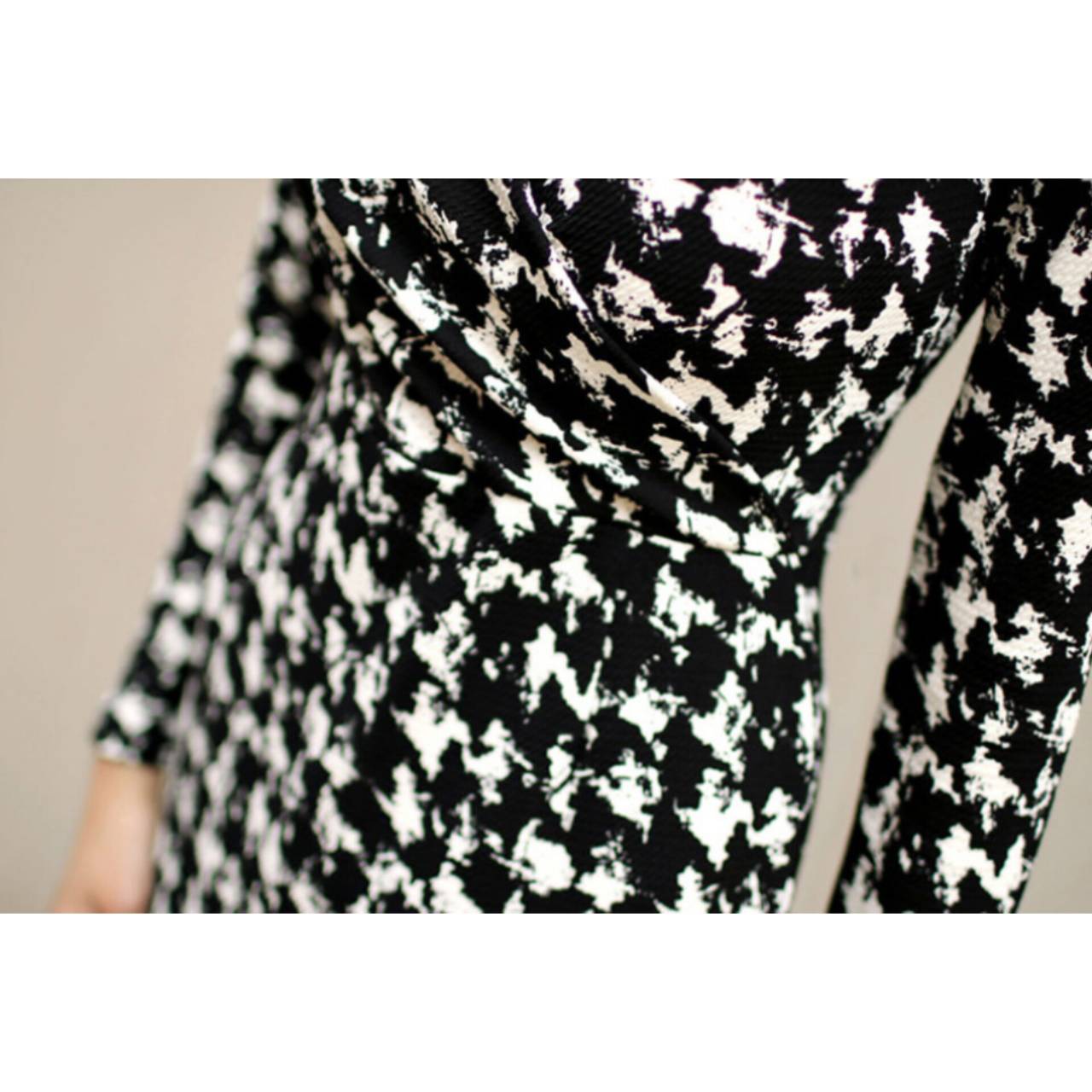 千鳥格子柄 ワンピース 韓国ワンピース ワンピ Vネック カシュクール ハイウエスト ミディアム丈 ミディ丈 膝丈 スリム スレンダー タイト モノトーン 美シルエット スタイルアップ S/XL 韓国【B4549】