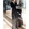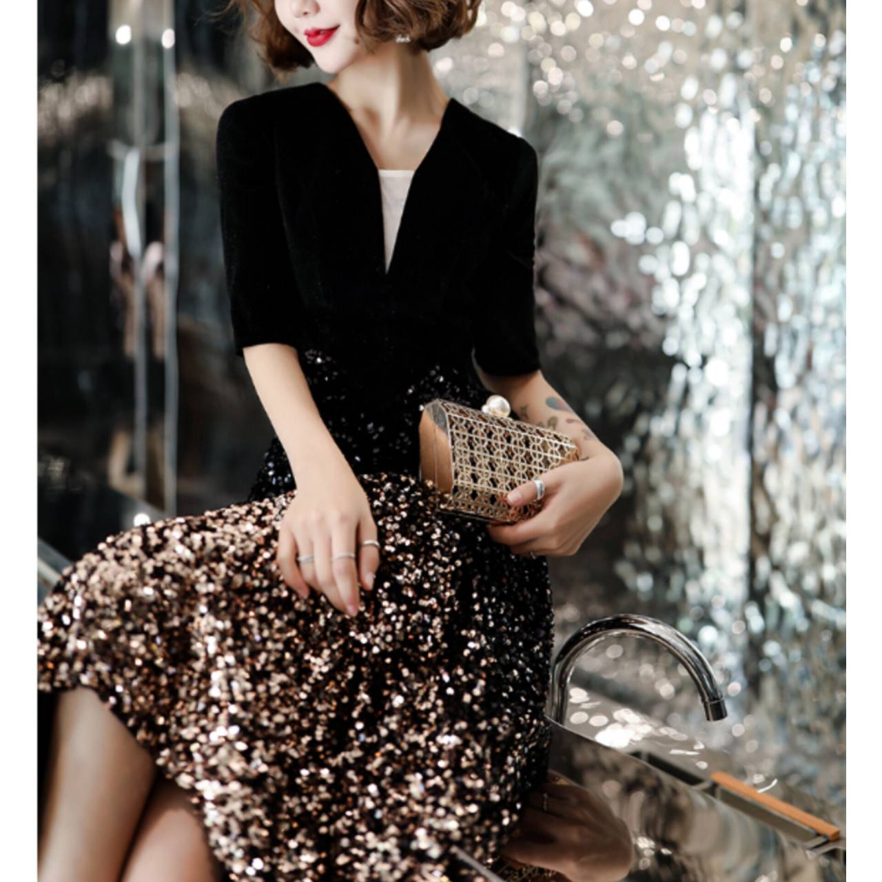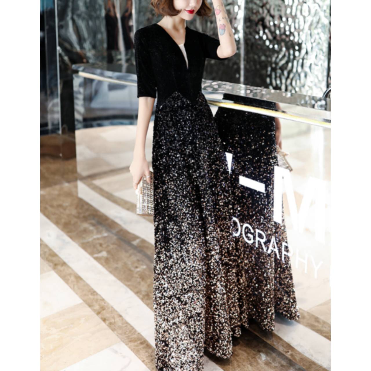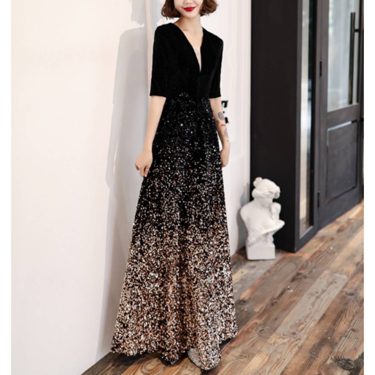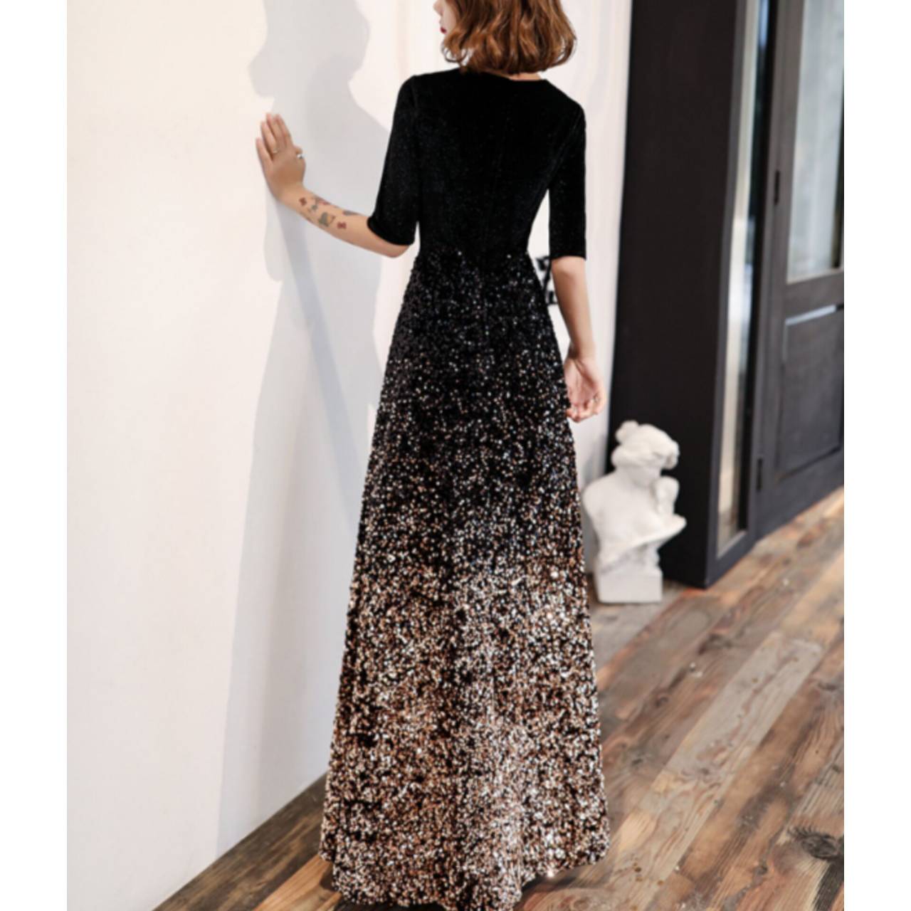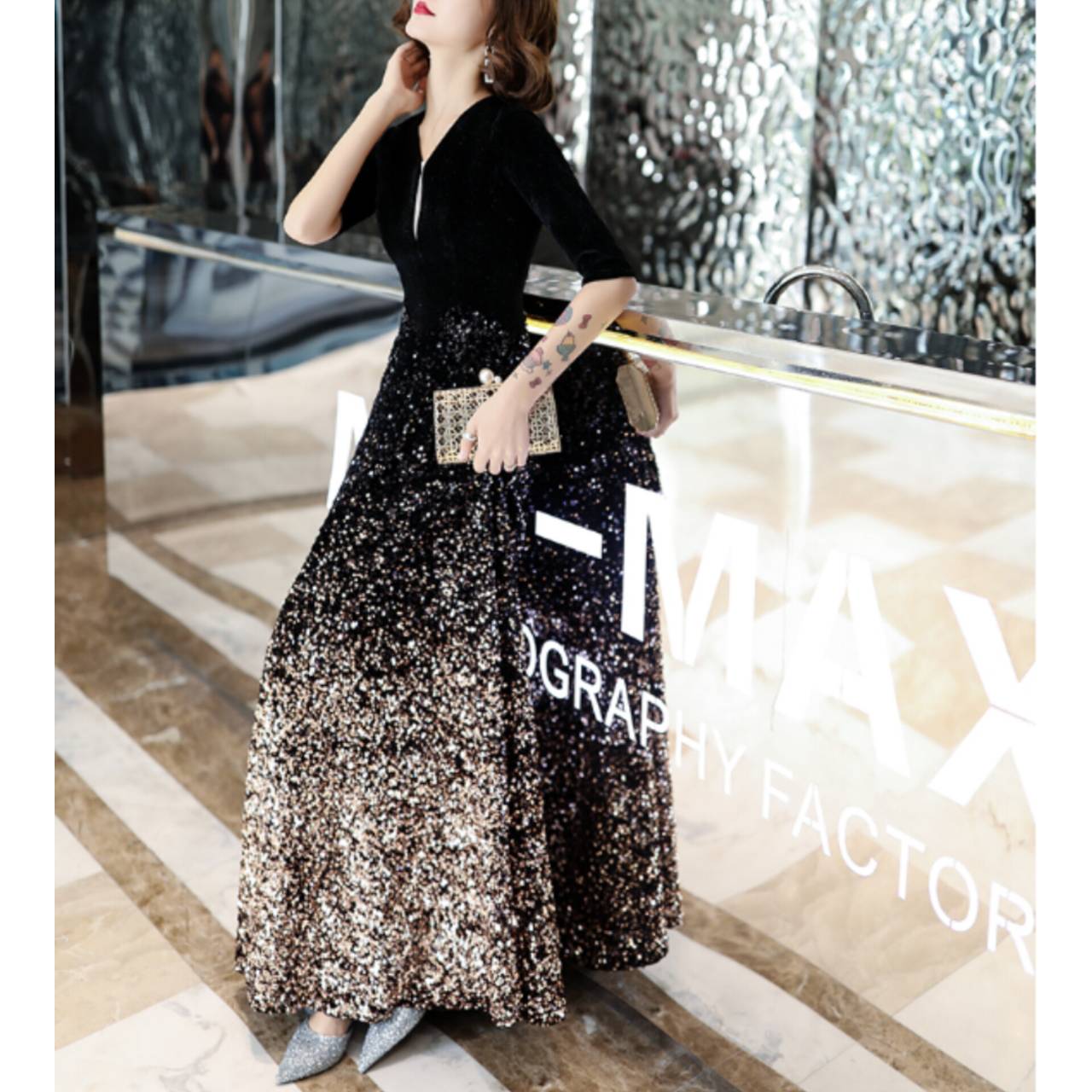 ベルベット ドレス イブニングドレス 韓国ドレス キラキラ ラメ Vネック 5分袖 ハイウエスト Aライン スパンコール グリッター グラデーション フレア ロング XS/2XL 韓国【B4063】