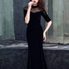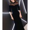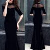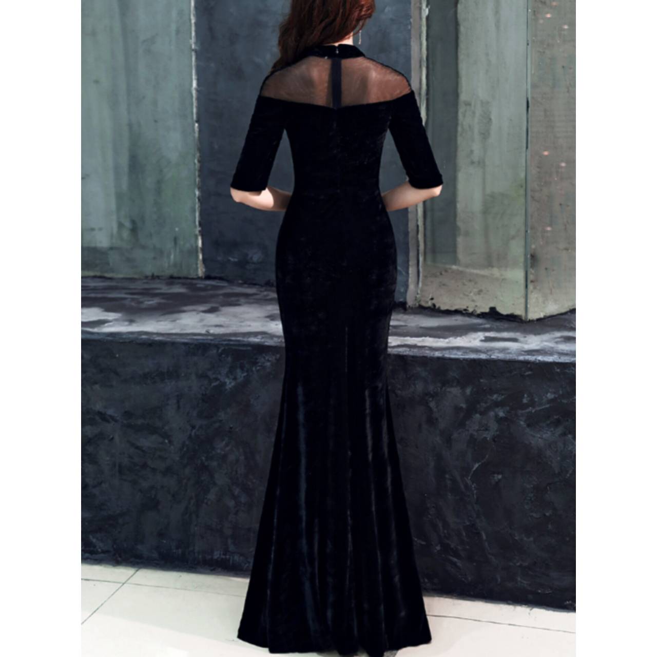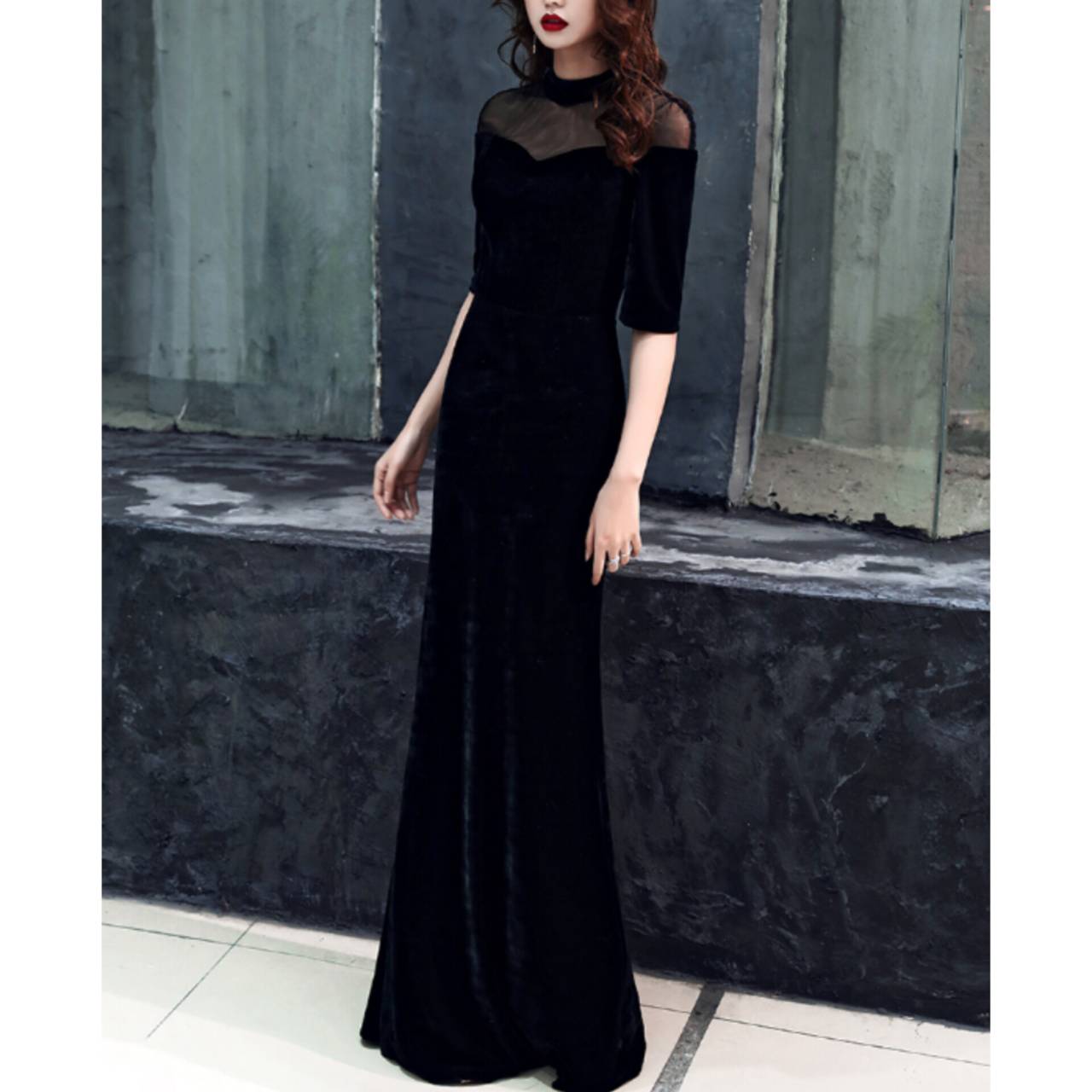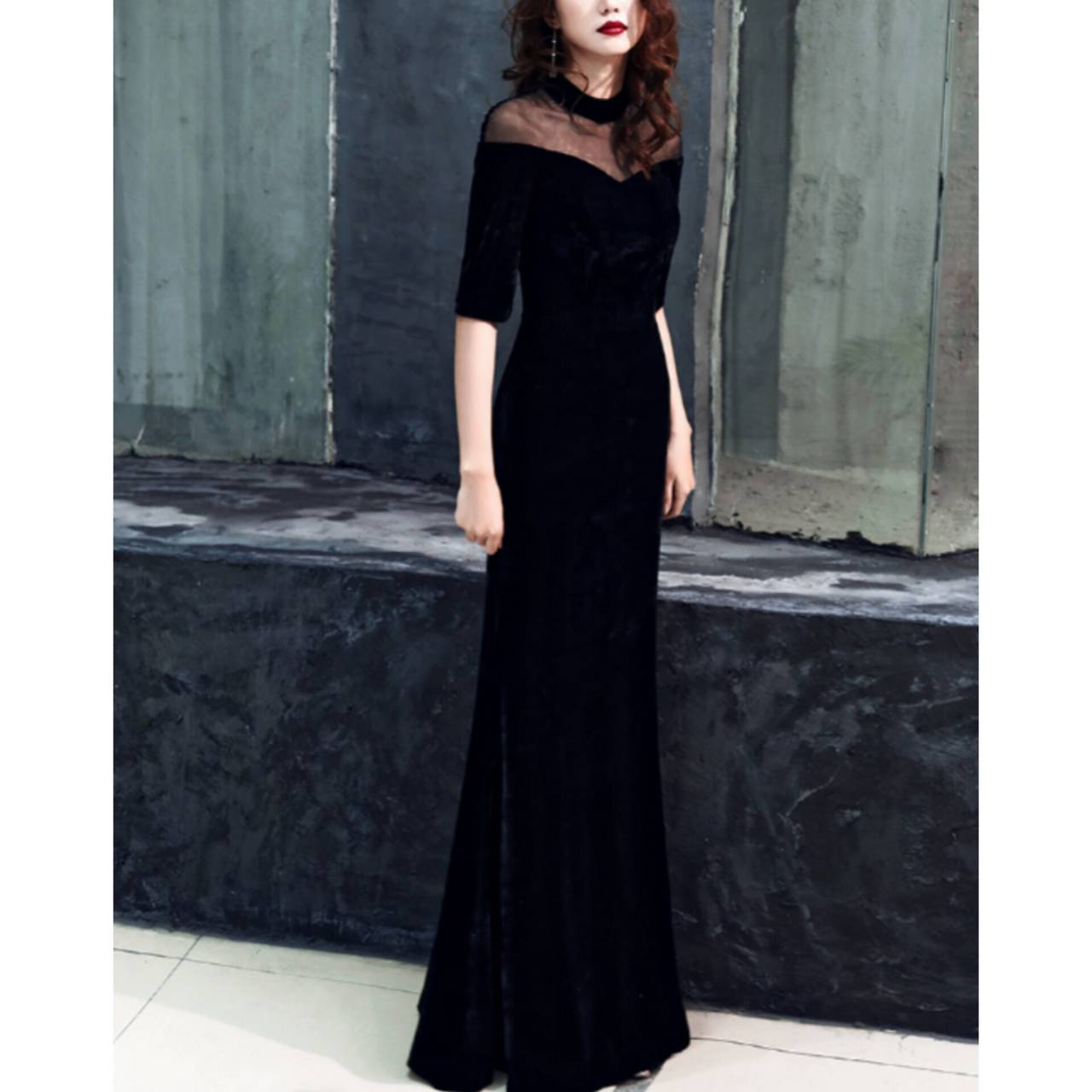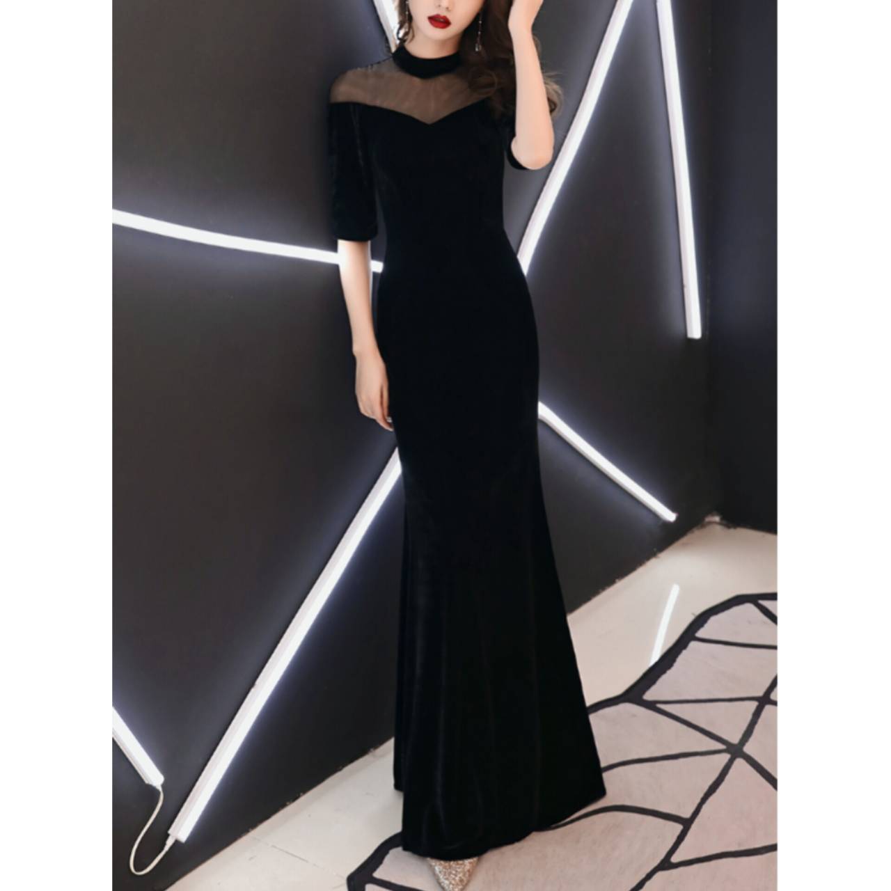 ベルベット ドレス イブニングドレス 韓国ドレス ハイネック 5分袖 首元シースルー ハイウエスト マーメイド ロング ブラック XS/3XL 韓国【K3328】