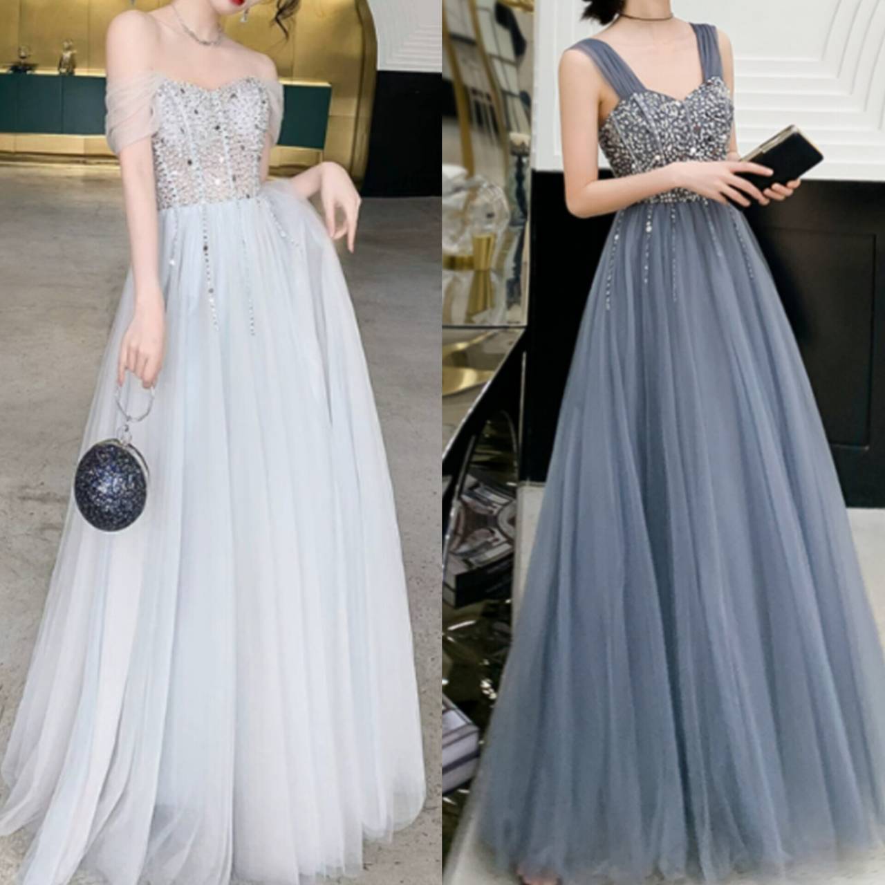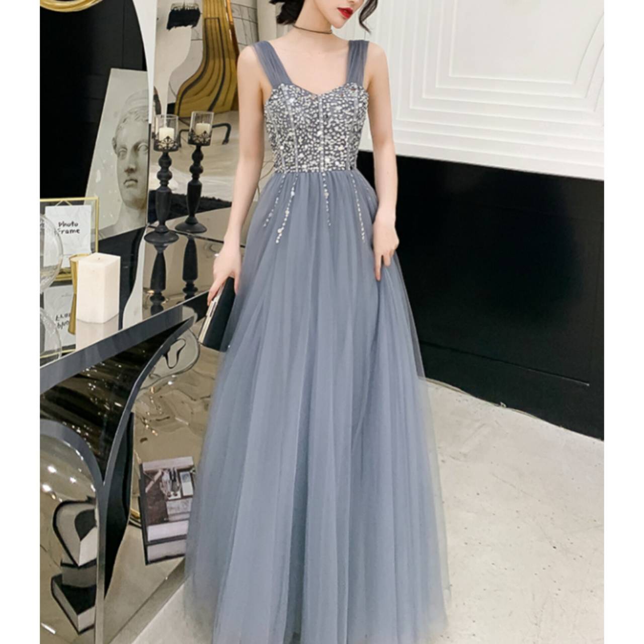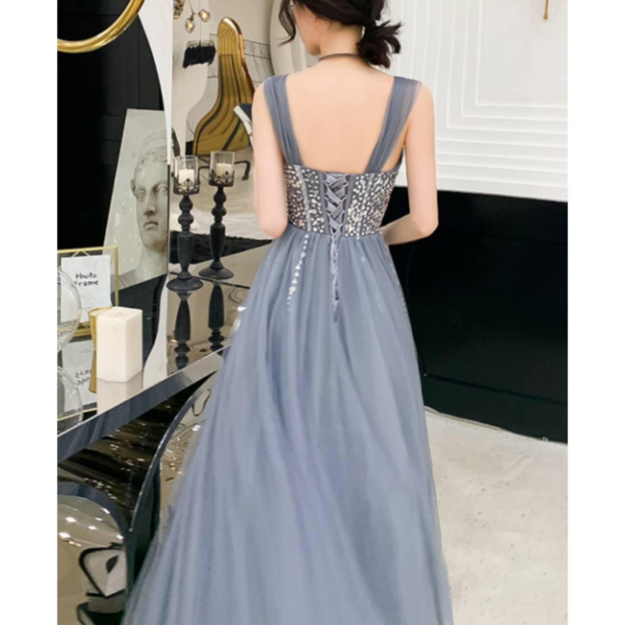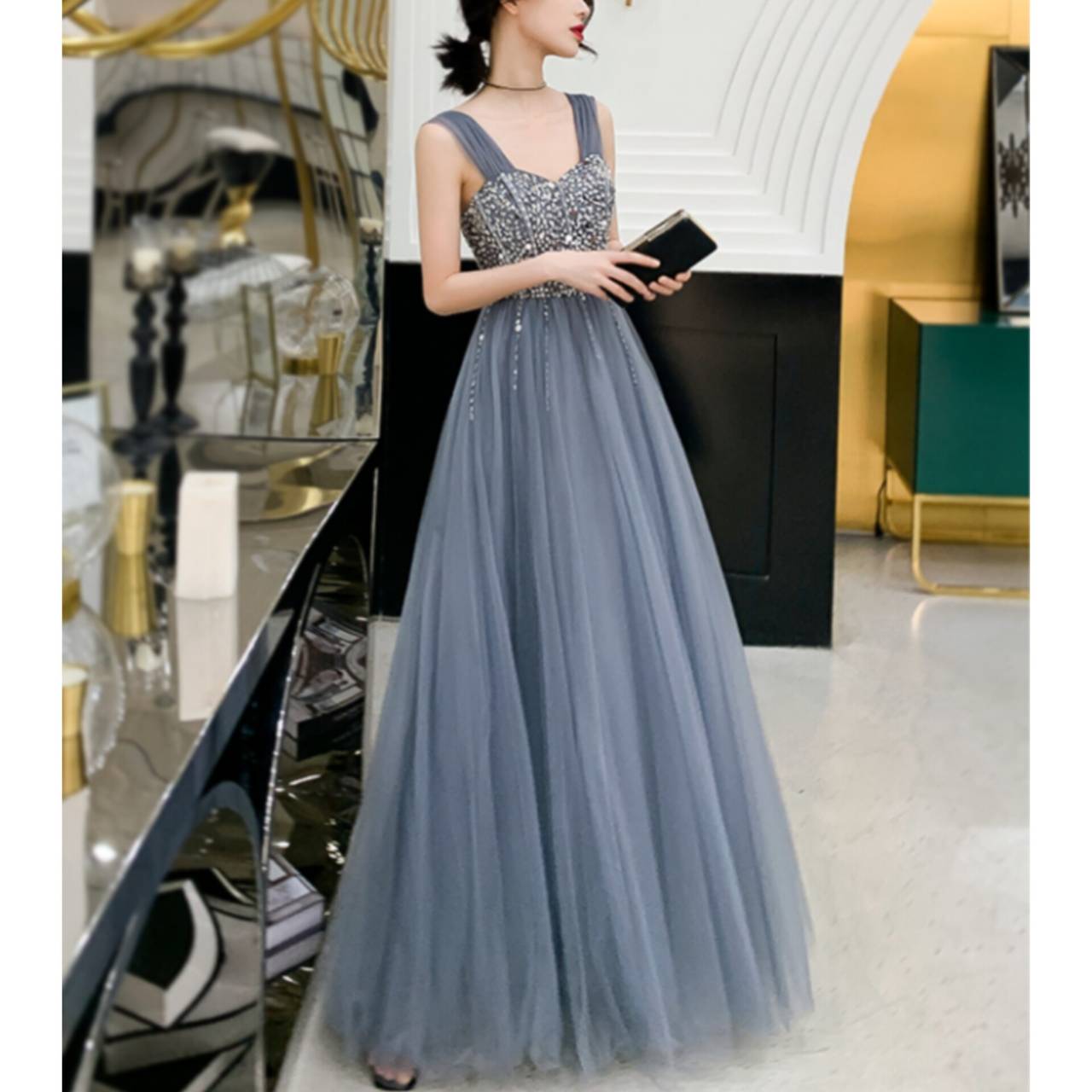 全2色 ドレス イブニングドレス 韓国ドレス 2way ノースリーブ オフショルダー ビジュー キラキラ ハイウエスト レースアップ Aライン フレア チュール オーガンジー シアー 淡色 XS/2XL 韓国【K1425】