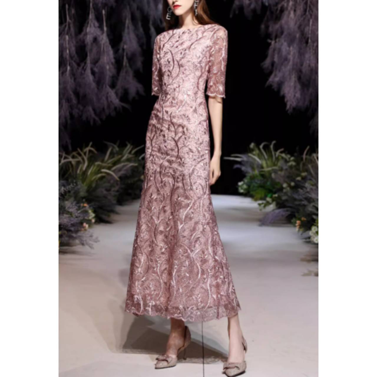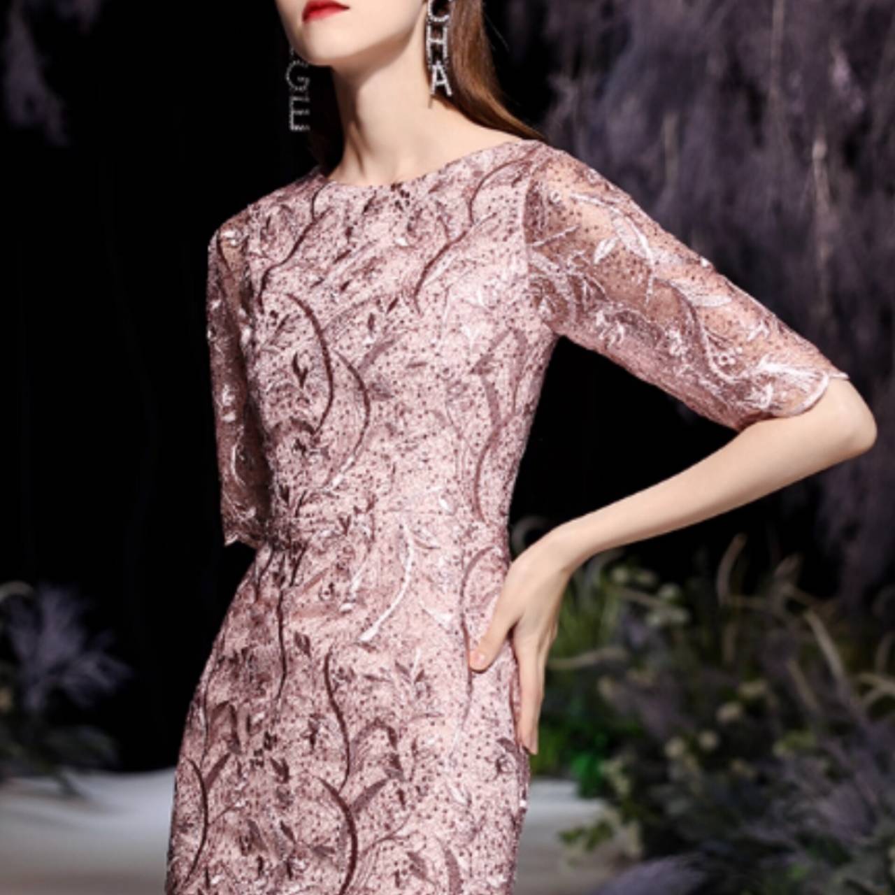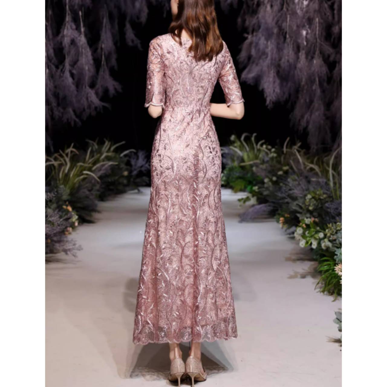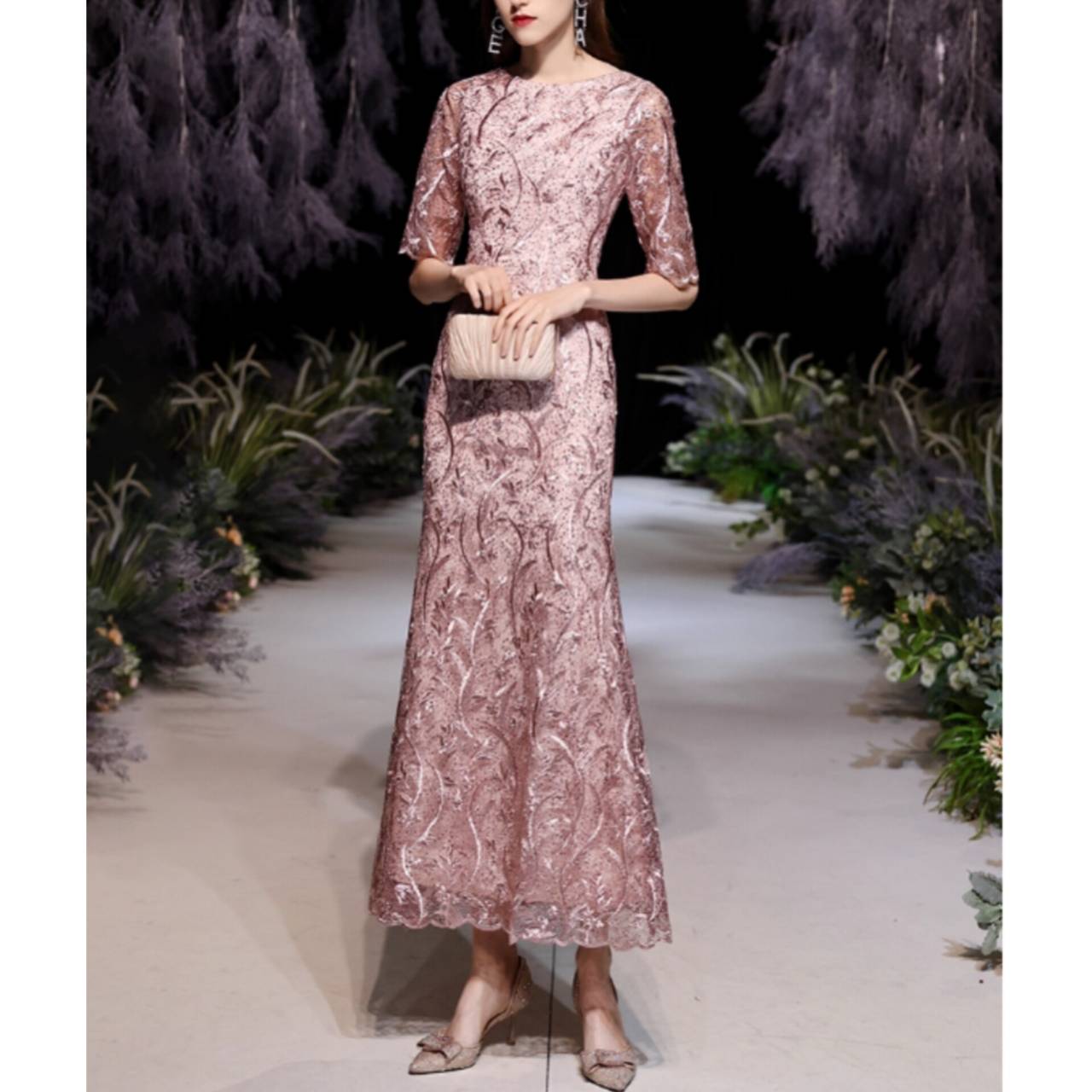 厳選された上質レースに繊細な刺繍と煌めきを散りばめ、まるで宝石を纏ったかのようなラグジュアリーな存在感を放つ一着。程よい透け感のある五分袖は気になる二の腕を美しくカバーし、ウエストラインを引き締めつつ、裾にかけて流れるように広がるシルエットが脚を長く魅せます。見る人の視線を集める堂々たるデザインは、まさにフォーマルシーンの主役にふさわしい装い。カラーは優美なライトピンクと、華麗で格調高いワインレッドをご用意。サイズはXS〜2XLと幅広く対応し、あなたの体型に寄り添う美しいフィット感を実現します。