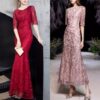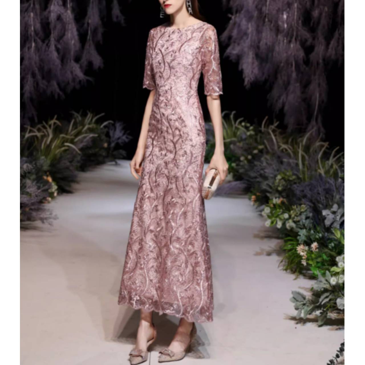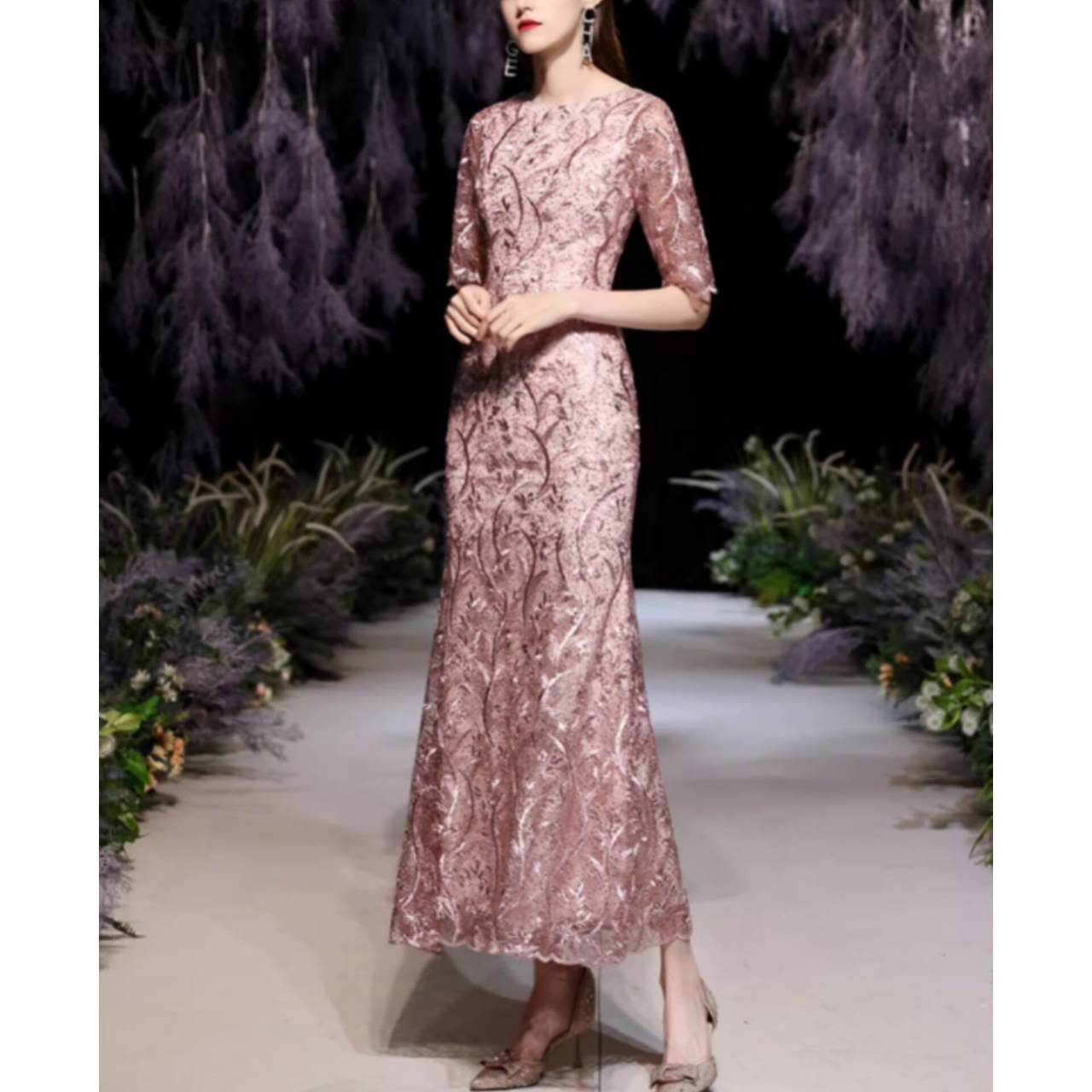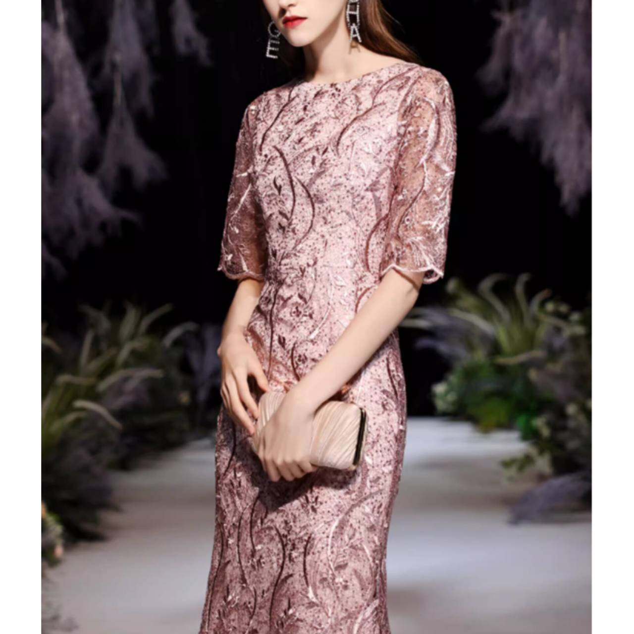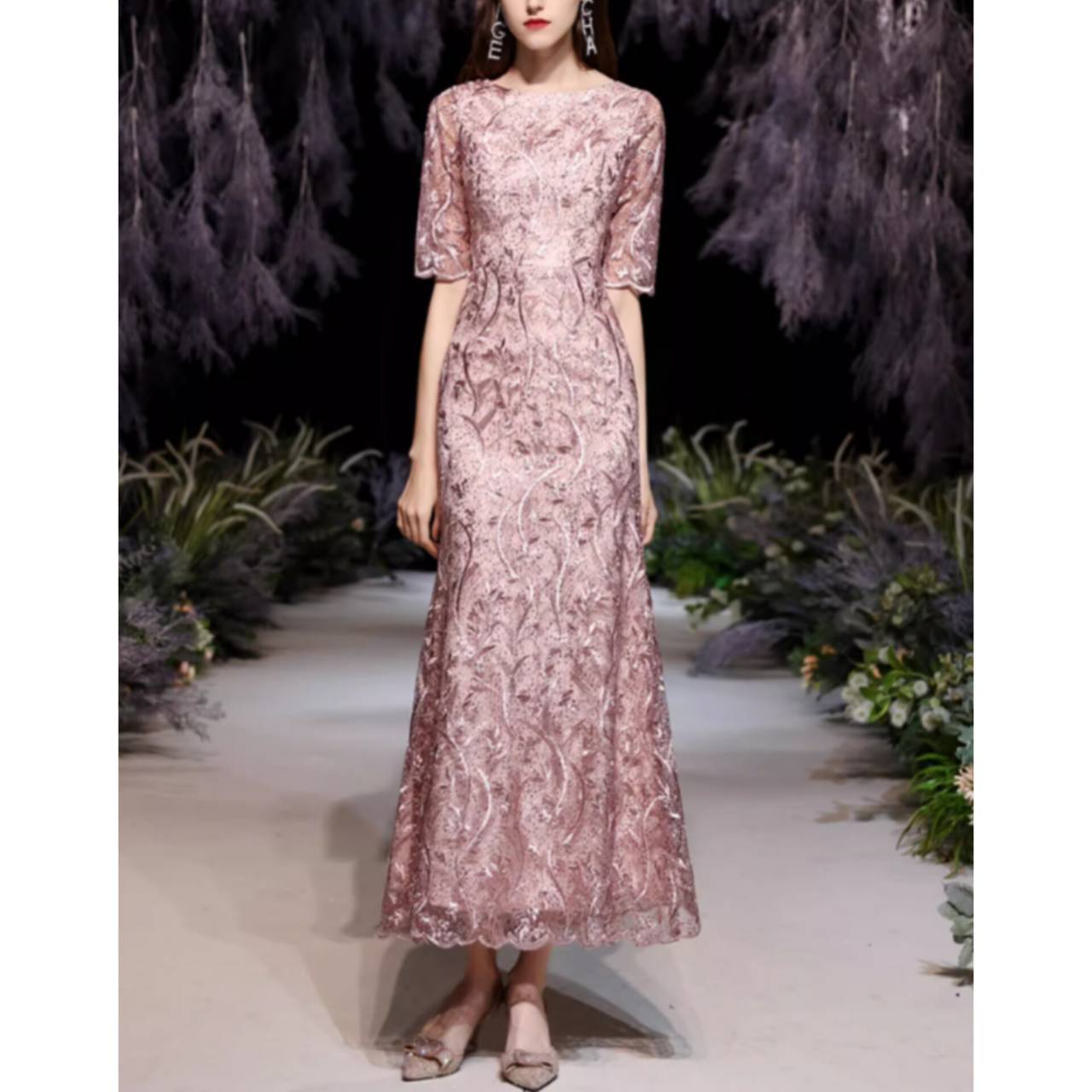 厳選された上質レースに繊細な刺繍と煌めきを散りばめ、まるで宝石を纏ったかのようなラグジュアリーな存在感を放つ一着。程よい透け感のある五分袖は気になる二の腕を美しくカバーし、ウエストラインを引き締めつつ、裾にかけて流れるように広がるシルエットが脚を長く魅せます。見る人の視線を集める堂々たるデザインは、まさにフォーマルシーンの主役にふさわしい装い。カラーは優美なライトピンクと、華麗で格調高いワインレッドをご用意。サイズはXS〜2XLと幅広く対応し、あなたの体型に寄り添う美しいフィット感を実現します。