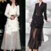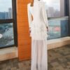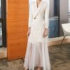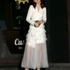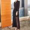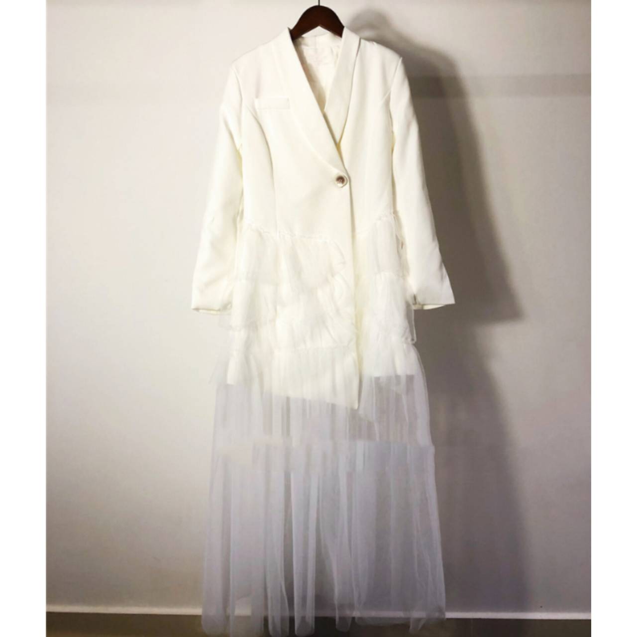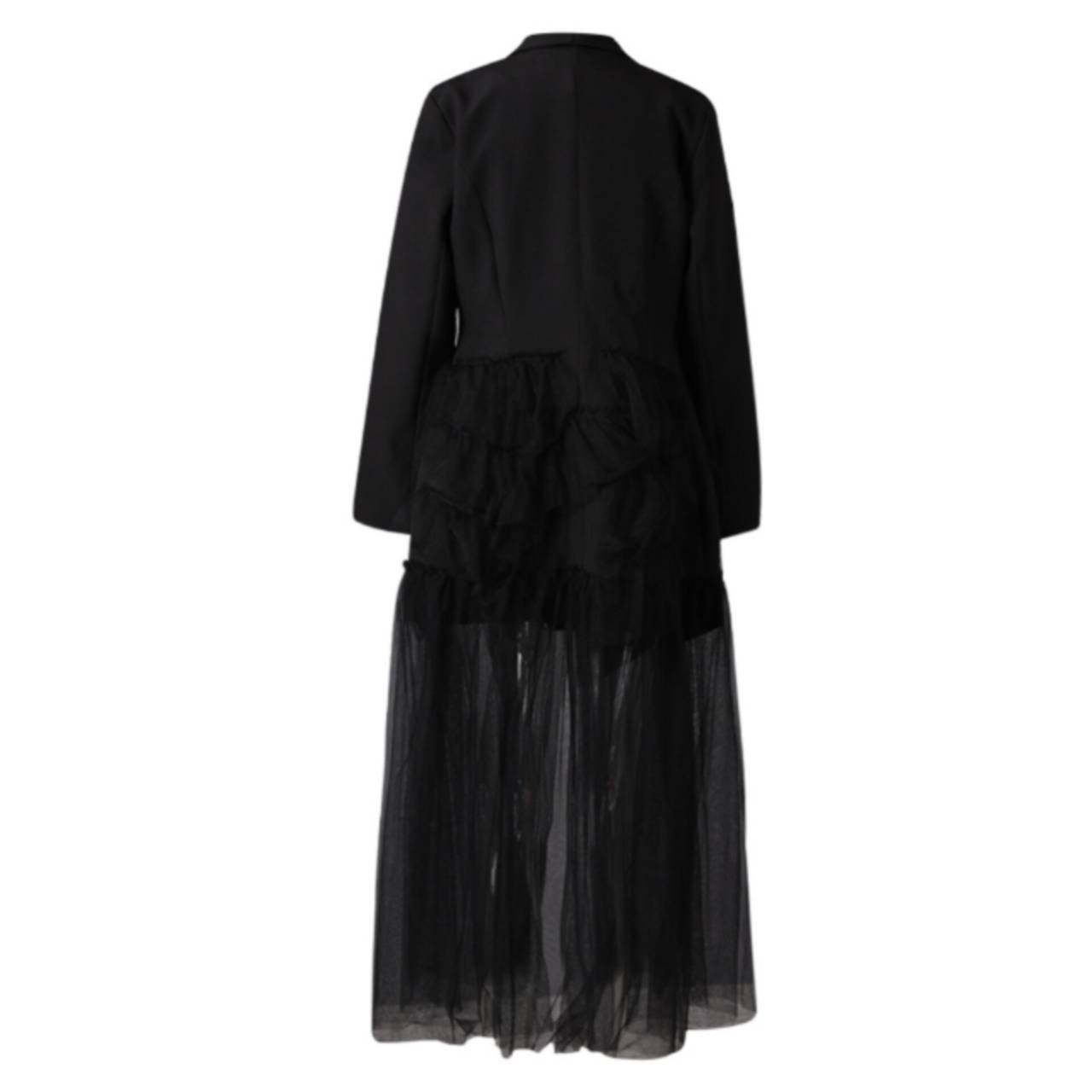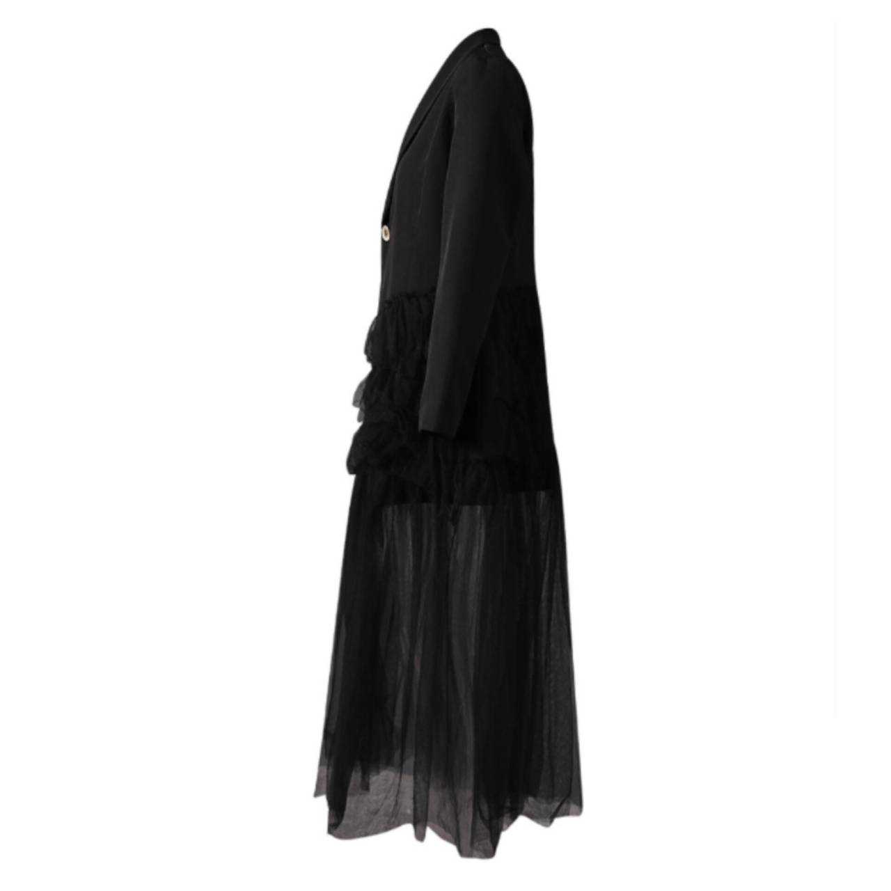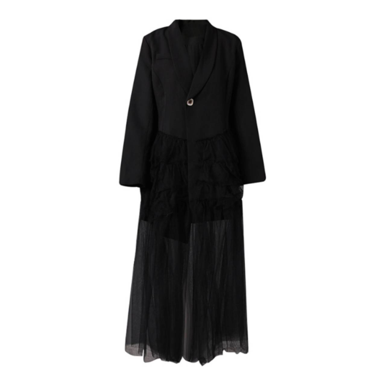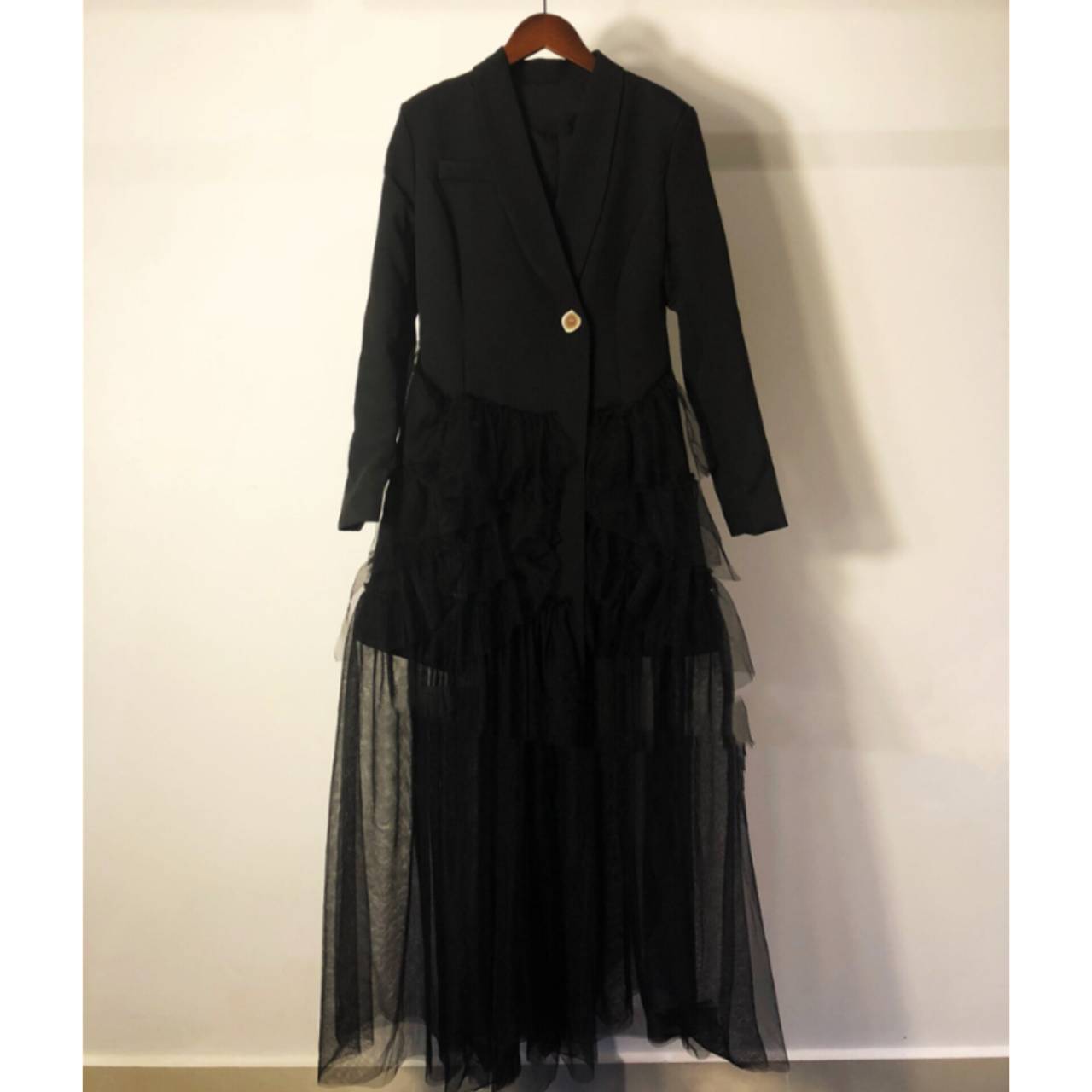 全2色 ドレス イブニングドレス 韓国ドレス コンボドレス 長袖 ジャケット風 深Vネック フロントボタン ハイウエスト ティアード Aライン ロング シアー フリル チュール S/XL 韓国【K4401】