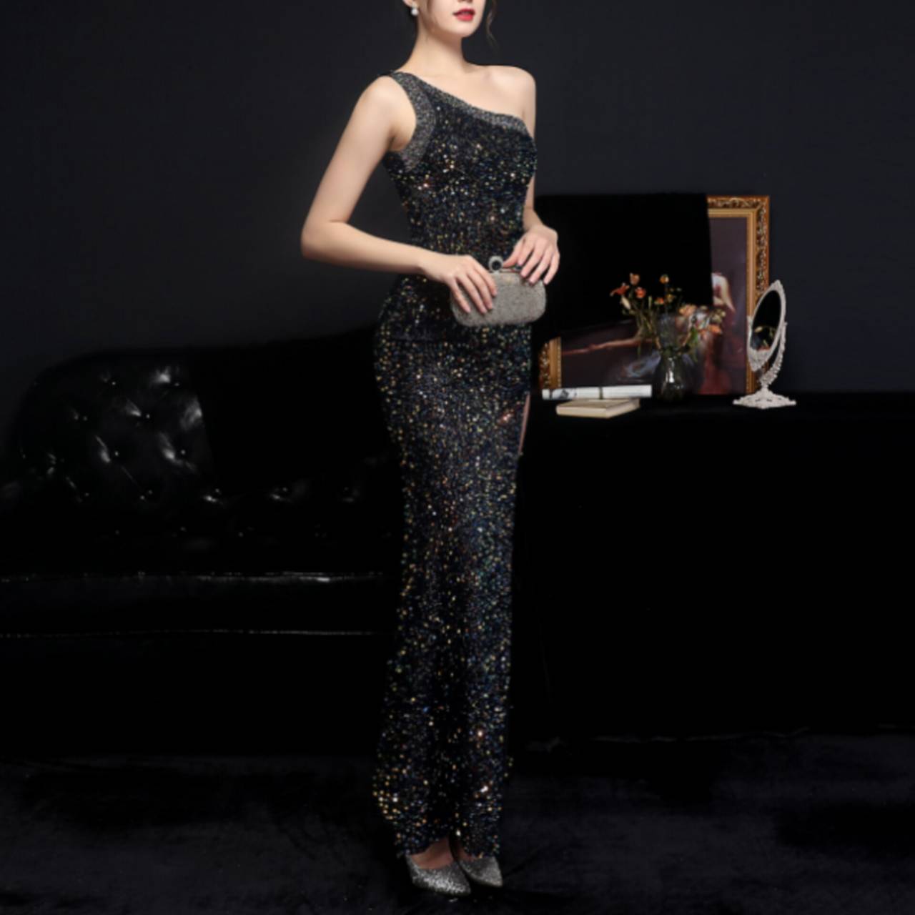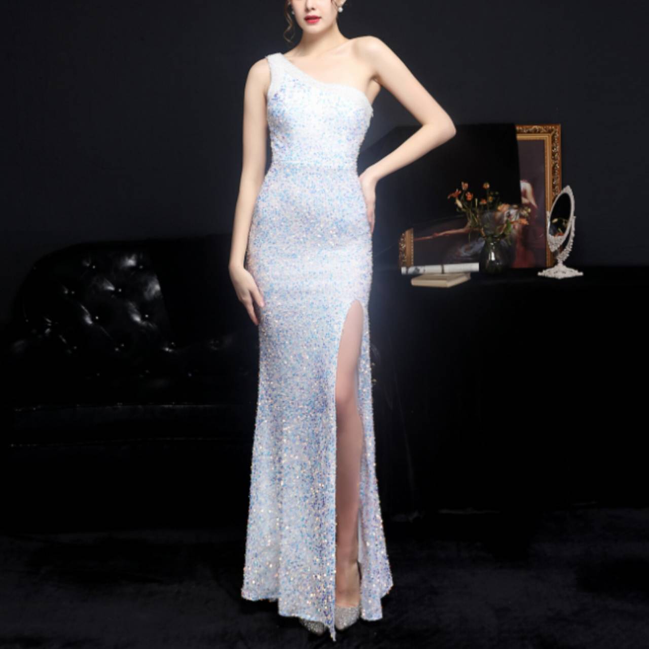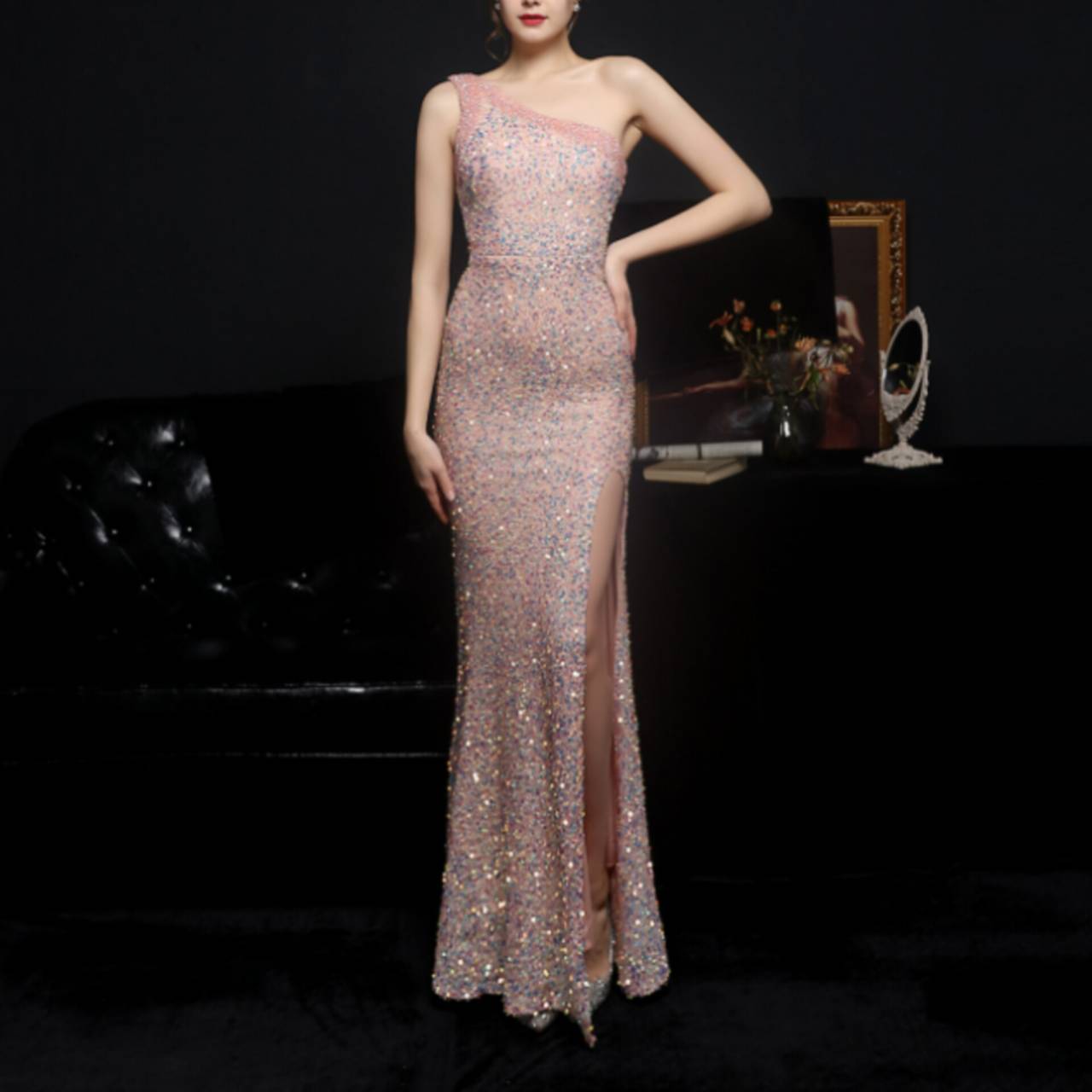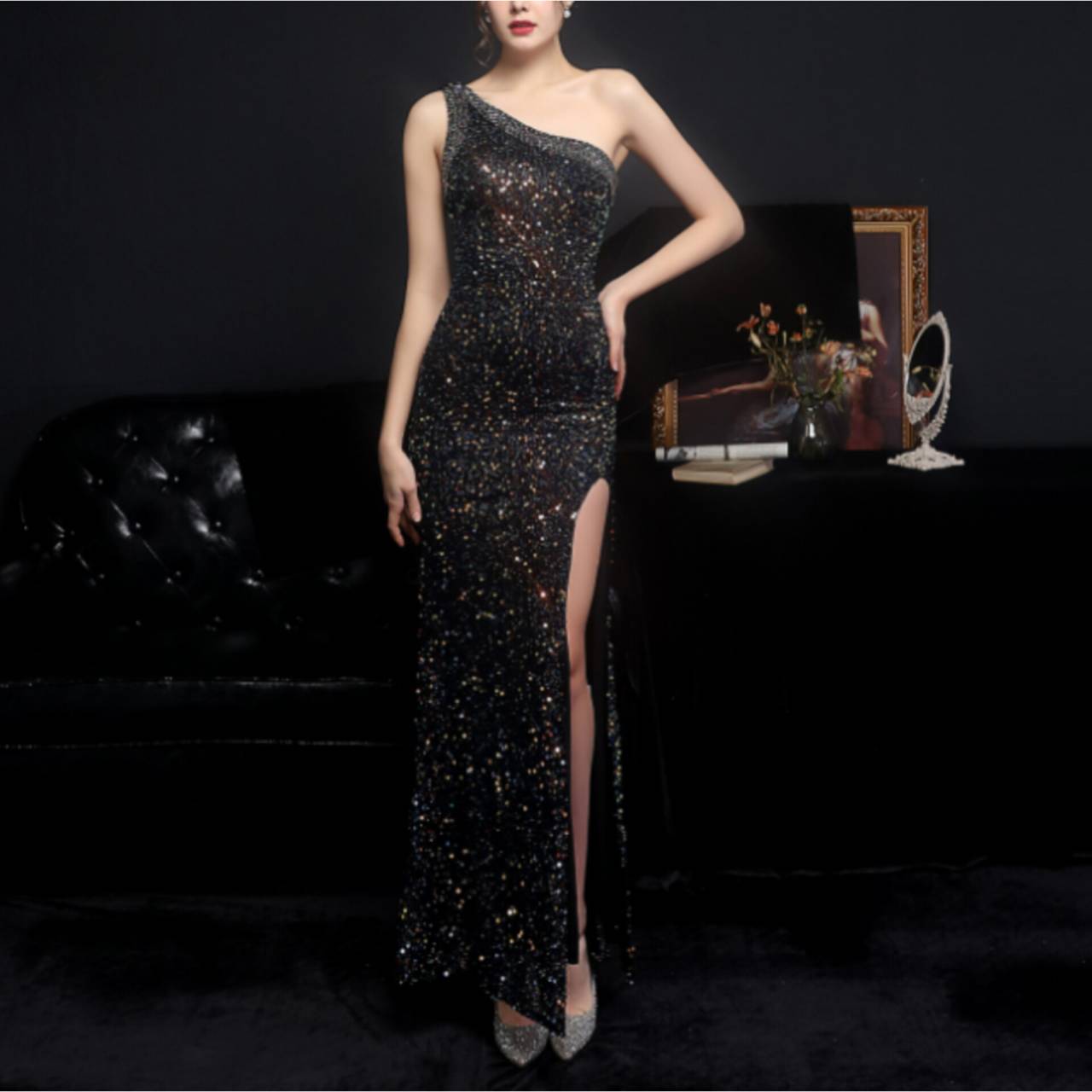 全5色 ドレス イブニングドレス 韓国ドレス キラキラ スパンコール ワンショルダー ハイウエスト マーメイド ハイスリット ロング 美脚効果 グリッター S/2XL 韓国【B5520】