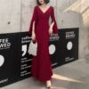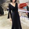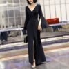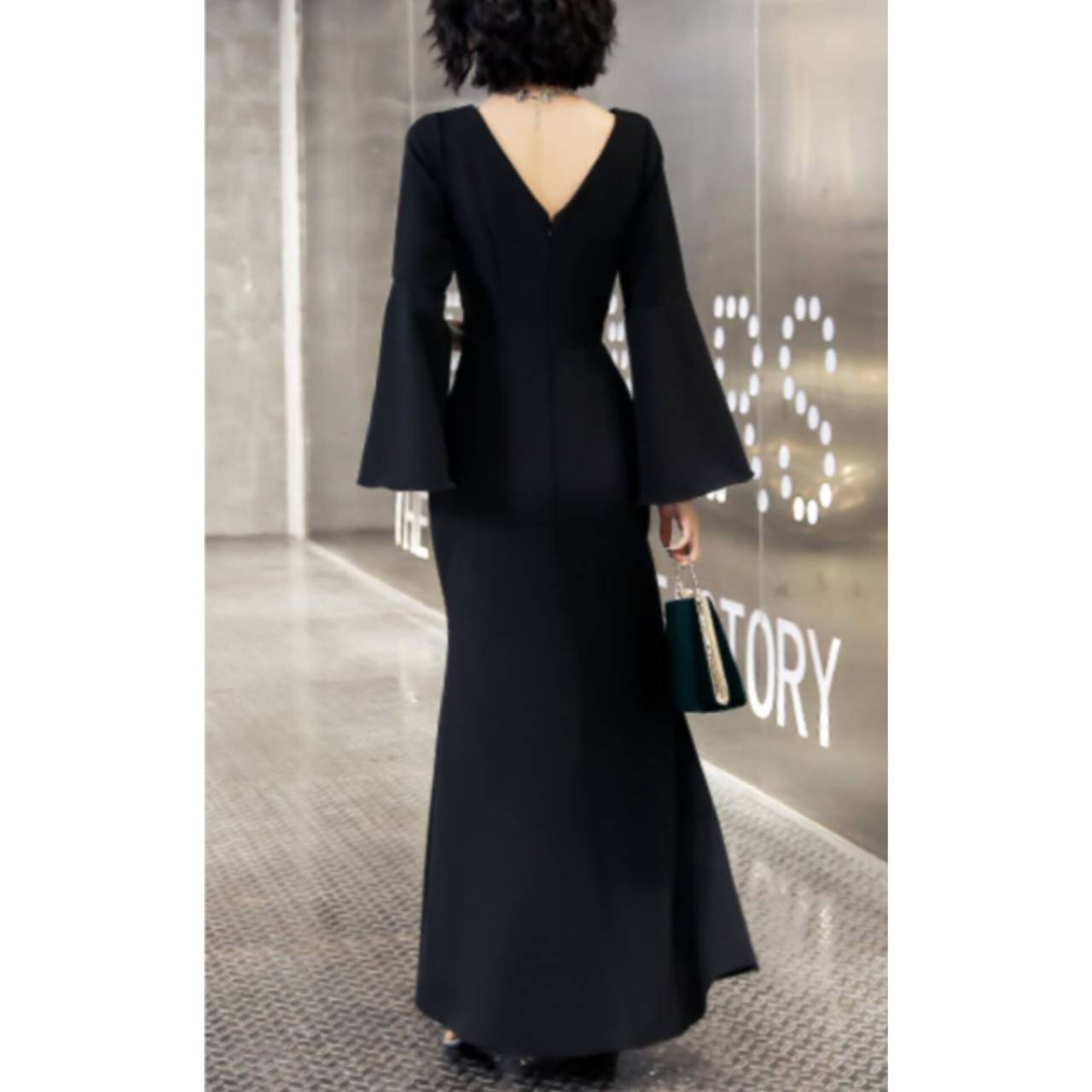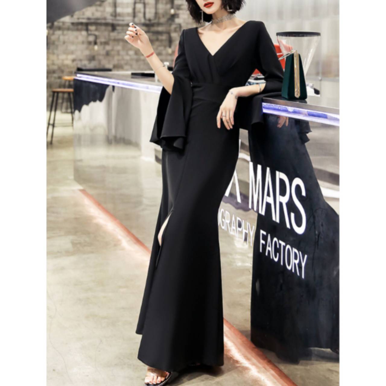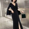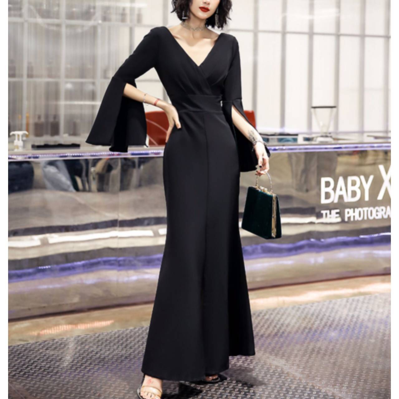全2色 ドレス イブニングドレス 韓国ドレス スリットスリーブ 長袖 ベルスリーブ 深Vネック ハイウエスト ウエストマーク タック入り マーメイド フロントスリット ロング 美脚効果 スタイルアップ XS/3XL 韓国 【B5067】