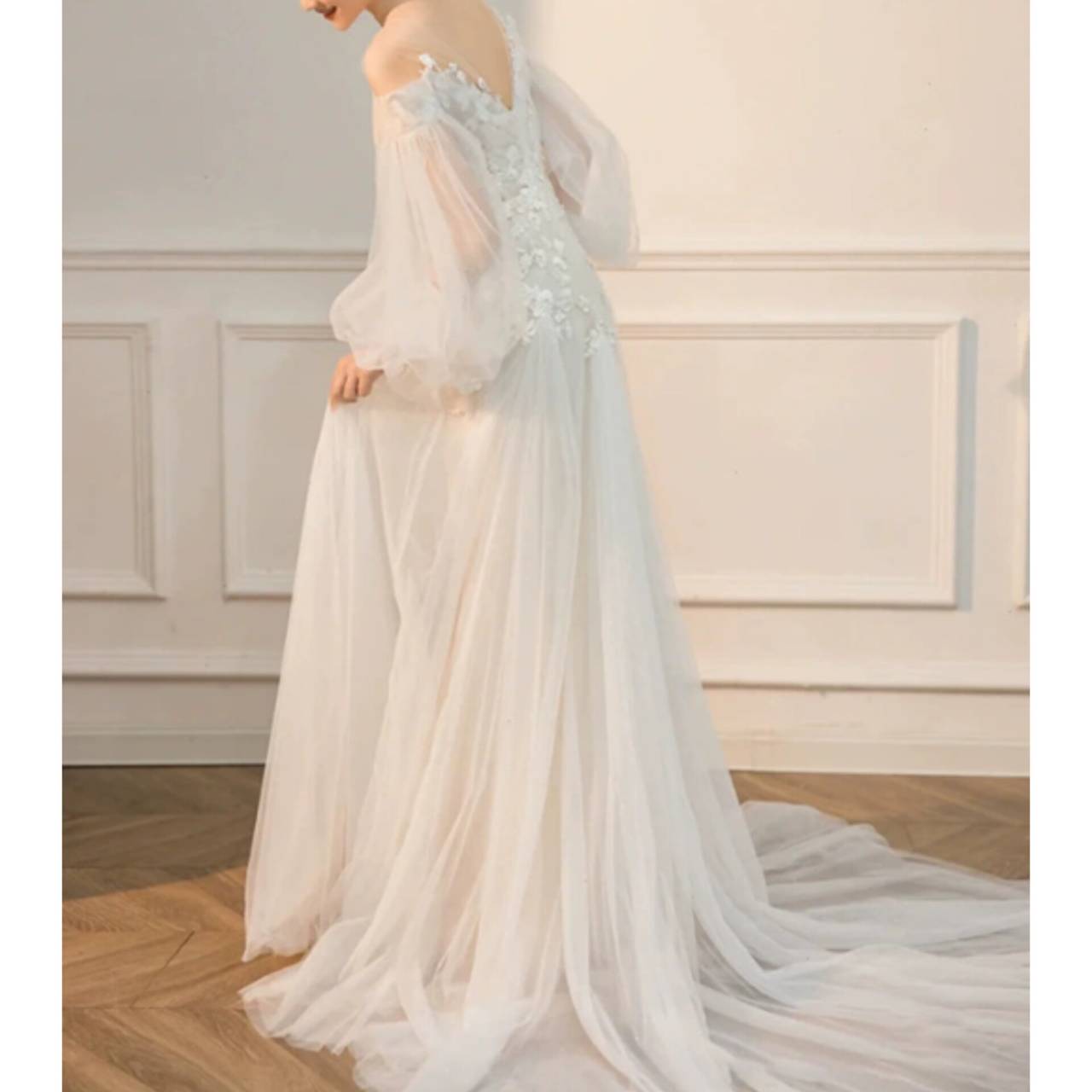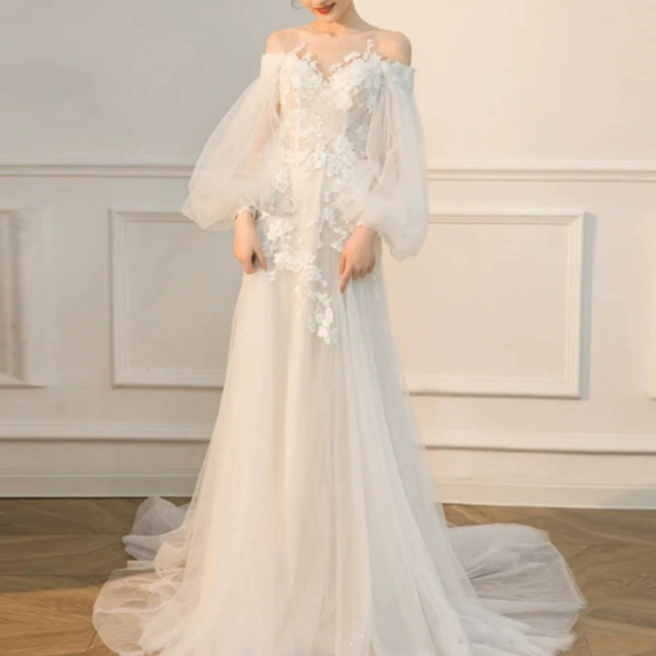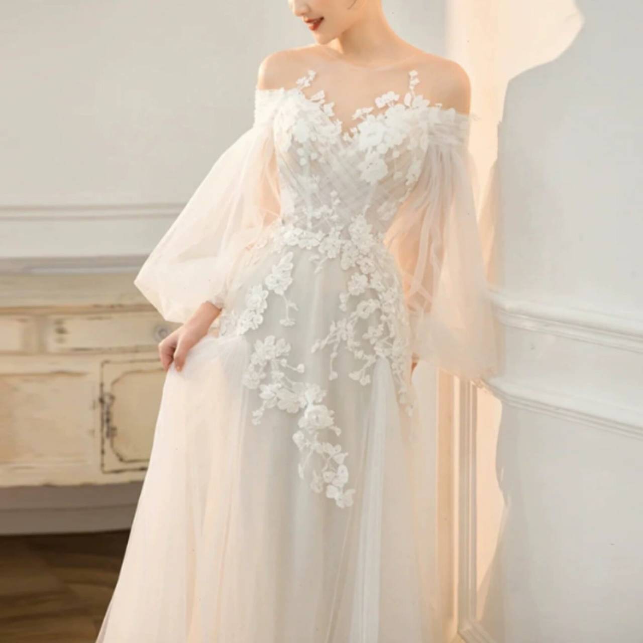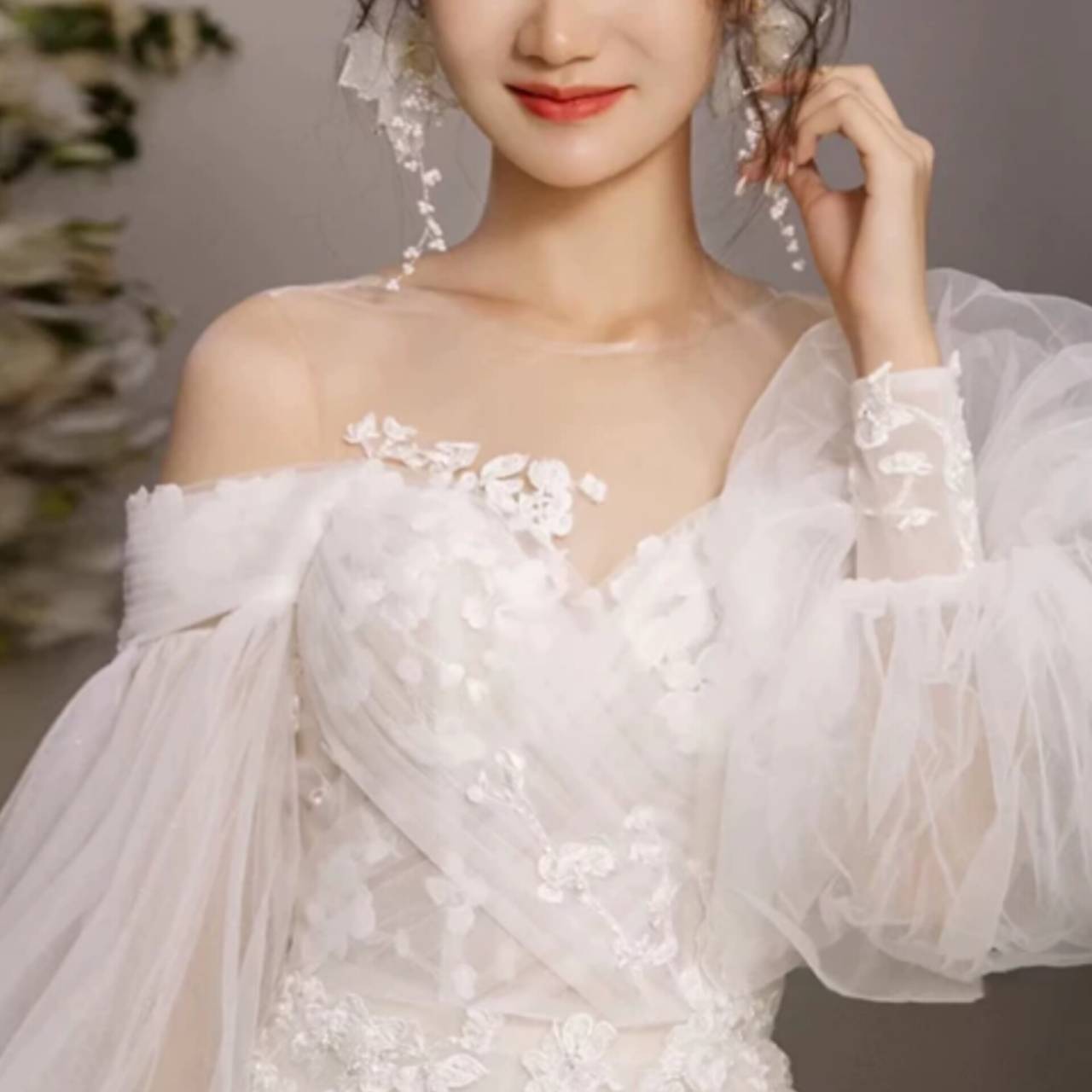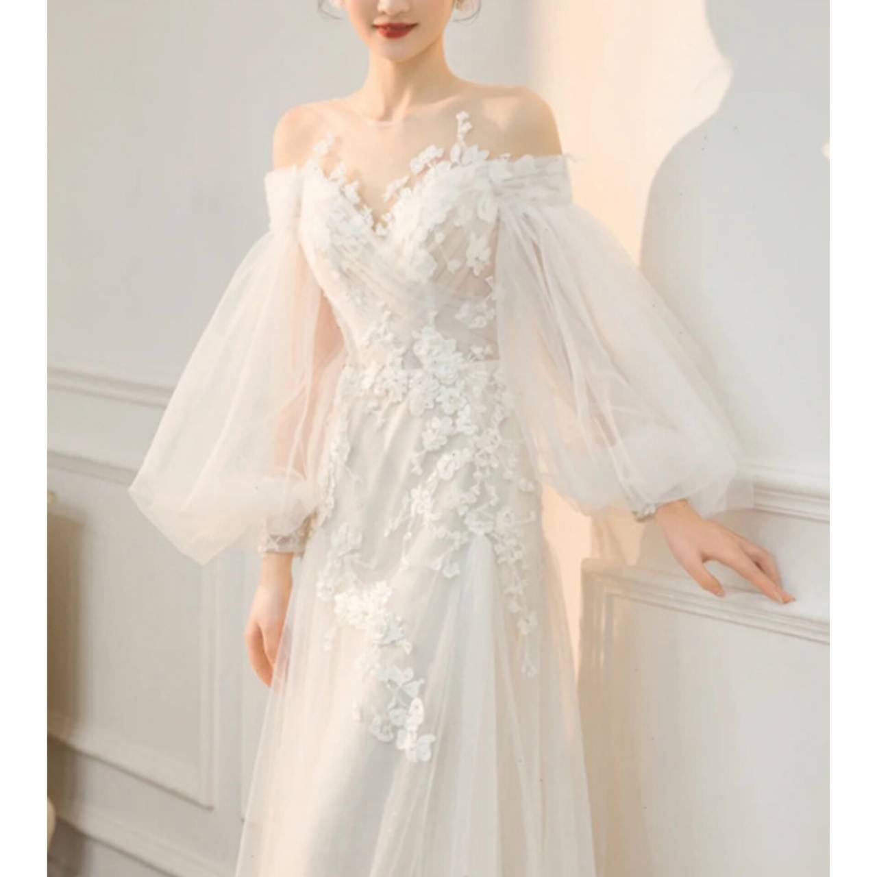 オフショルダー風 ウェディングドレス 韓国ドレス お花 花柄 刺繍 レース クルーネック シアー 首元シースルー 長袖 ロングスリーブ ボリューム袖 ぽわん袖 オーガンジー クロスデザイン ハイウエスト バックレス Aライン ロング フレア チュール エレガント フェアリー XS/2XL 韓国【K5624】