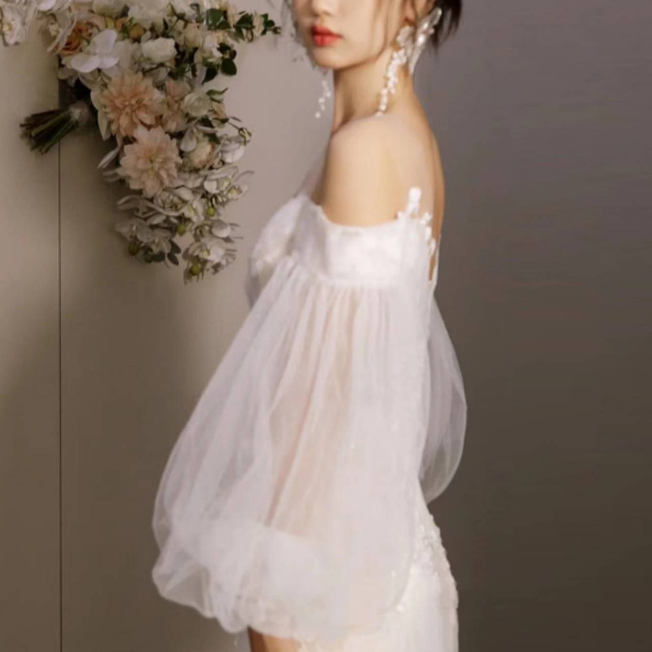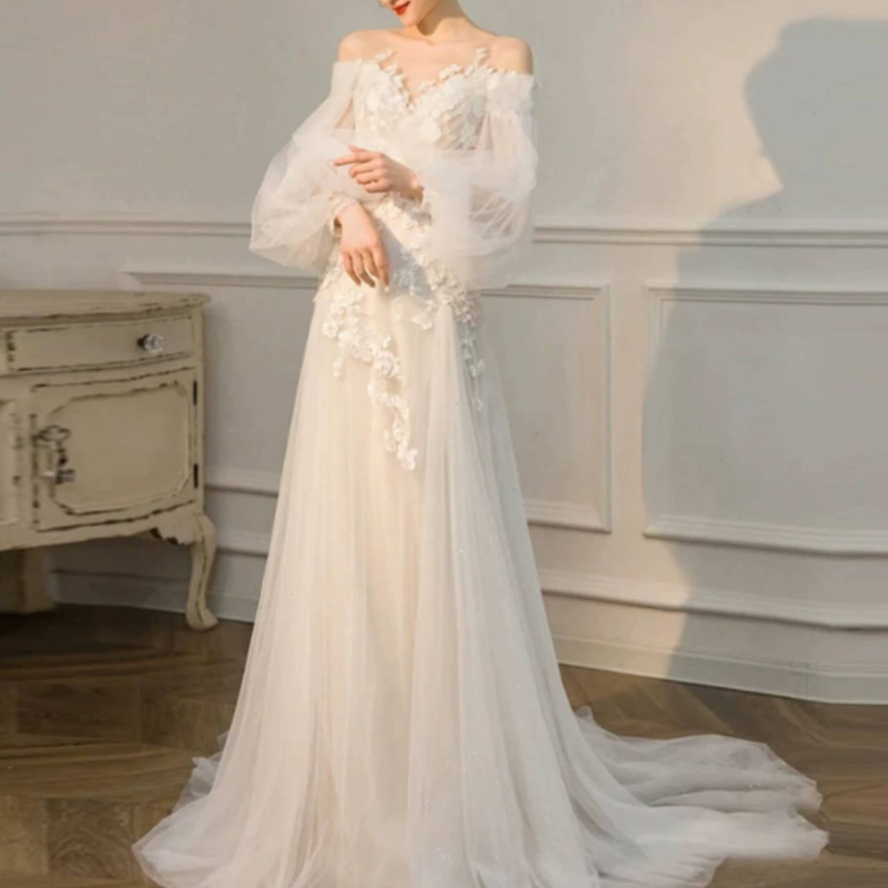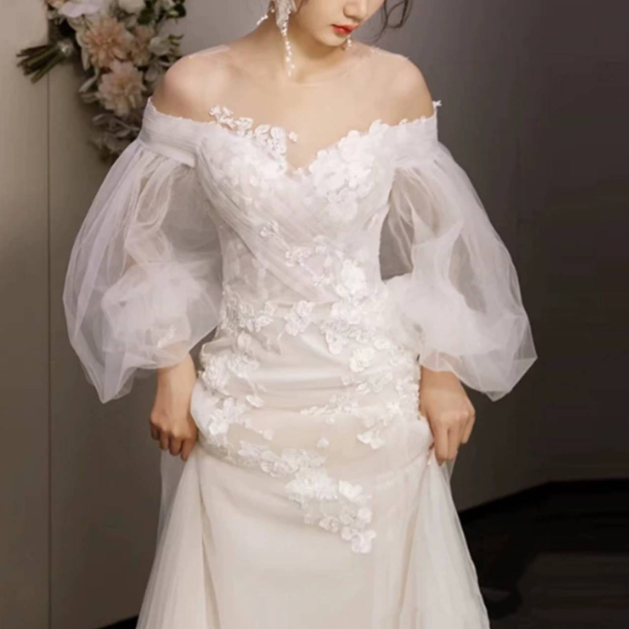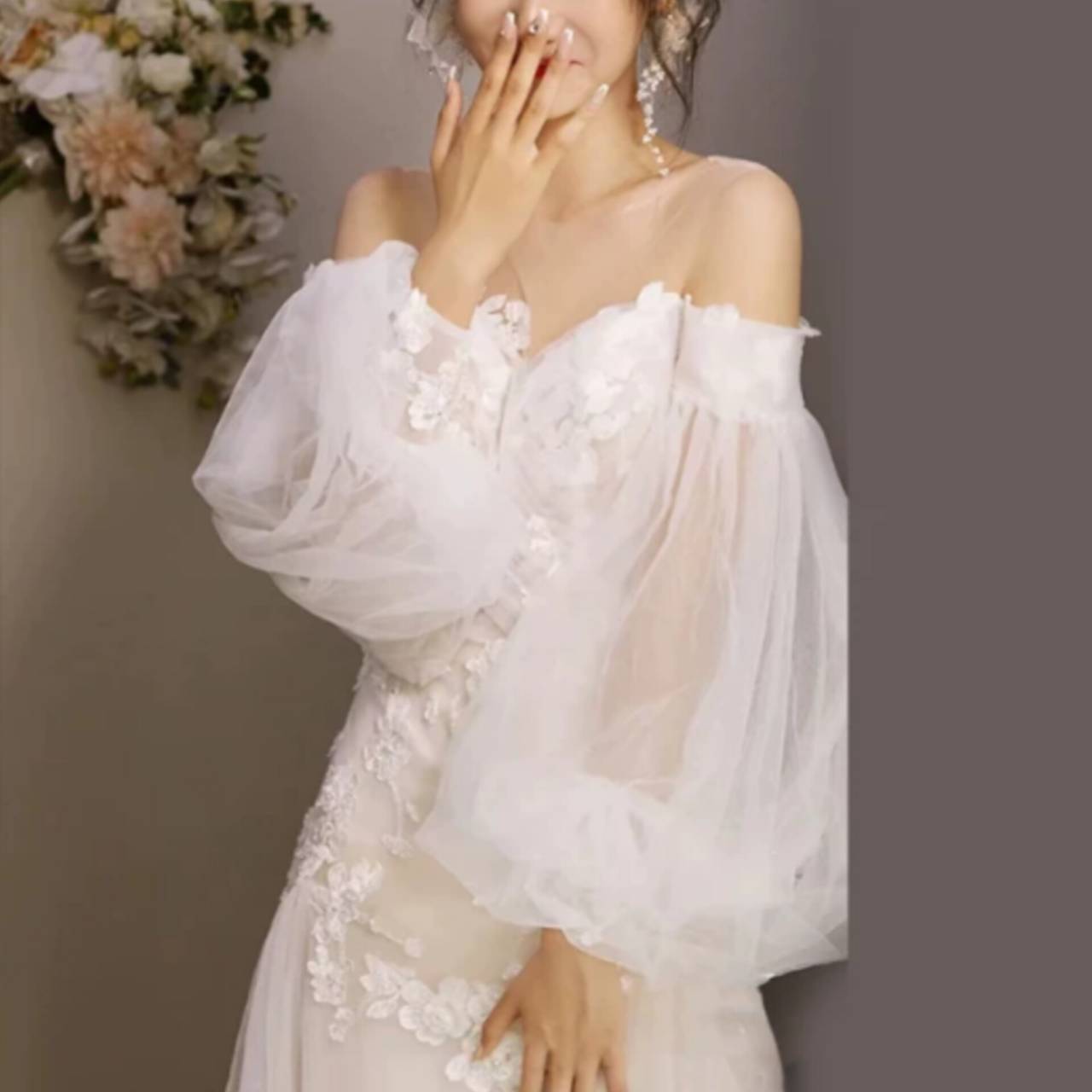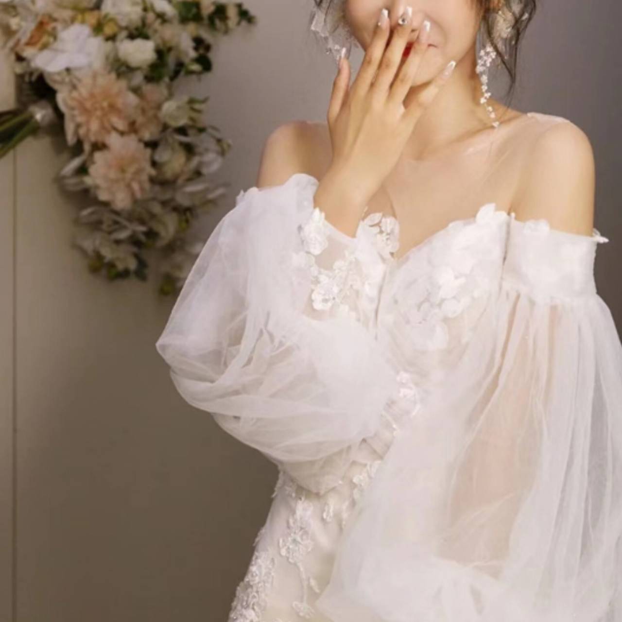 オフショルダー風 ウェディングドレス 韓国ドレス お花 花柄 刺繍 レース クルーネック シアー 首元シースルー 長袖 ロングスリーブ ボリューム袖 ぽわん袖 オーガンジー クロスデザイン ハイウエスト バックレス Aライン ロング フレア チュール エレガント フェアリー XS/2XL 韓国【K5624】
