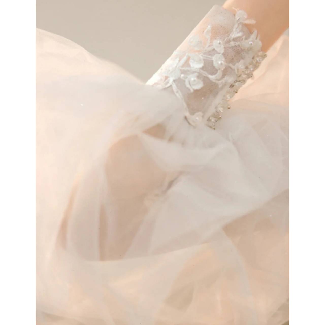 歩くたびに揺れるチュールが視線を惹きつけ、ゲストの記憶に深く残る花嫁姿を叶えます。