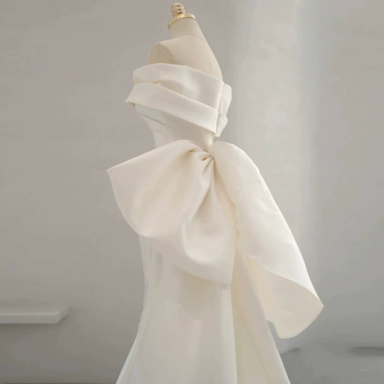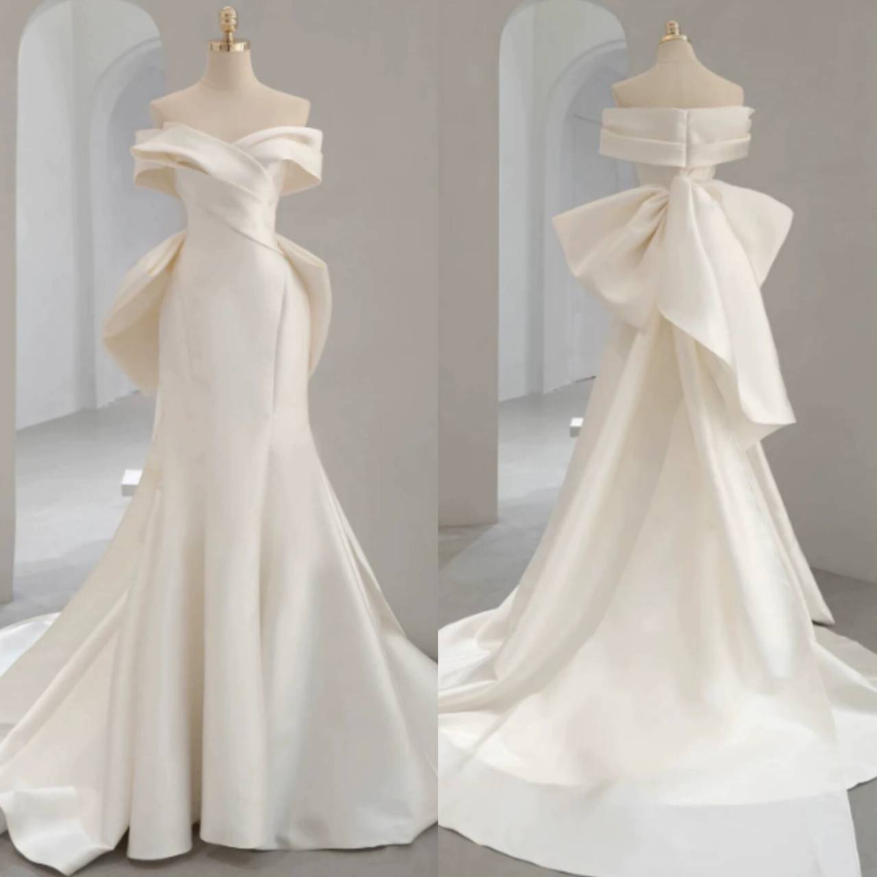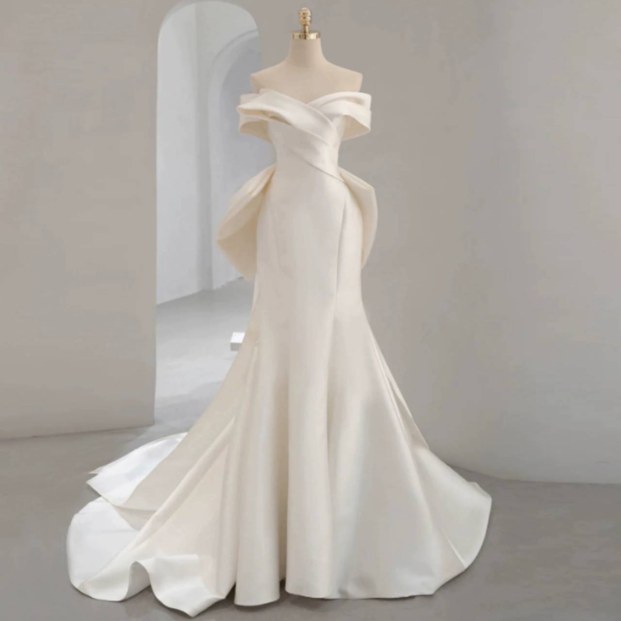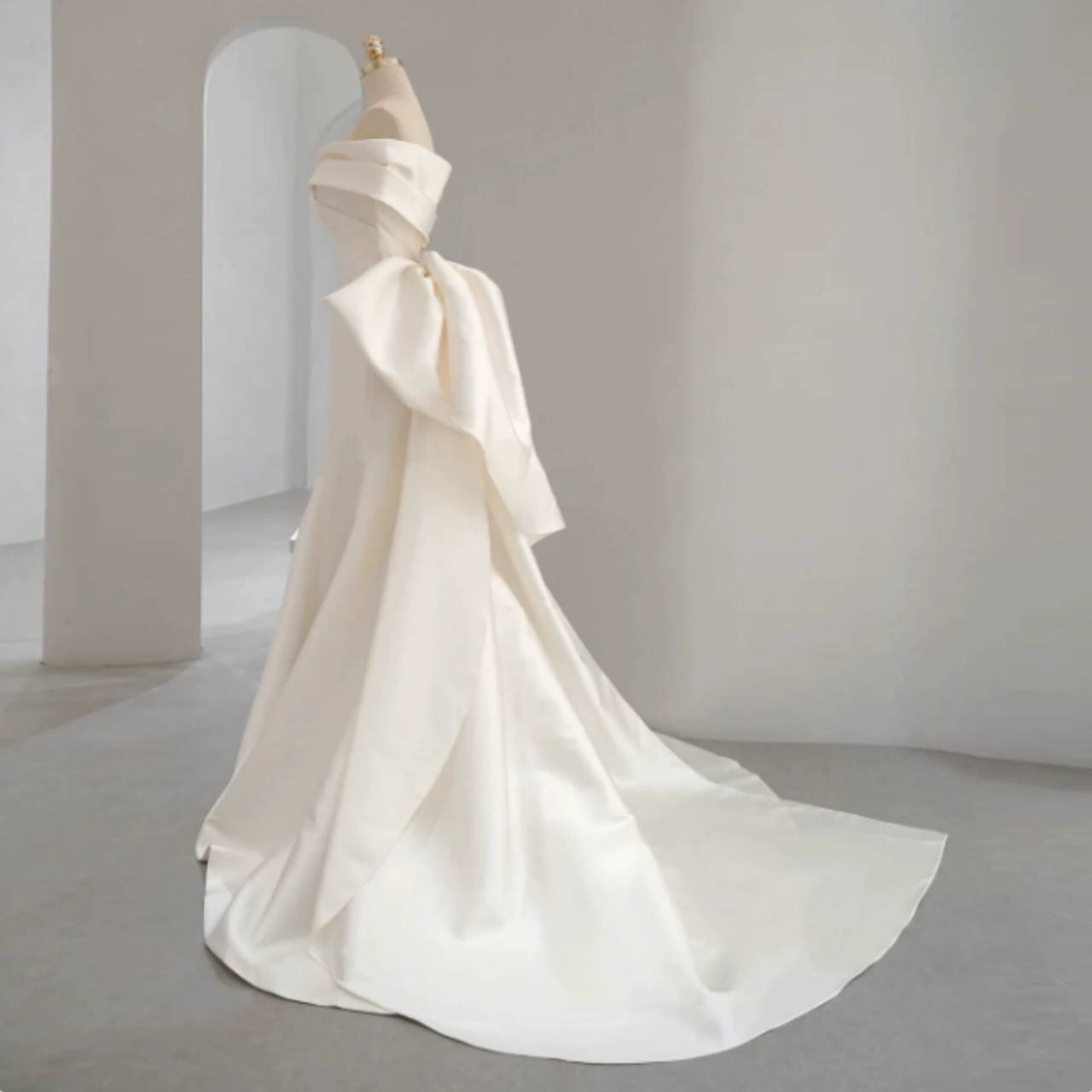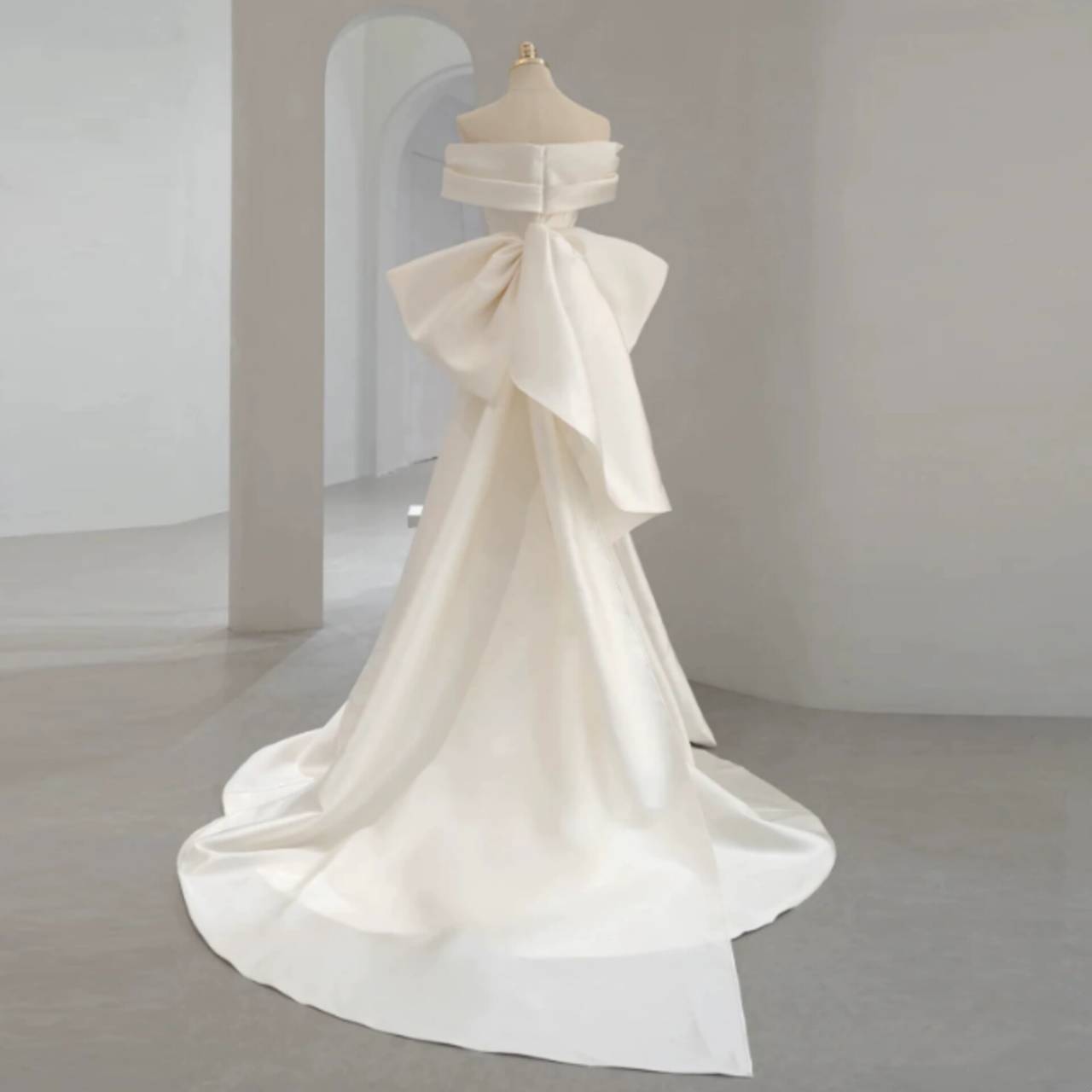 一目で“特別な花嫁”だと伝わる、洗練のオフショルダーウェディングドレス。上質な高級サテン素材を贅沢に使用した、ミニマルでありながら圧倒的な存在感を放つウェディングドレス。