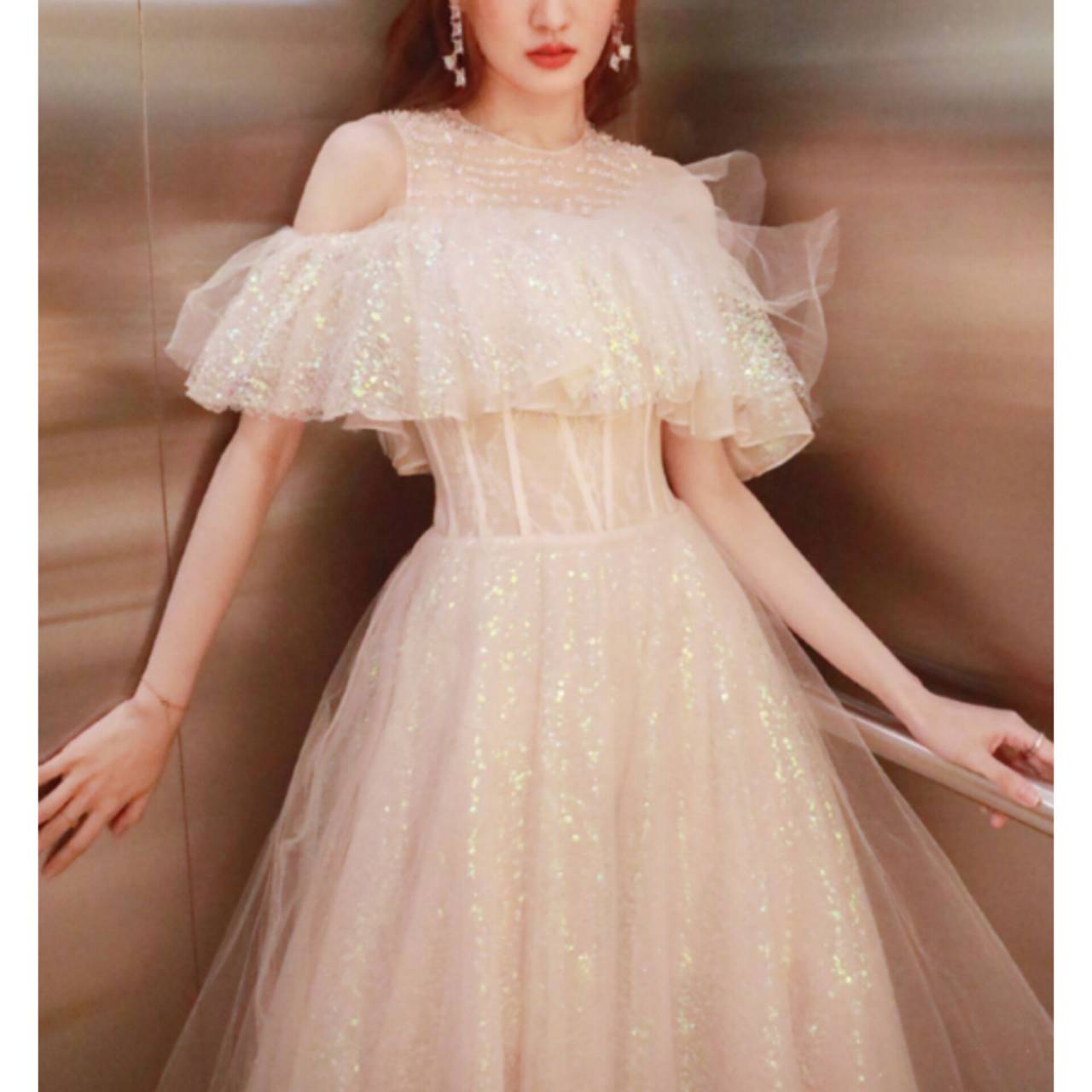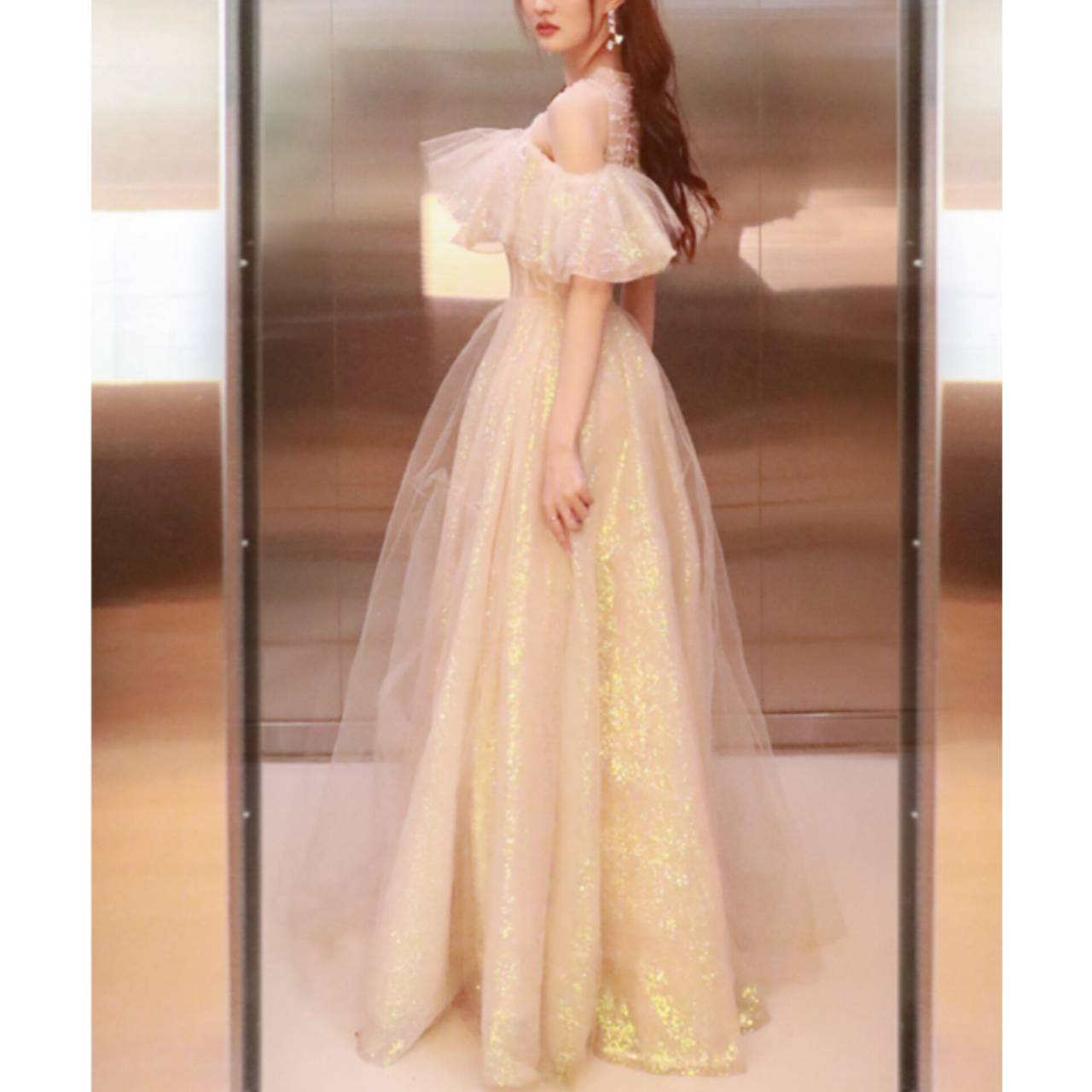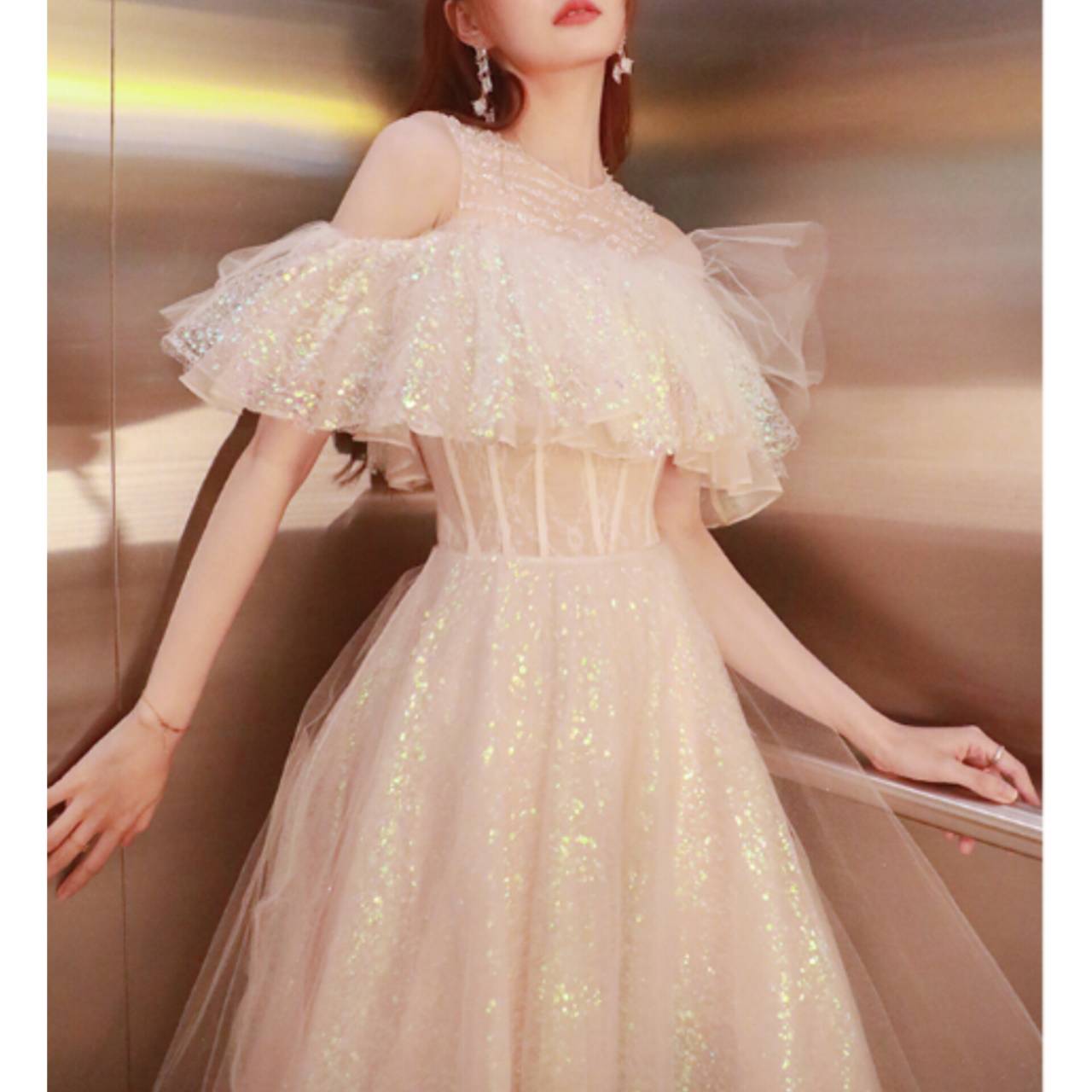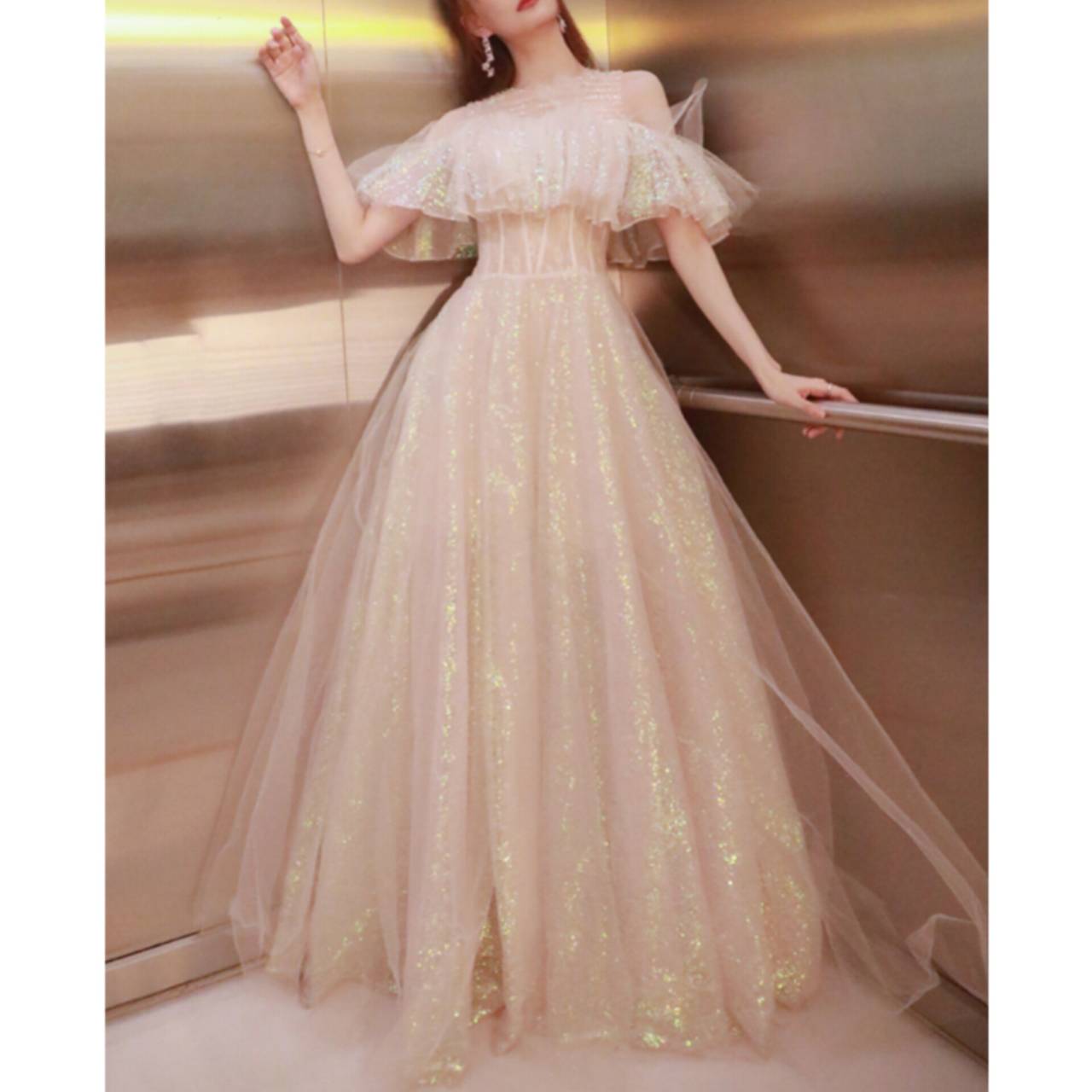 オープンショルダー ドレス イブニングドレス 韓国ドレス フリルスリーブ ビジュー キラキラ クルーネック シアー ラメ ハイウエスト Aライン フレア チュール グリッター XS/3XL 韓国【B5857】