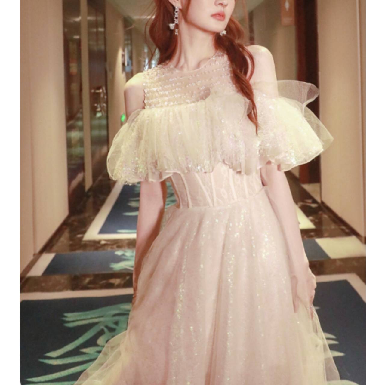 デコルテラインを美しく見せるシースルーデザインに、二の腕をふんわりカバーするオフショルダーのフリルをプラス。ウエストはコルセット風のシルエットで自然にくびれを演出し、足元に向かって広がるAラインが脚長効果を叶えます。カラーは上品なアイボリー。サイズ展開はXS〜3XLまで幅広く対応。照明の下で瞬くたび、視線を集める美しさ。パーティーや演奏会、フォーマルシーンで、まるで映画のヒロインのように輝ける一着です。上品さと華やかさを両立したデザインは、写真映えも抜群。