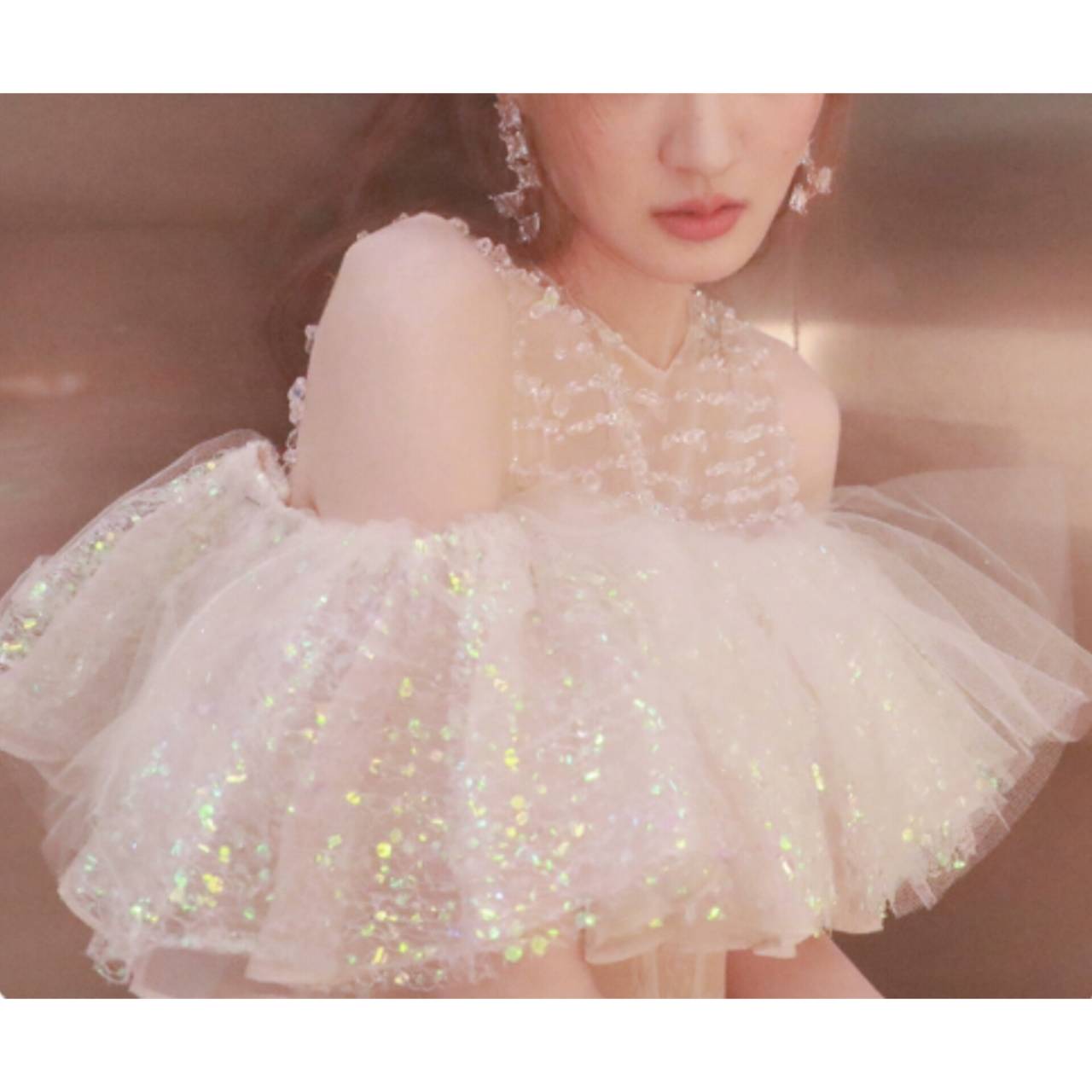 まるで星屑を閉じ込めたような幻想的チュールドレス。上質なスパンコールチュール素材を贅沢に重ね、角度によって虹色の輝きを放つラグジュアリードレス。