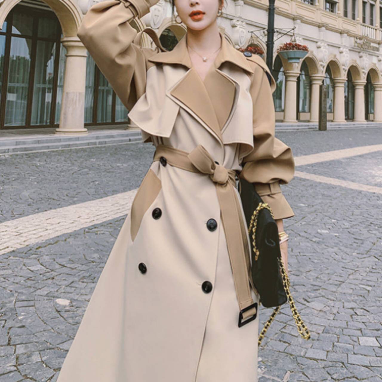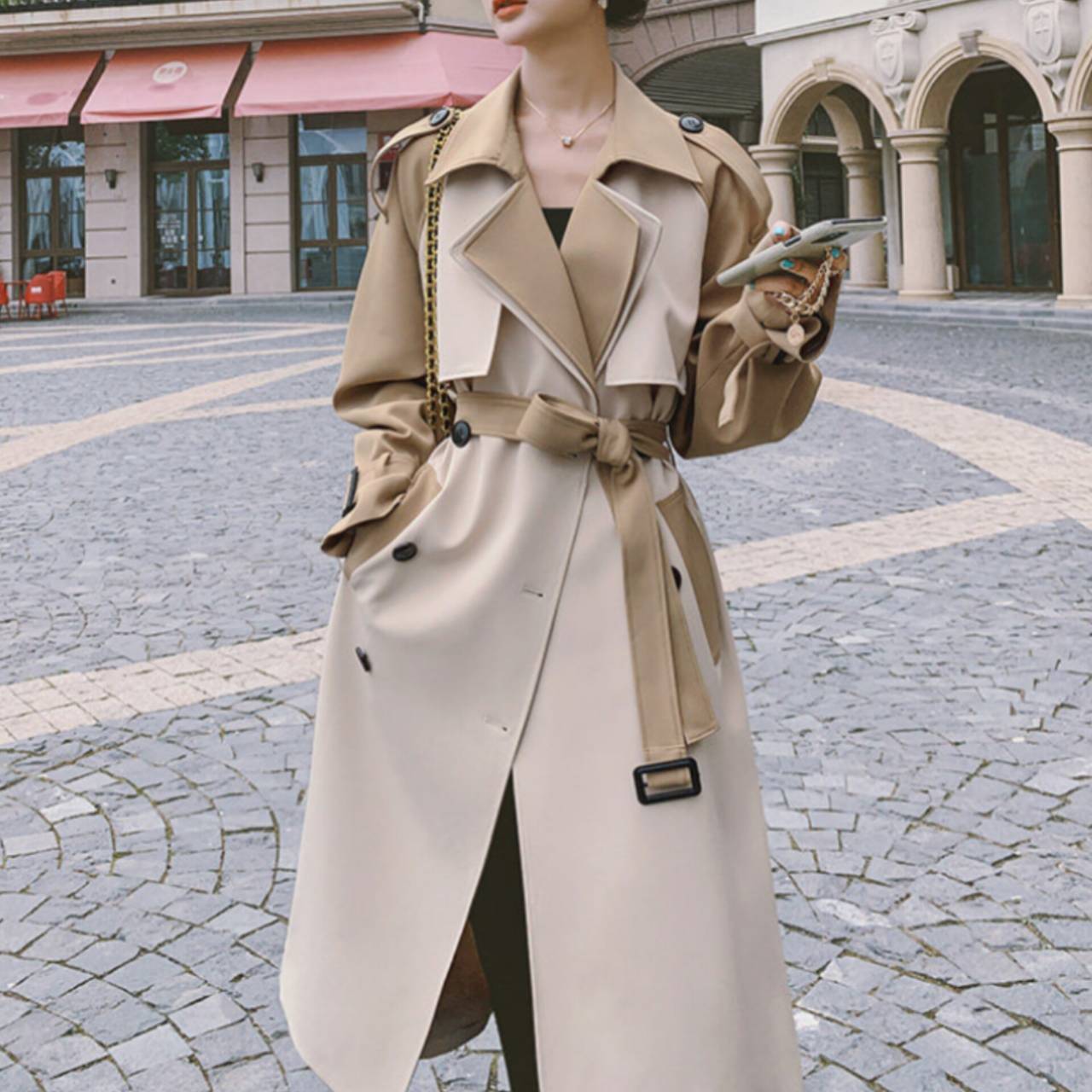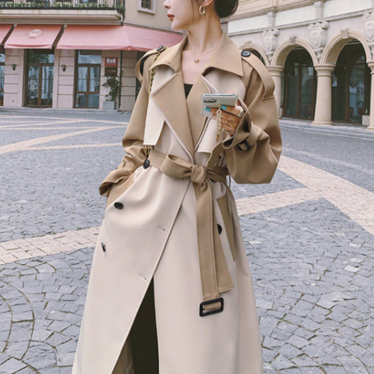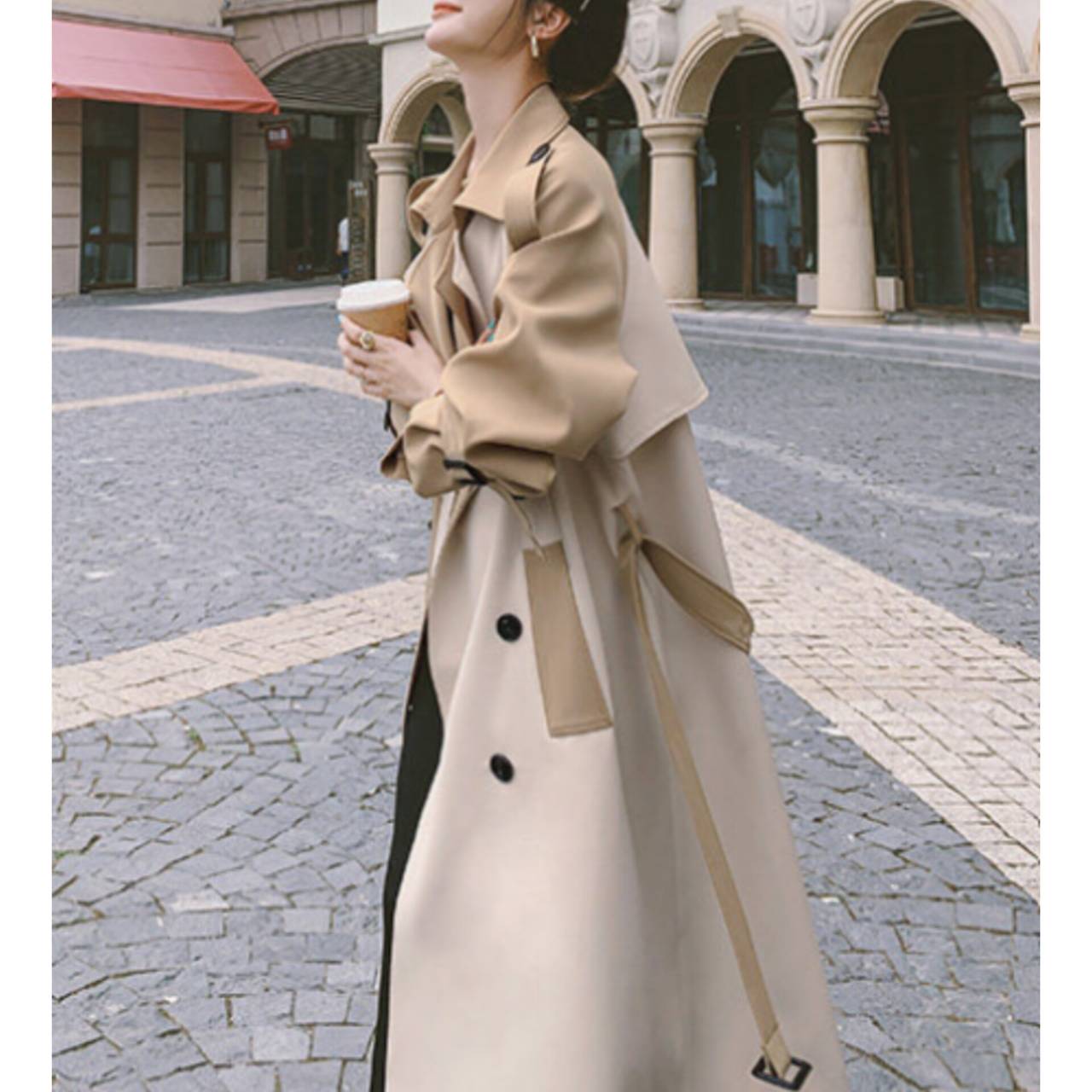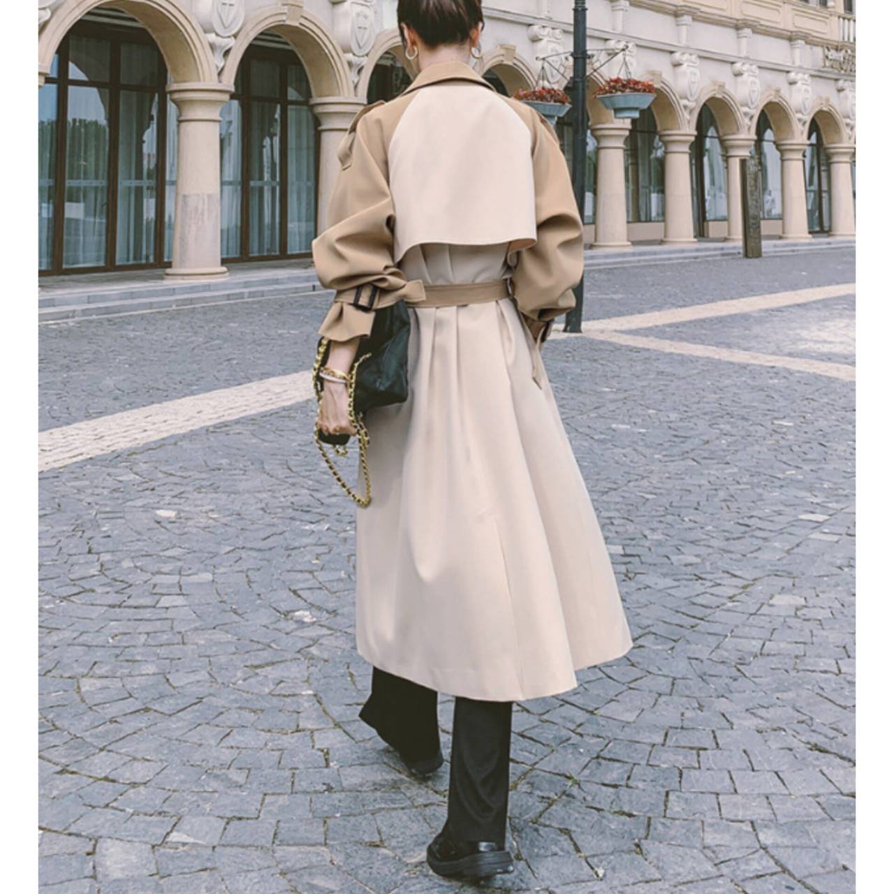 コート トレンチコート アウター トレンチ ウエストマーク ハイウエスト ミモレ丈 バイカラー ツートンカラー エレガント Aライン きれいめ フォーマル ビジネス S/XL 韓国【K2248】