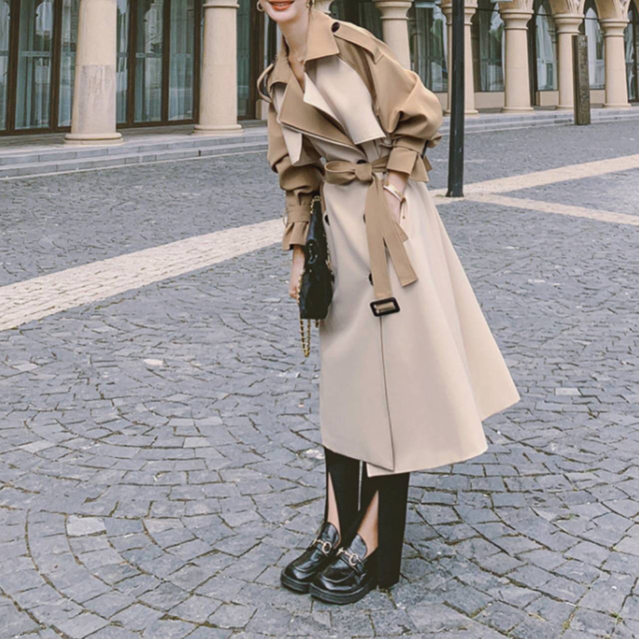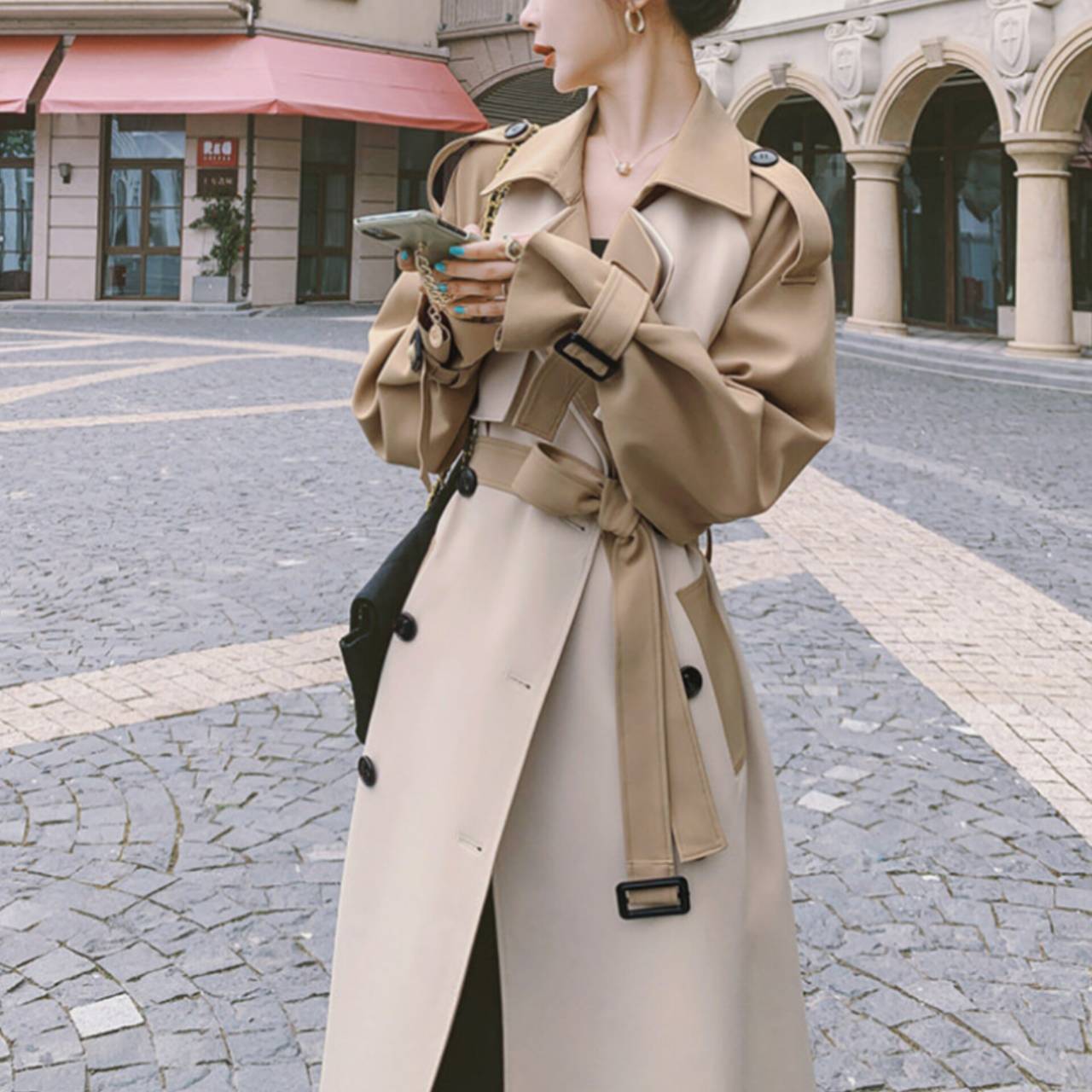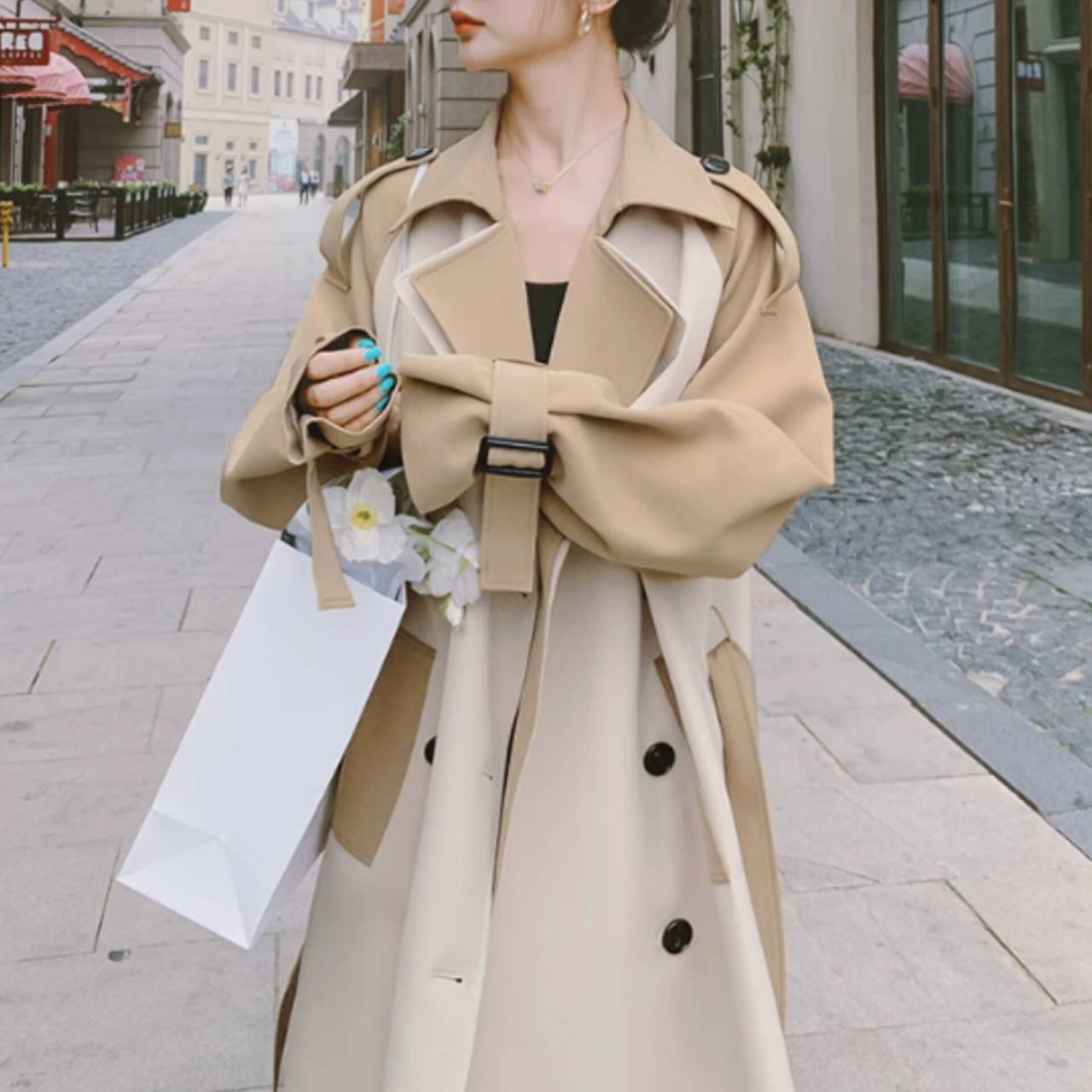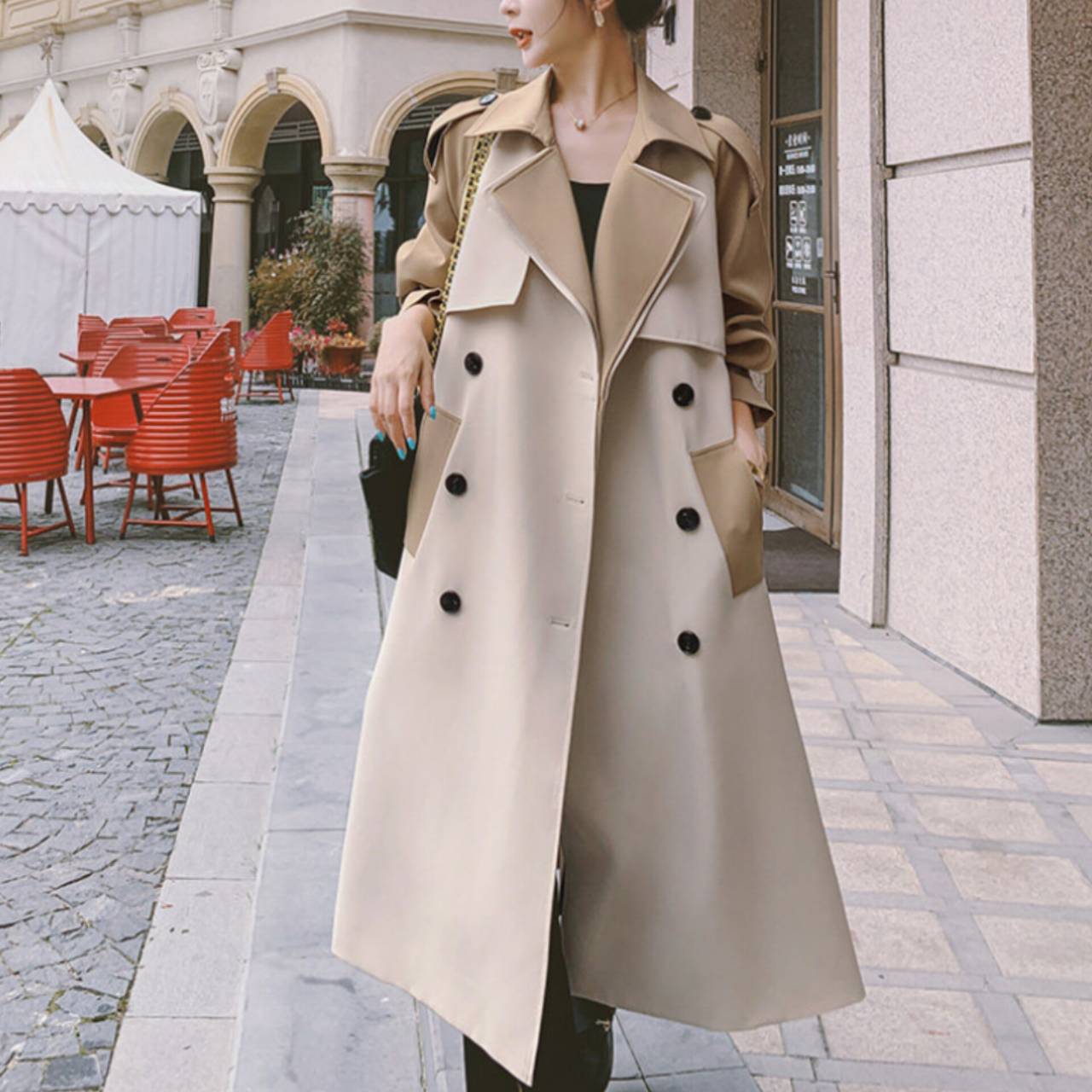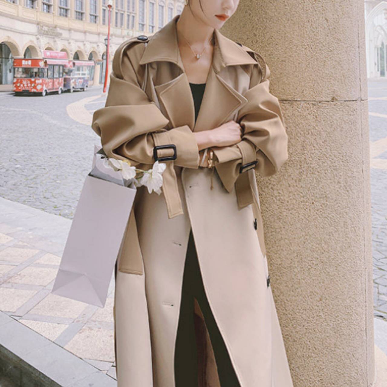 コート トレンチコート アウター トレンチ ウエストマーク ハイウエスト ミモレ丈 バイカラー ツートンカラー エレガント Aライン きれいめ フォーマル ビジネス S/XL 韓国【K2248】