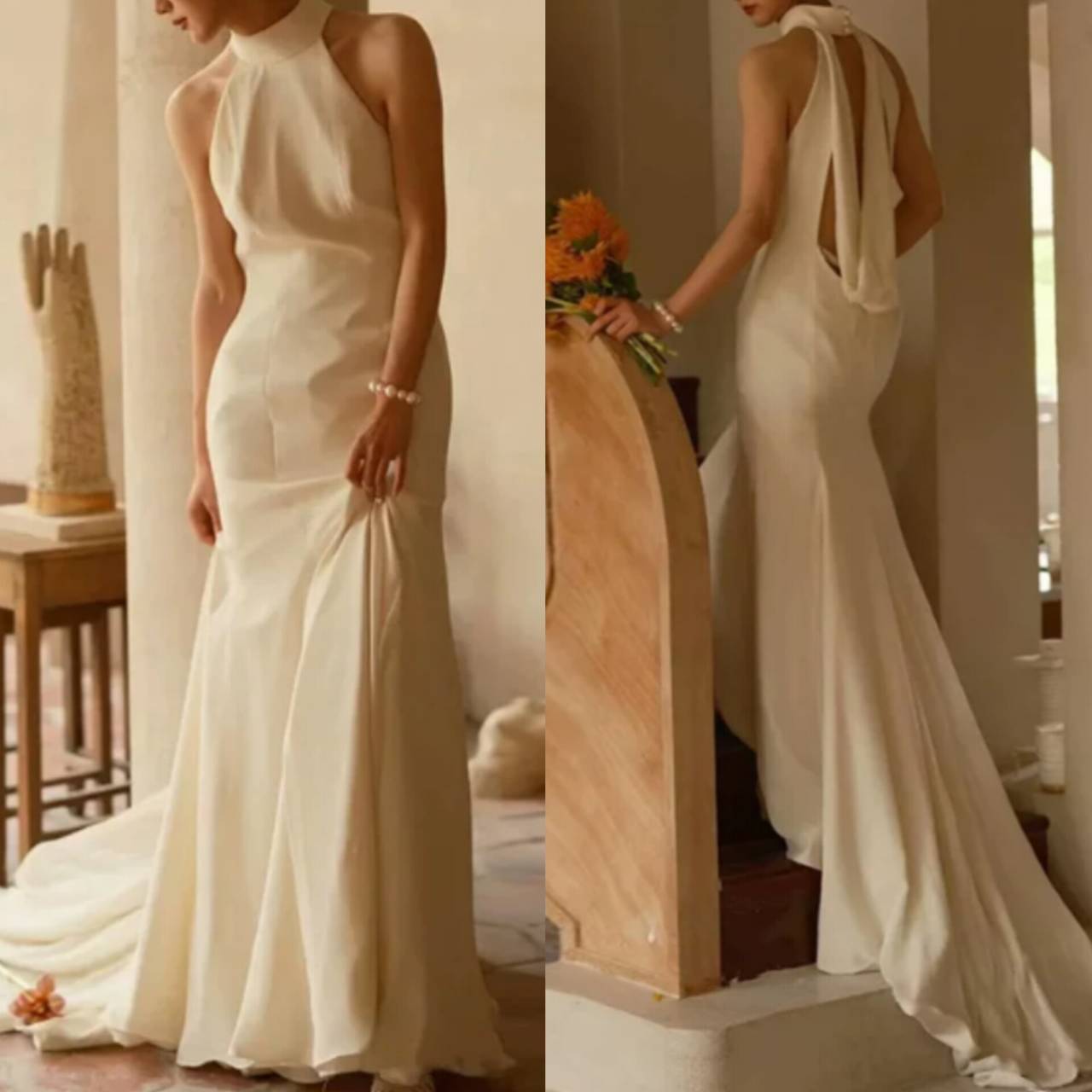 バックコンシャス ウェディングドレス 韓国ドレス サテン ハイネック アメリカンスリーブ アメスリ ノースリーブ バックオープン ドレープ バックドレープ バックシャン ハイウエスト マーメイド ロングトレーン ロング トレーン 美シルエット エレガント XS/2XL 韓国【K5656】