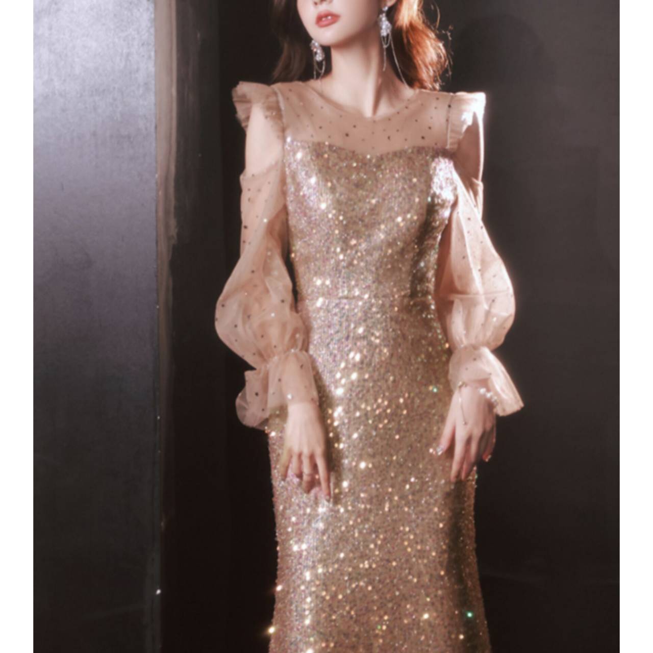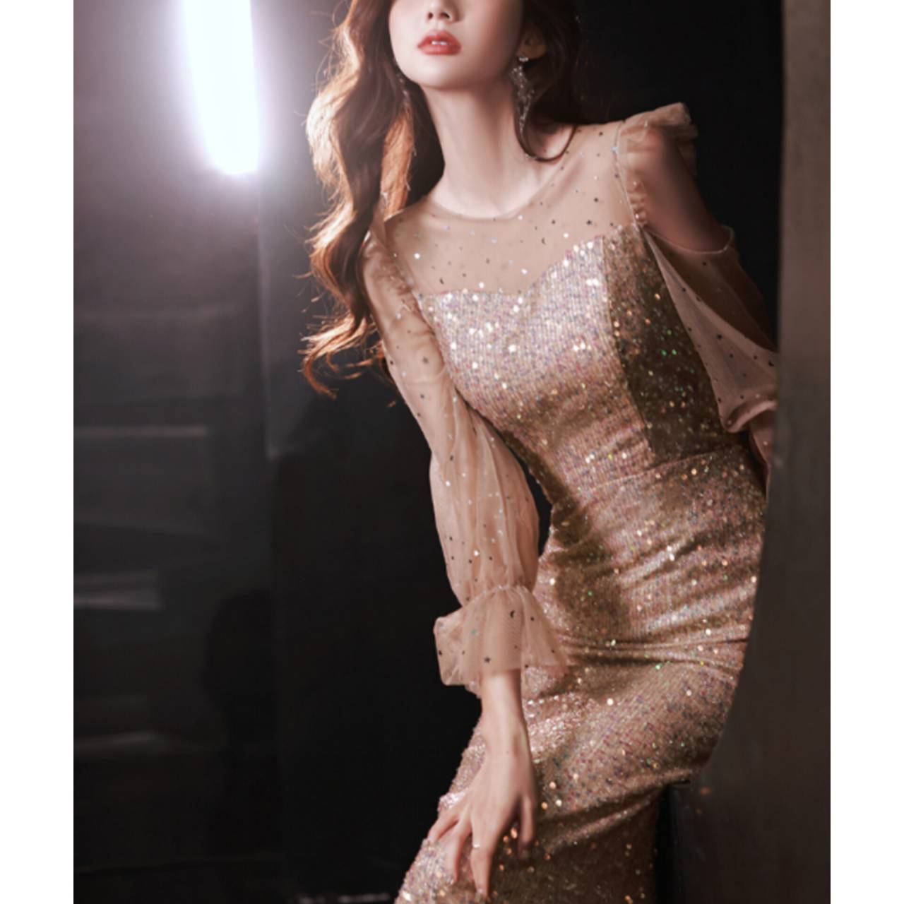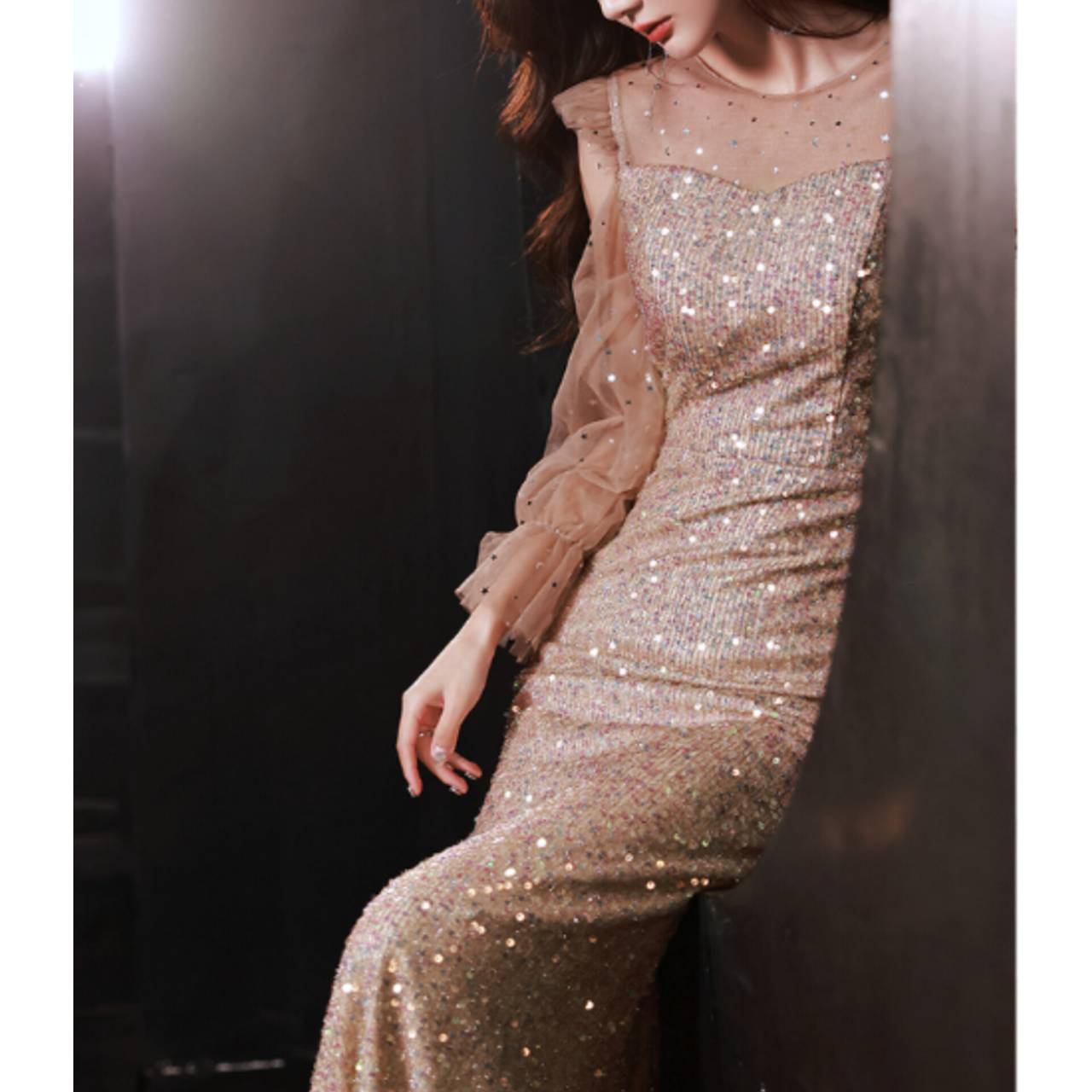 キラキラ ドレス イブニングドレス 韓国ドレス 長袖 オープンショルダー オープンスリーブ パフスリーブ ぽわん袖 シアー フリル スパンコール クルーネック 星 月 ハイウエスト ビジュー マーメイド ロング グリッター 美シルエット XS/3XL 韓国 【B4991】