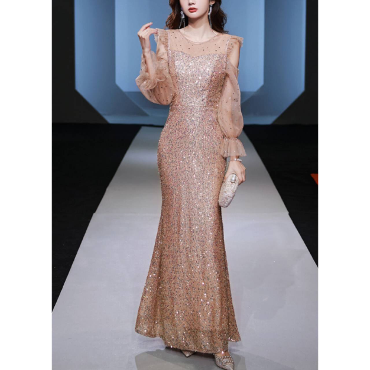 カラーは肌を美しく魅せるシャンパン。サイズはXS〜3XLまで幅広く対応。一歩踏み出す瞬間、ライトに反射する輝きが視線を惹きつける。