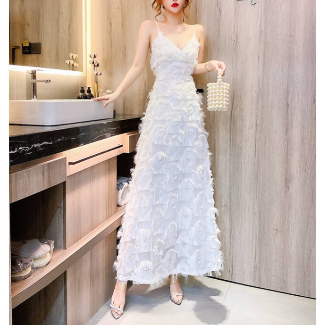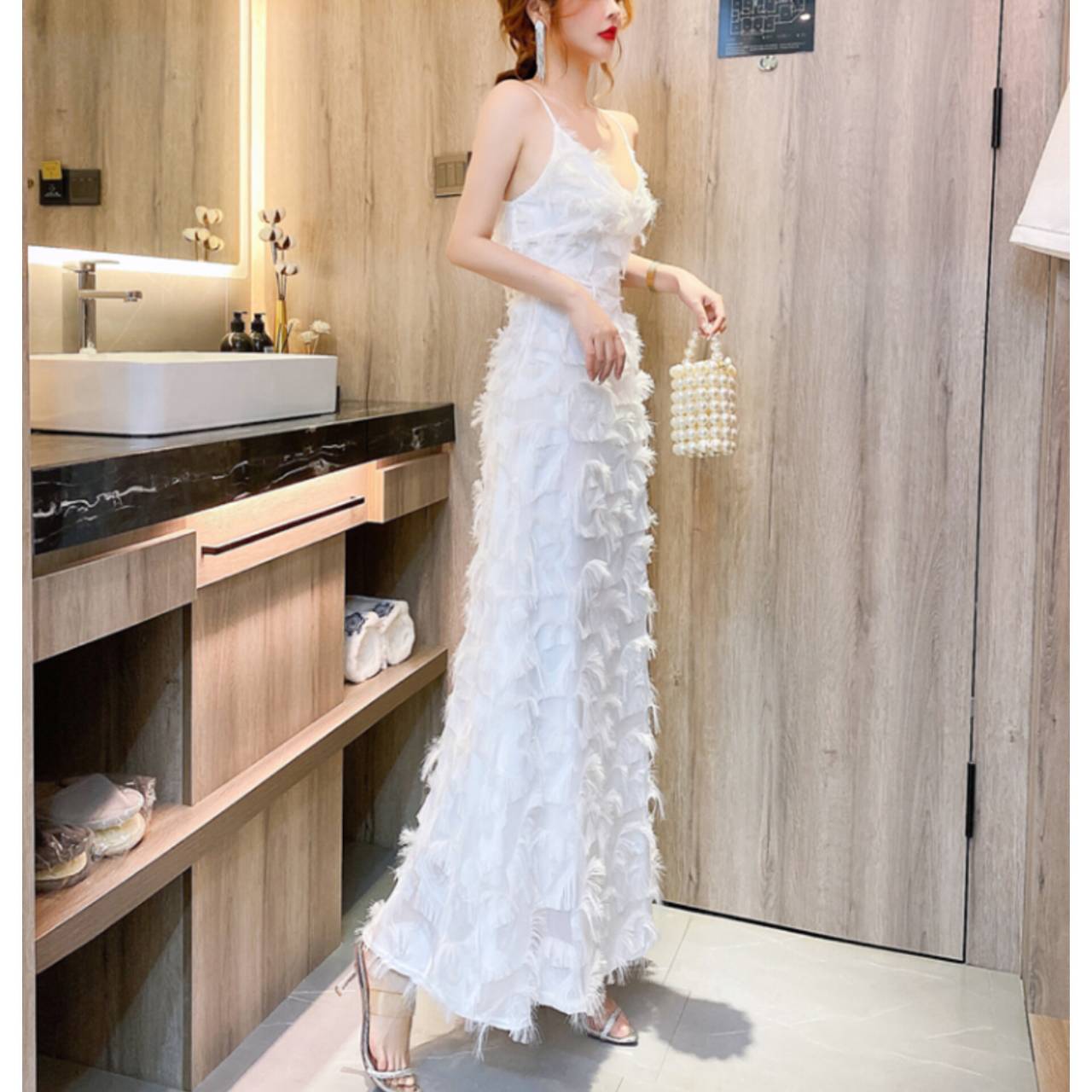 全2色 ドレス キャミドレス イブニングドレス 韓国ドレス キャミソールドレス フェザー風 ウエストマーク Aライン ロング マキシ丈 S/2XL 韓国【K2916】