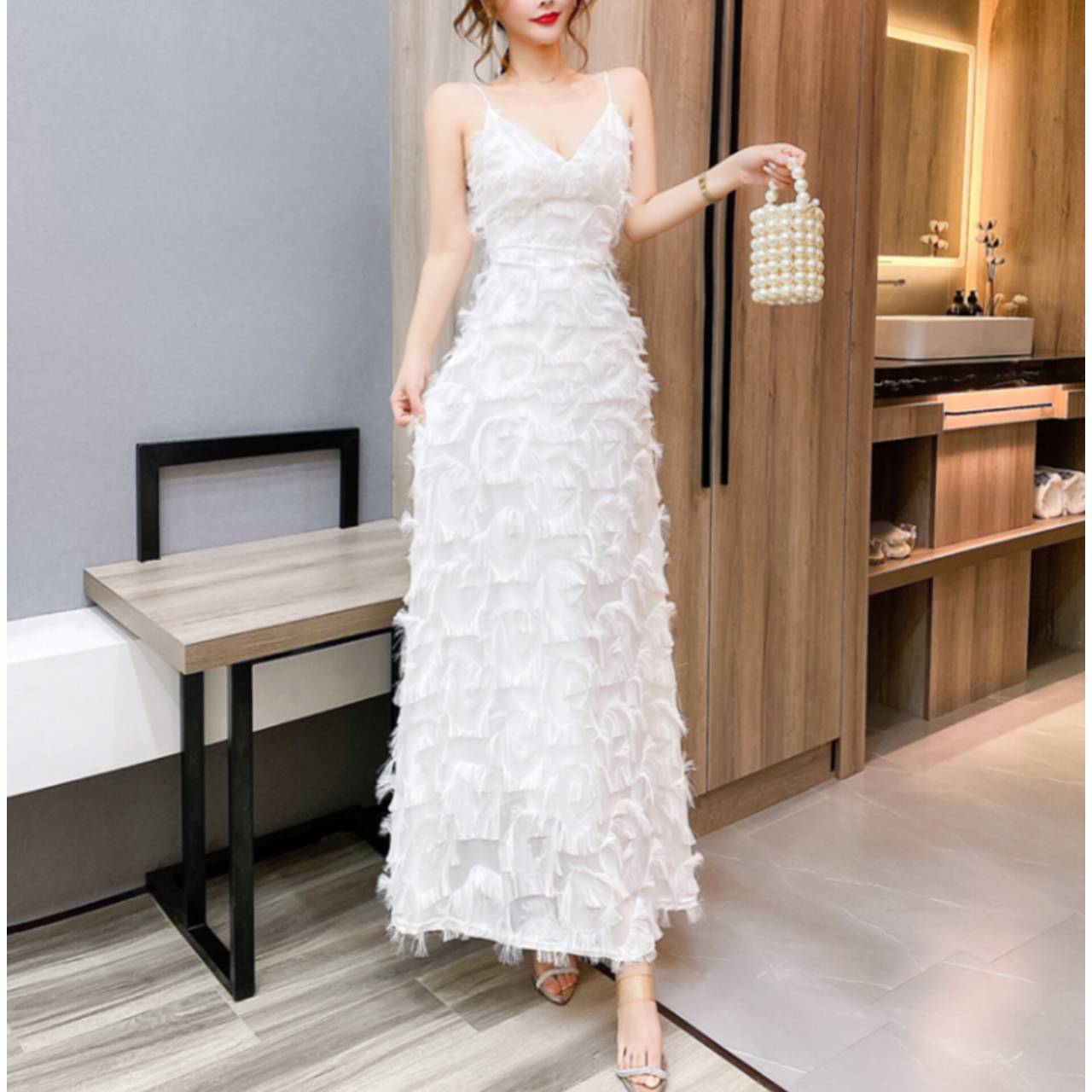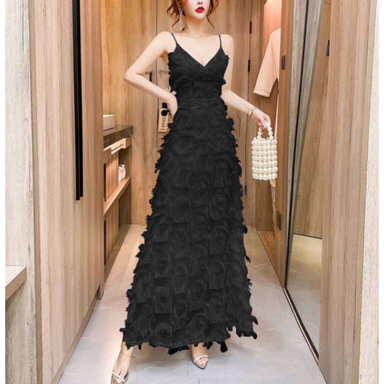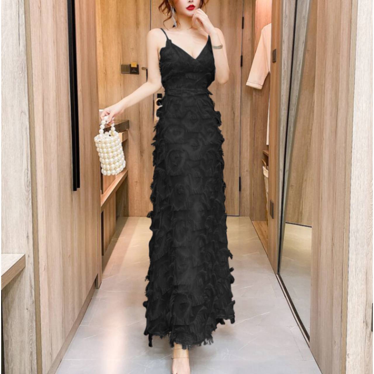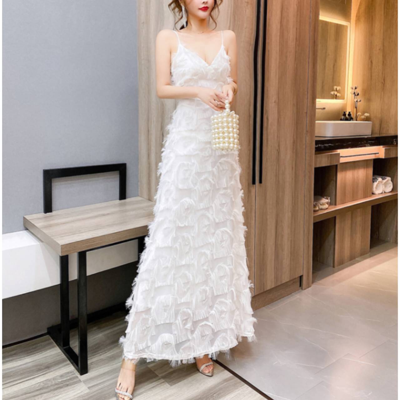 ラグジュアリーとロマンティックを一枚で纏う。動くたびに揺れる立体フリンジが、あなたを主役にするドレス。