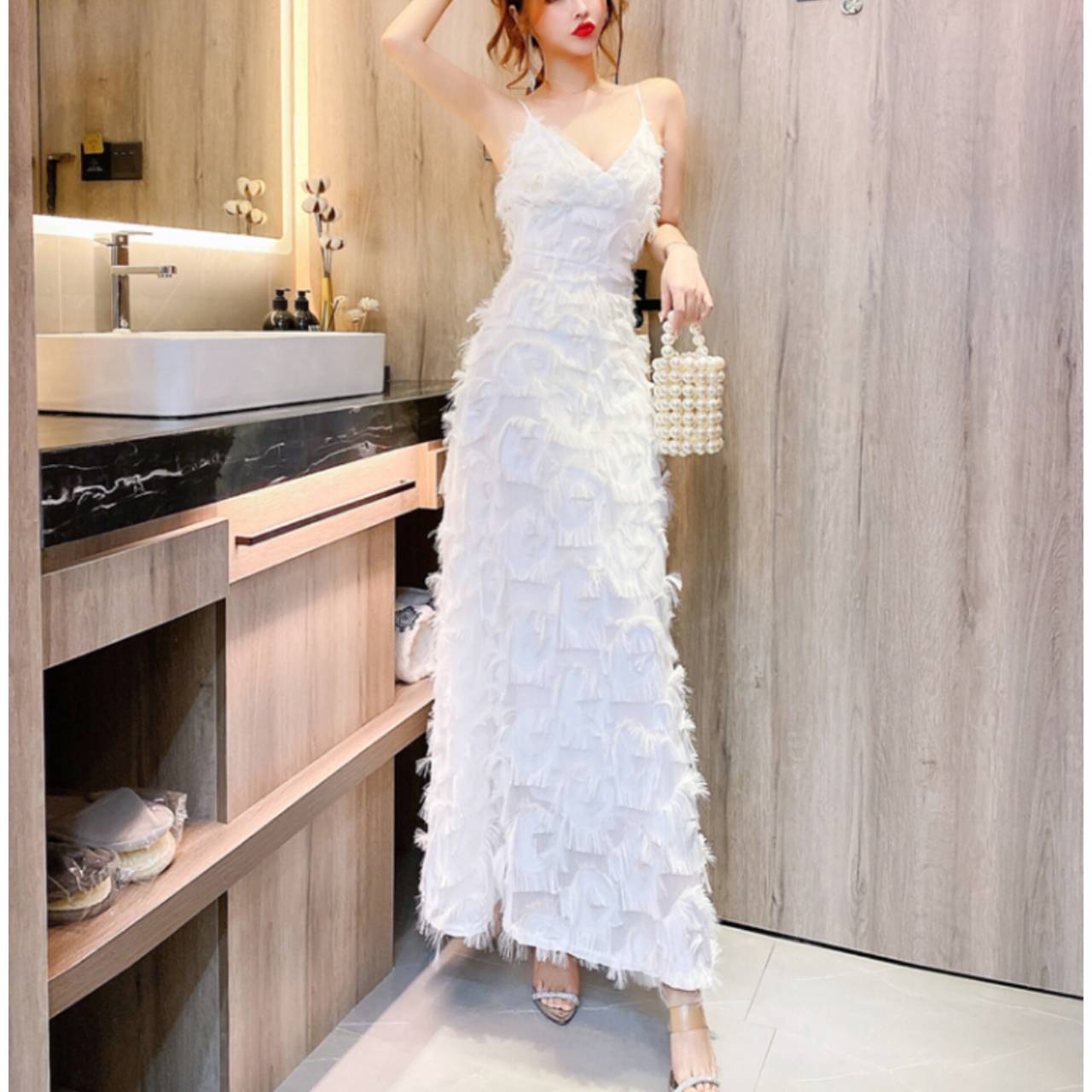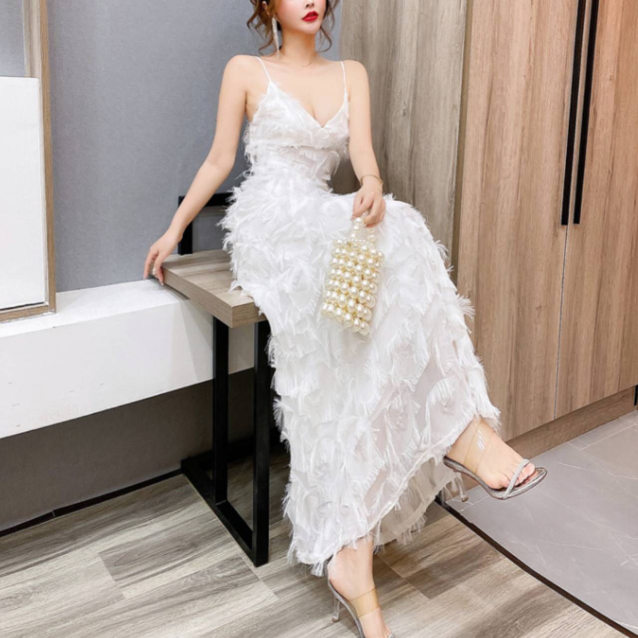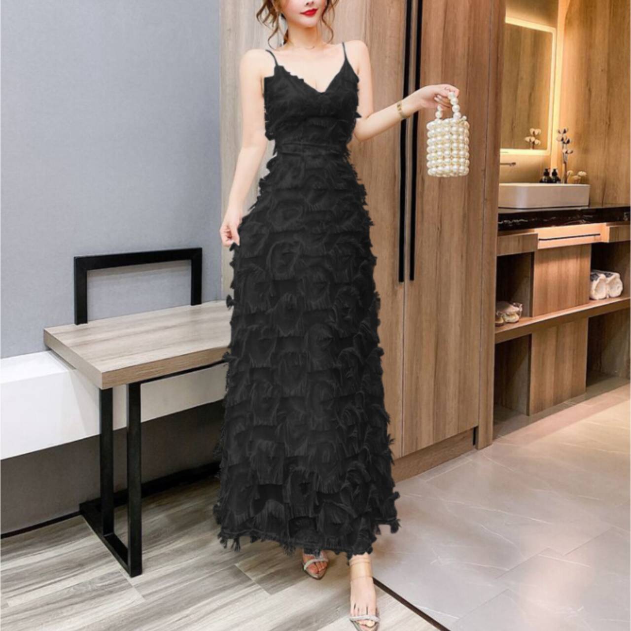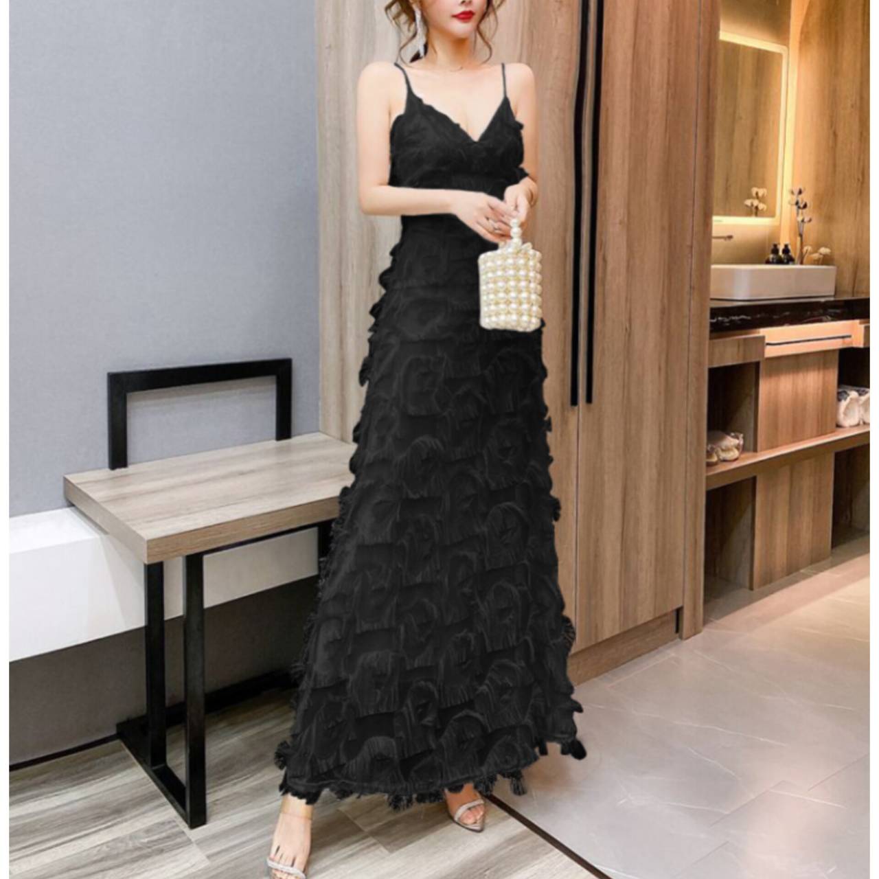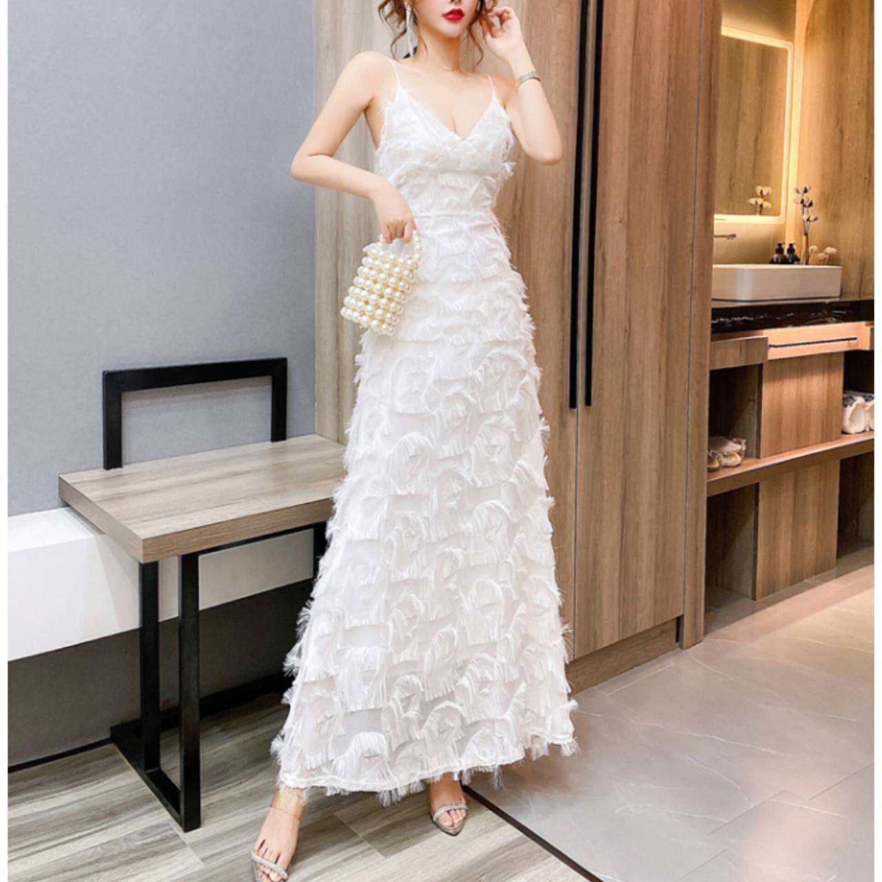 ラグジュアリーとロマンティックを一枚で纏う。動くたびに揺れる立体フリンジが、あなたを主役にするドレス。