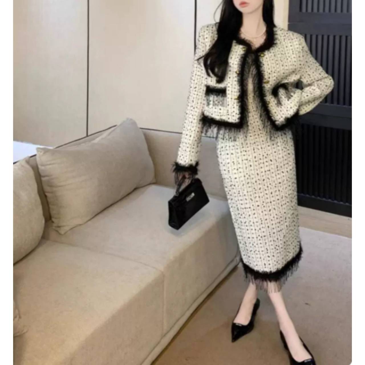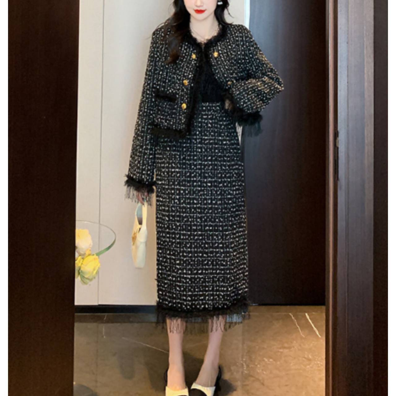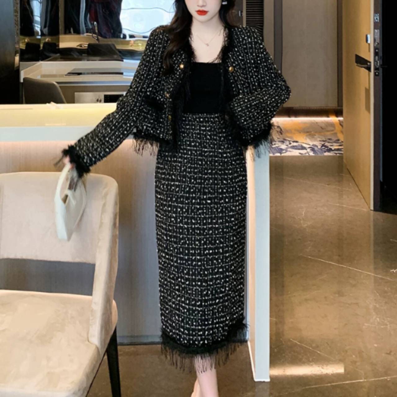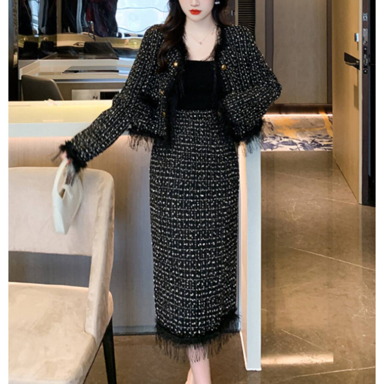 上質感のあるツイード風素材を使用し、立体感のある織り柄と繊細なフリンジディテールが、シンプルながらも高級感を演出します。