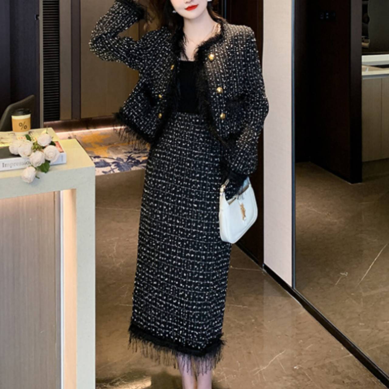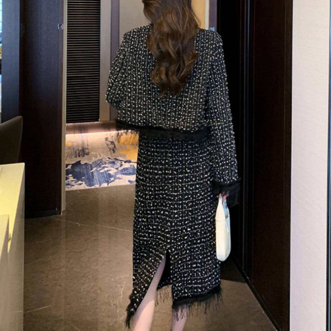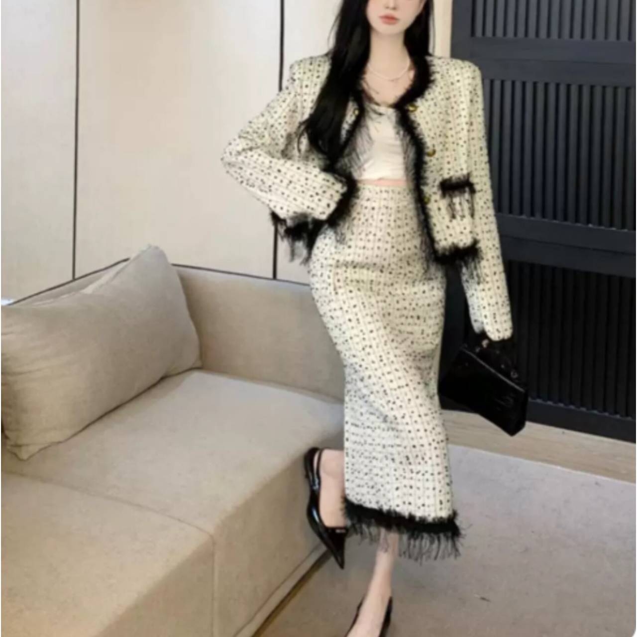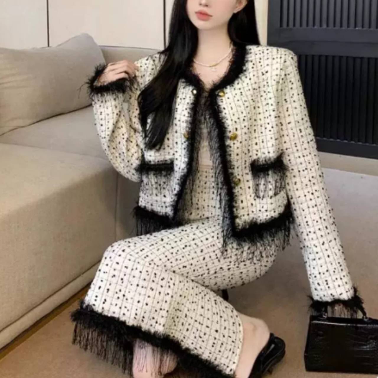 上質感のあるツイード風素材を使用し、立体感のある織り柄と繊細なフリンジディテールが、シンプルながらも高級感を演出します。