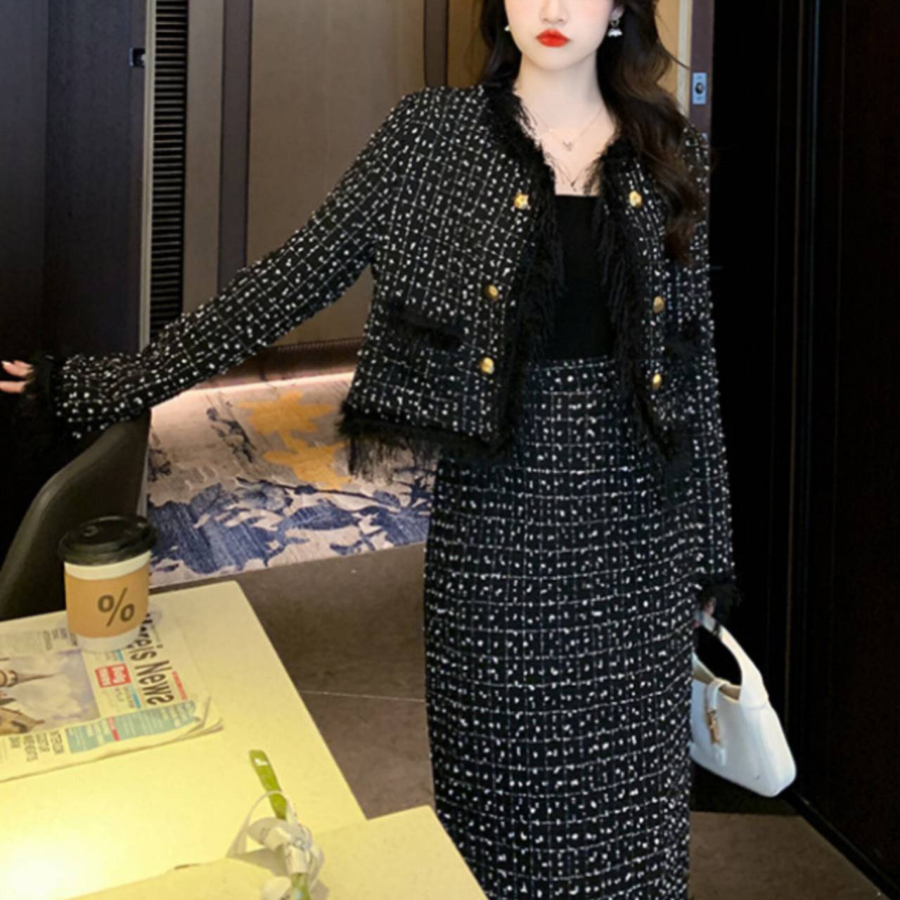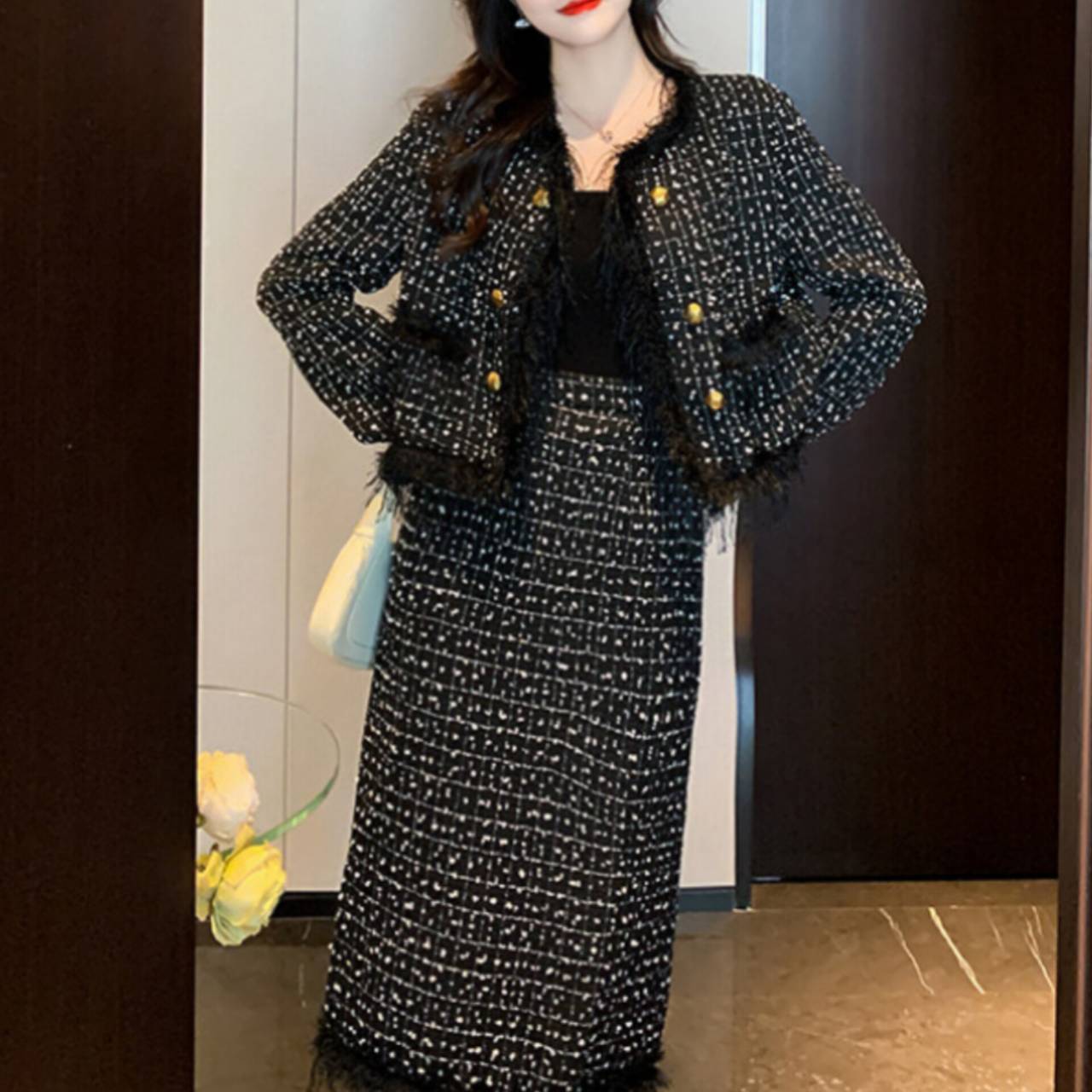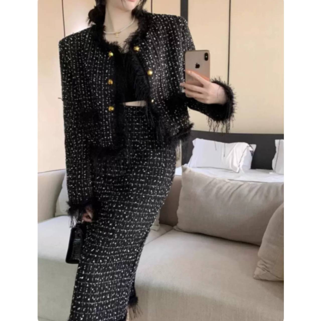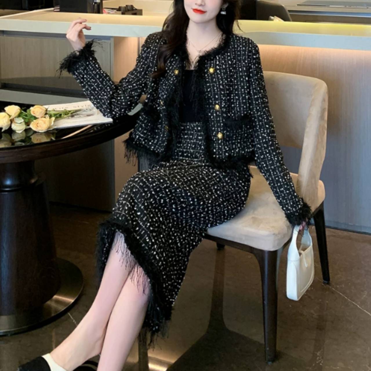 上質感のあるツイード風素材を使用し、立体感のある織り柄と繊細なフリンジディテールが、シンプルながらも高級感を演出します。