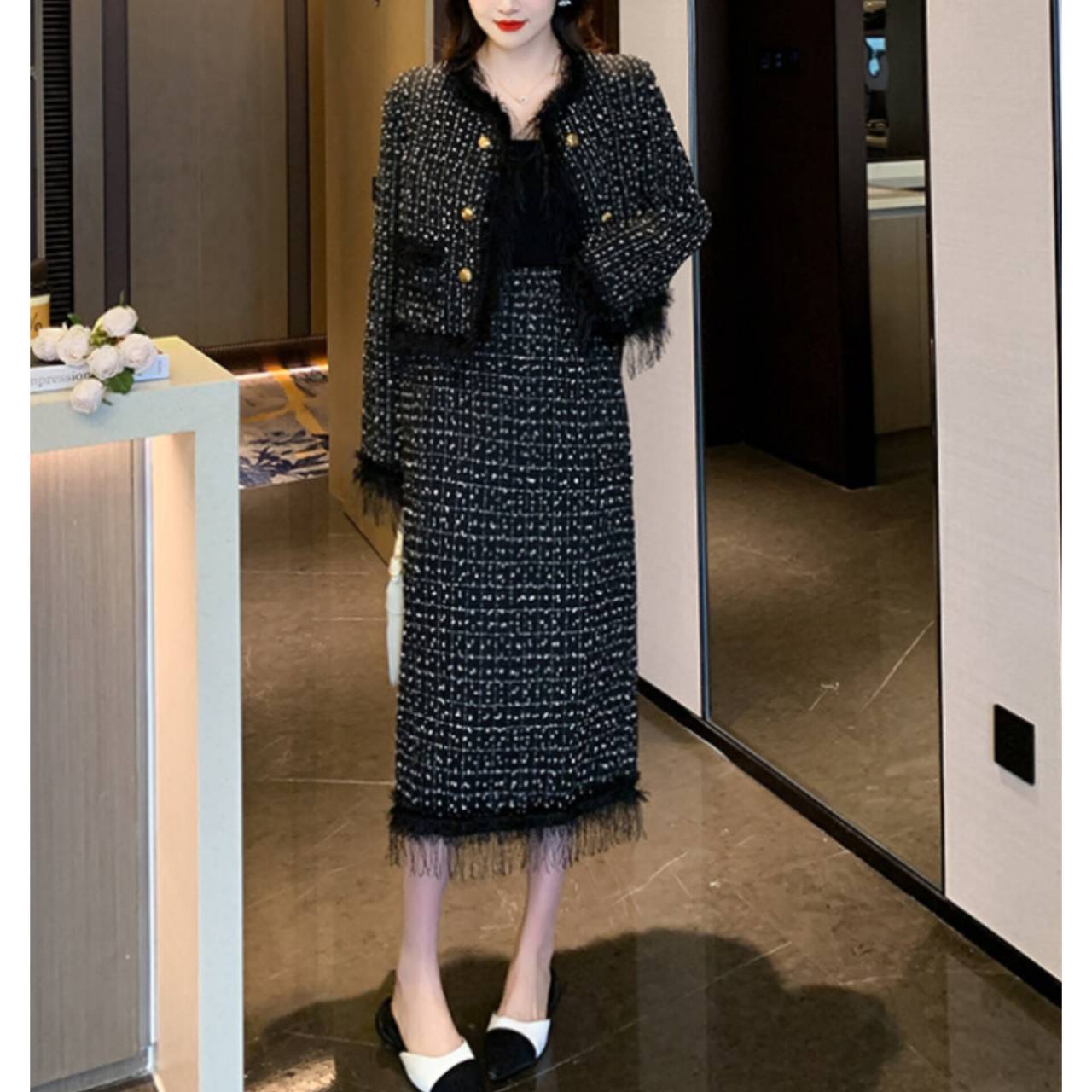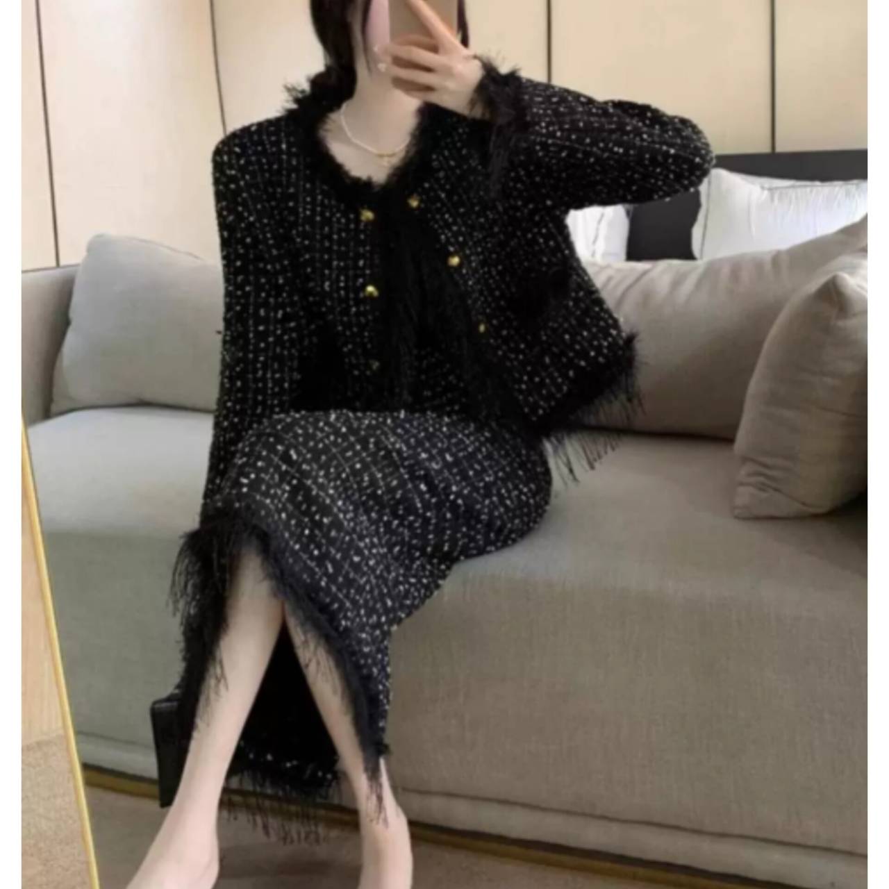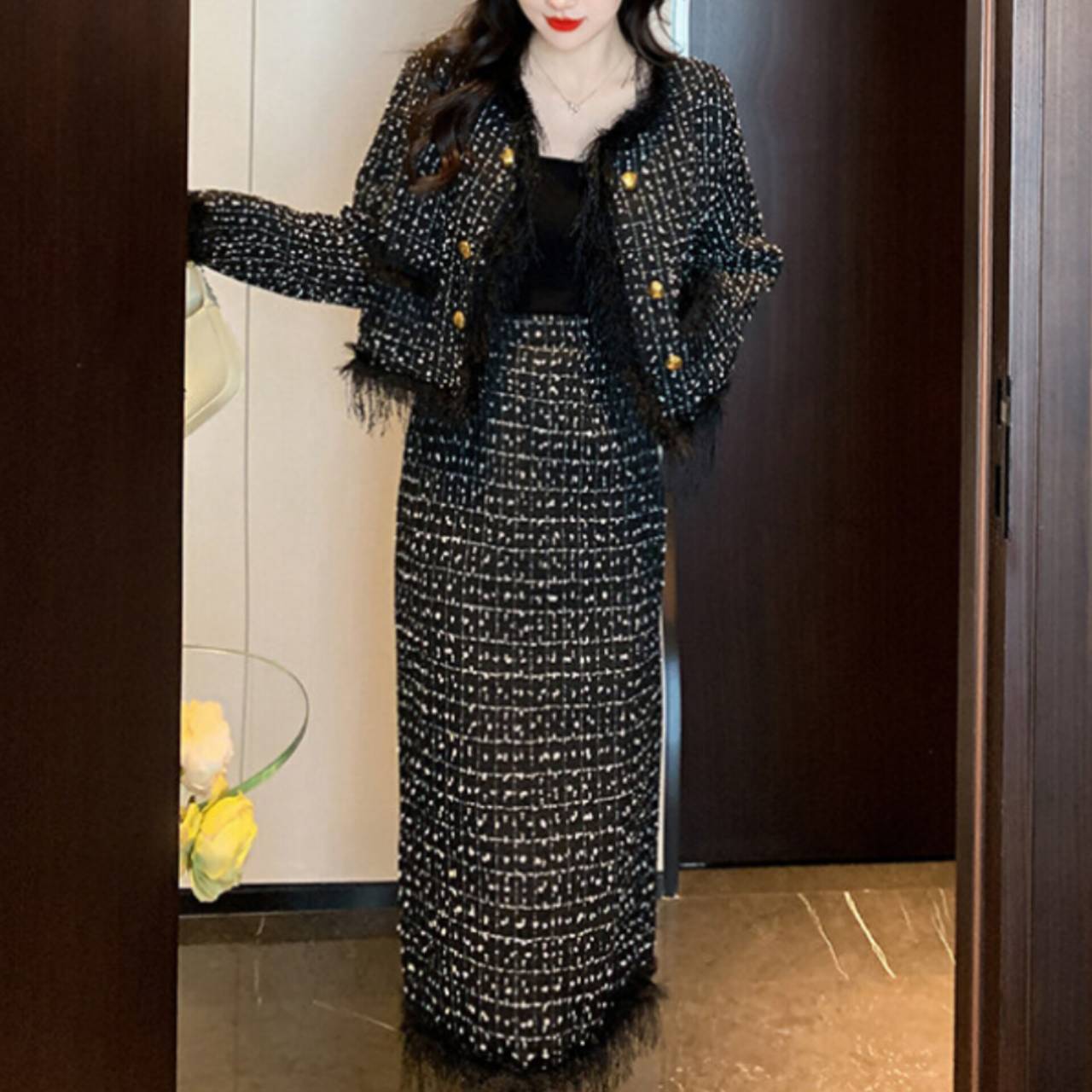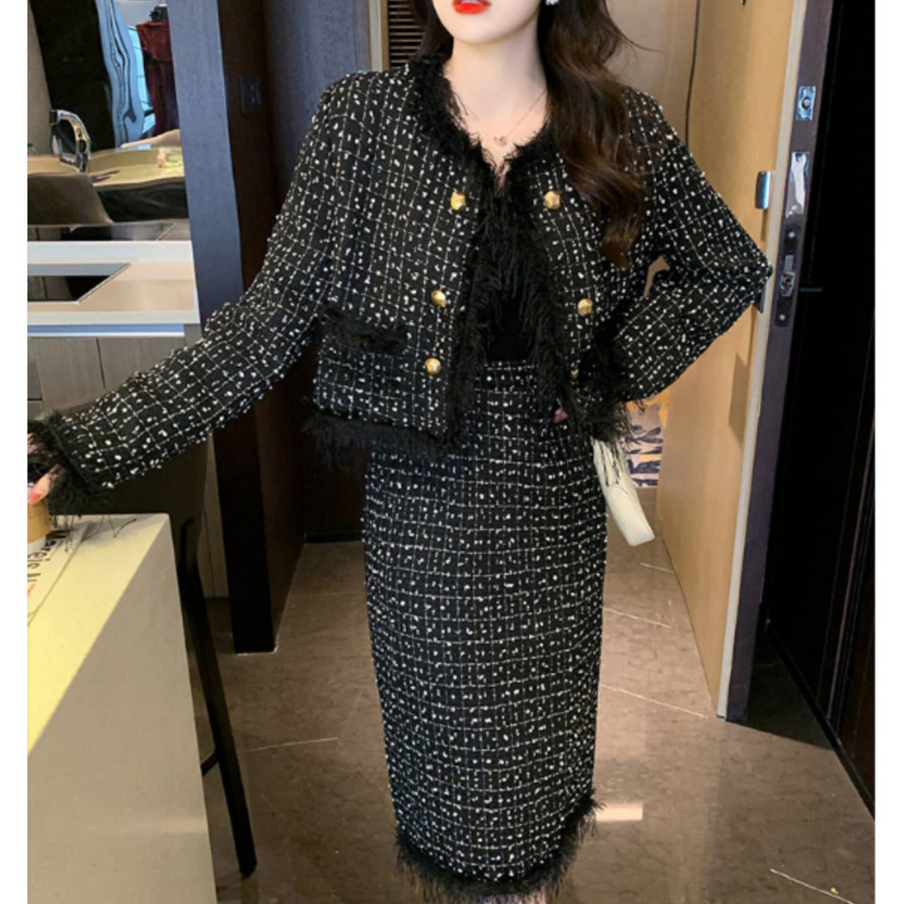 全2色 セットアップ ドレス 韓国ドレス セットアップドレス ツイード ノーカラージャケット 長袖 ロングスリーブ クルーネック クロップド丈ジャケット クロップド丈 金ボタン ゴールドボタン フロントボタン フリンジ ファー ふわふわ ミモレ丈スカート Iライン タイト バックスリット 異素材ミックス 2ピース 美シルエット セレモニー S/XL 韓国【K6034】