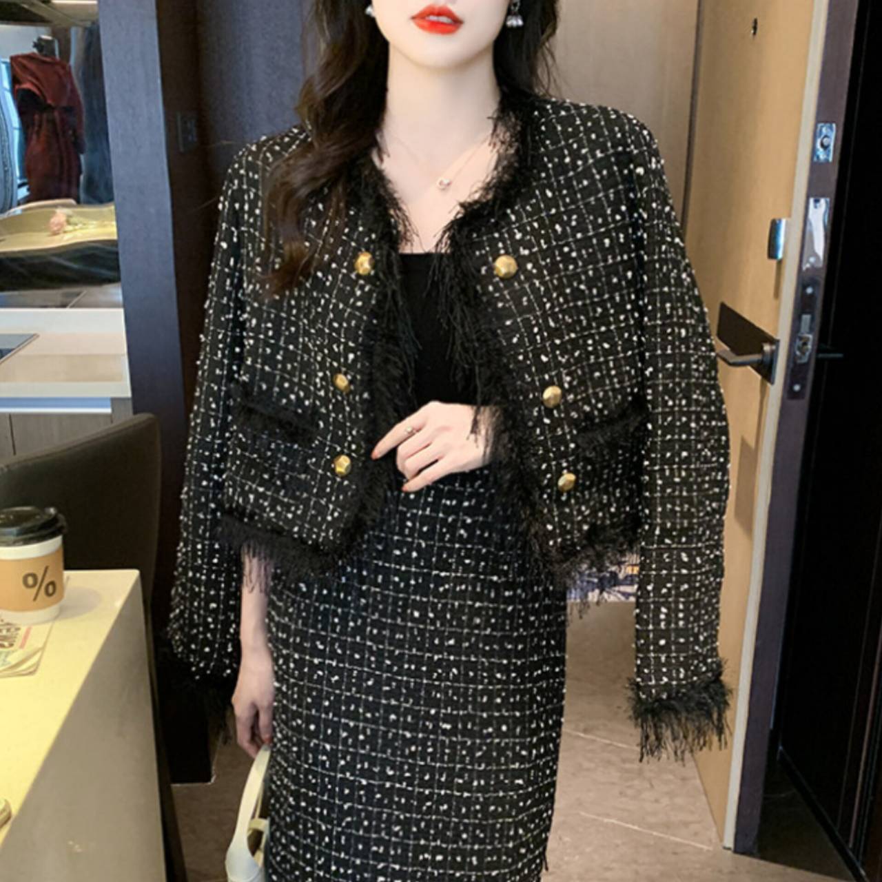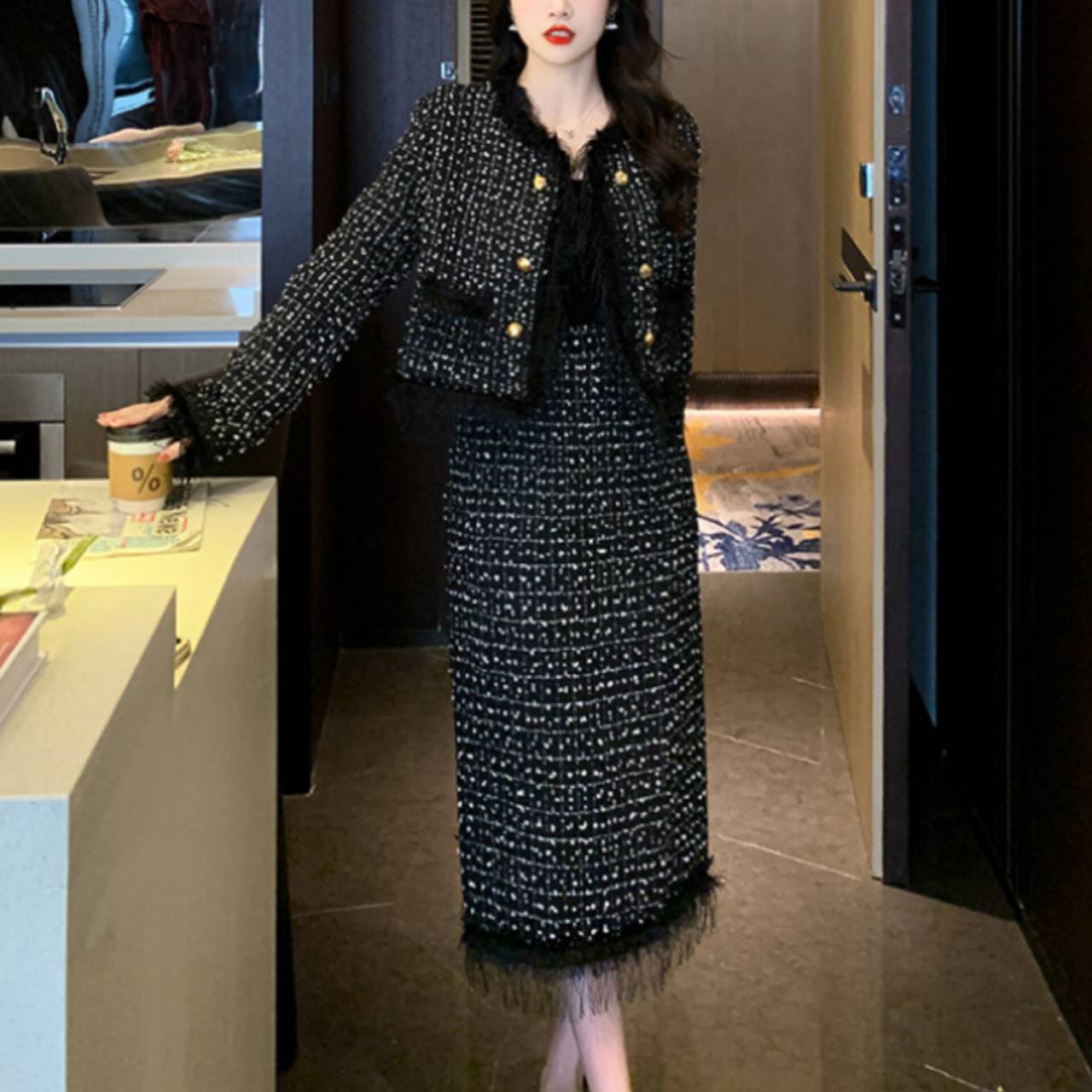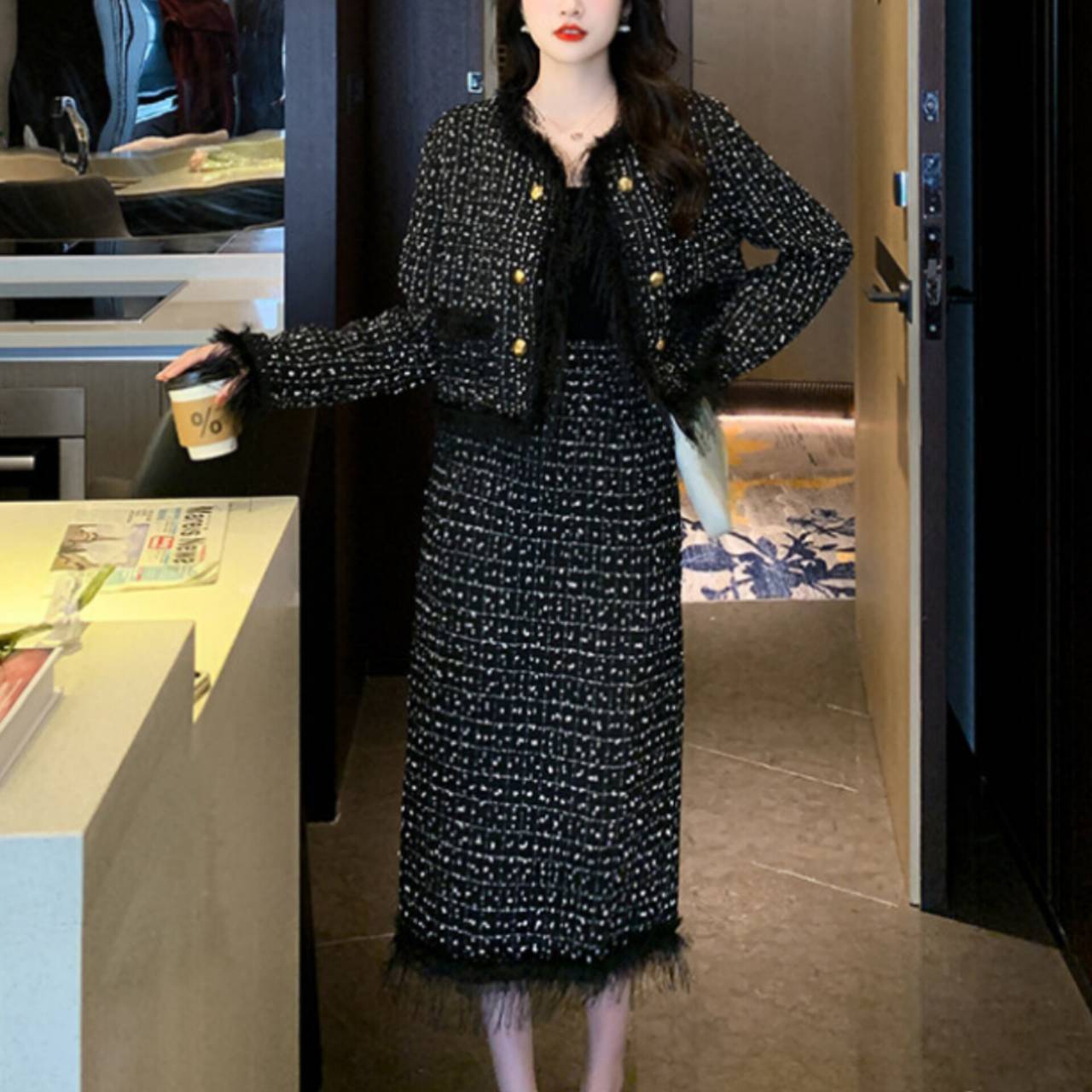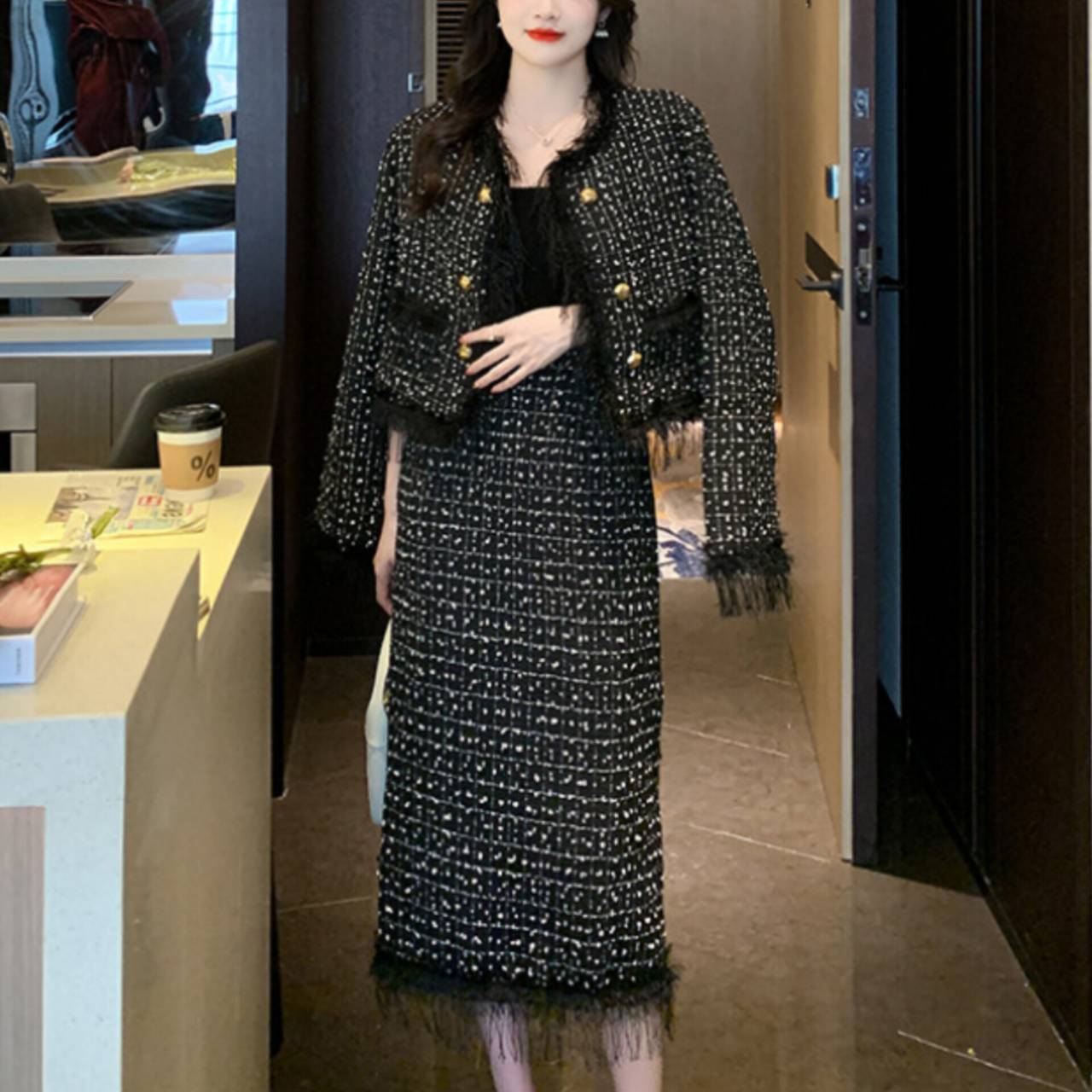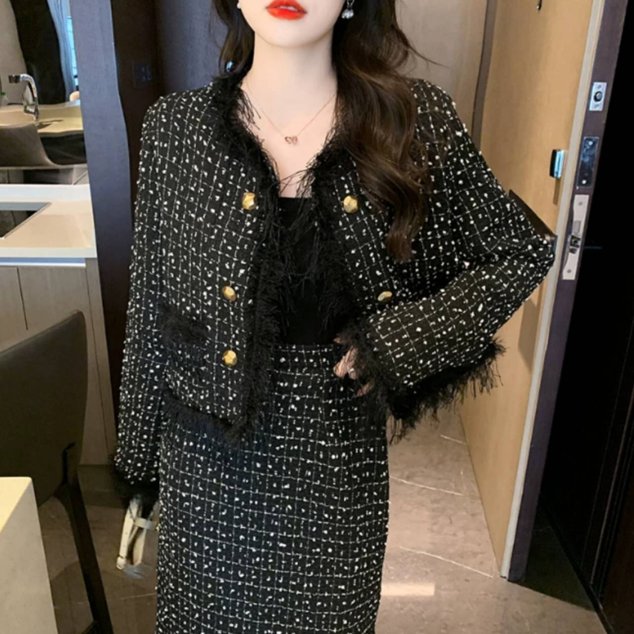 全2色 セットアップ ドレス 韓国ドレス セットアップドレス ツイード ノーカラージャケット 長袖 ロングスリーブ クルーネック クロップド丈ジャケット クロップド丈 金ボタン ゴールドボタン フロントボタン フリンジ ファー ふわふわ ミモレ丈スカート Iライン タイト バックスリット 異素材ミックス 2ピース 美シルエット セレモニー S/XL 韓国【K6034】