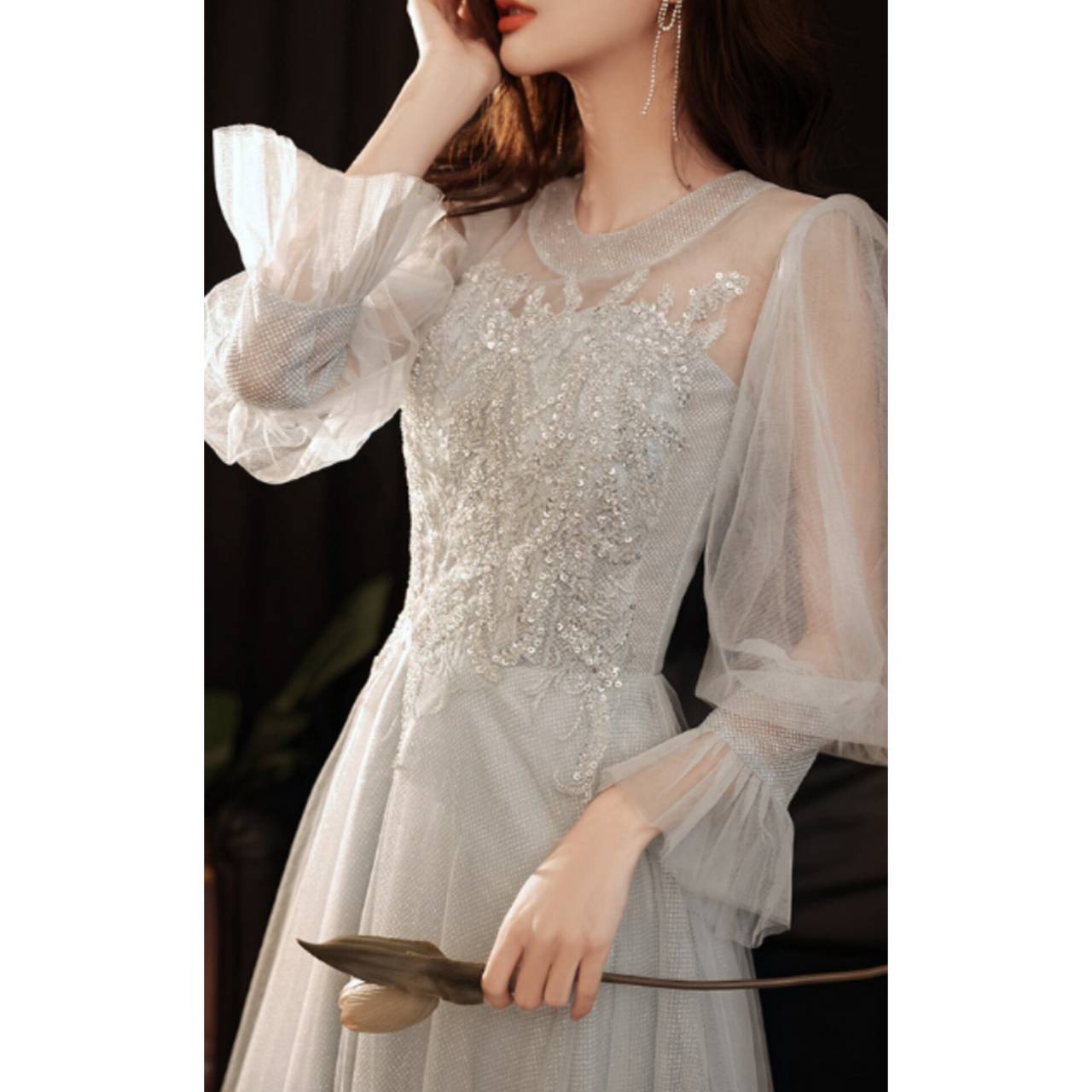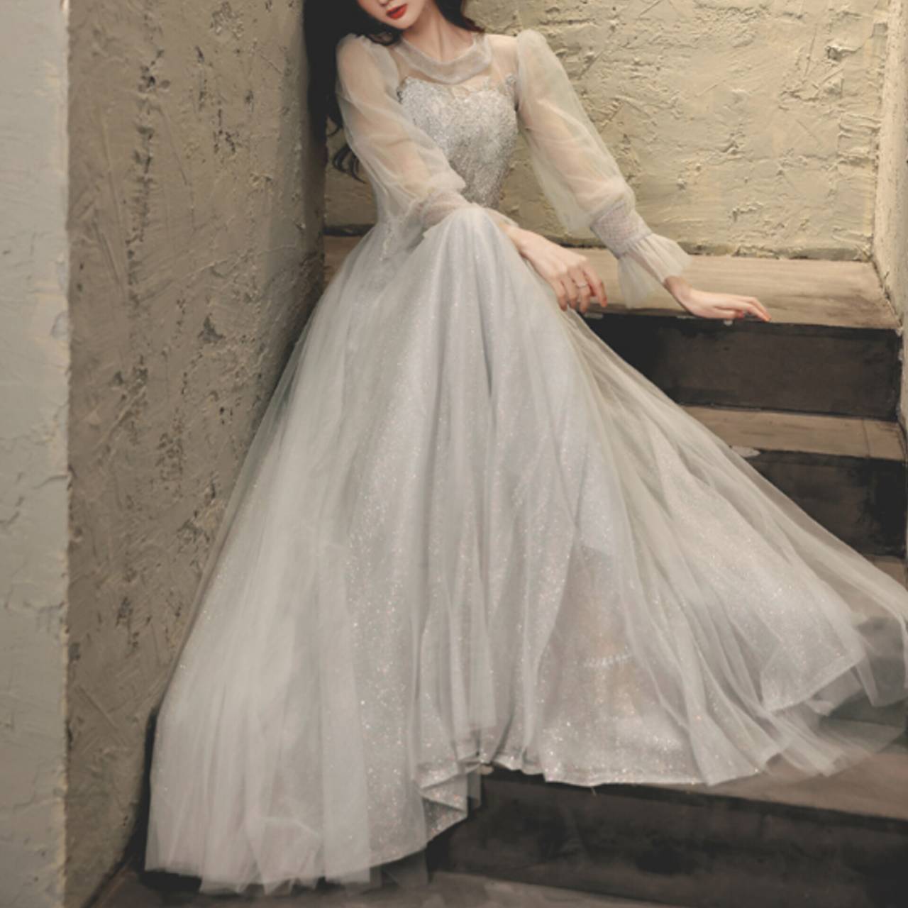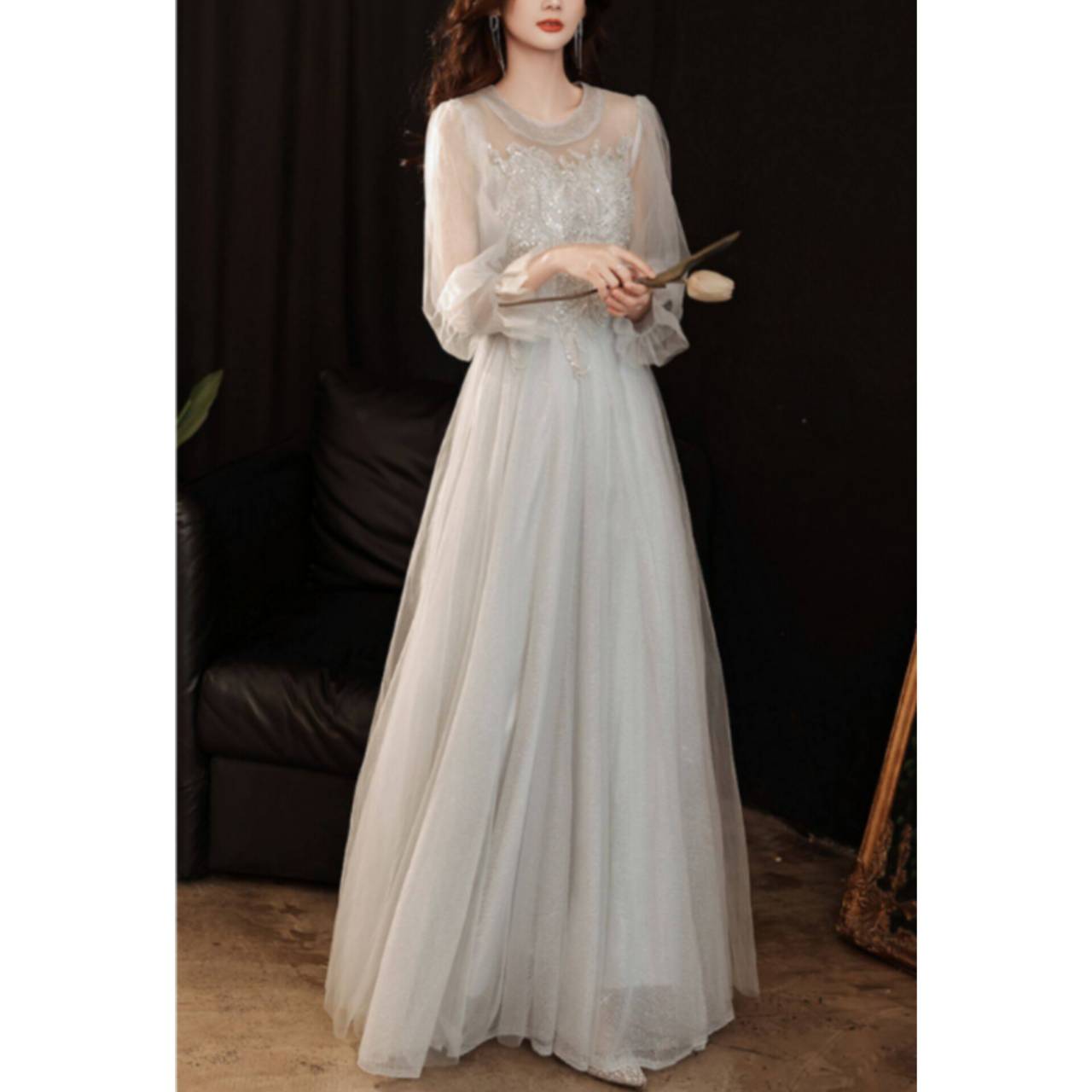 長袖 ウェディングドレス カラードレス 韓国ドレス クルーネック パフスリーブ ぽわん袖 ベルスリーブ シアー ビジュー スパンコール キラキラ ハイウエスト Aライン ロング フレア チュール エレガント 体型カバー XS/2XL 韓国【K2086】