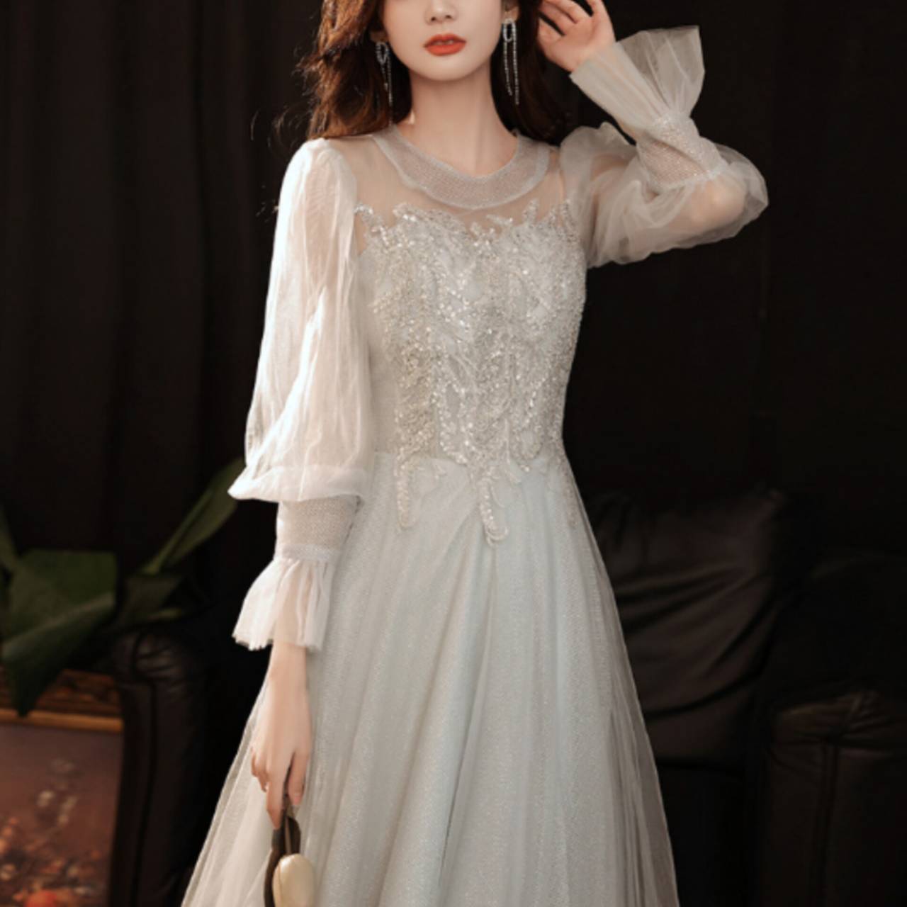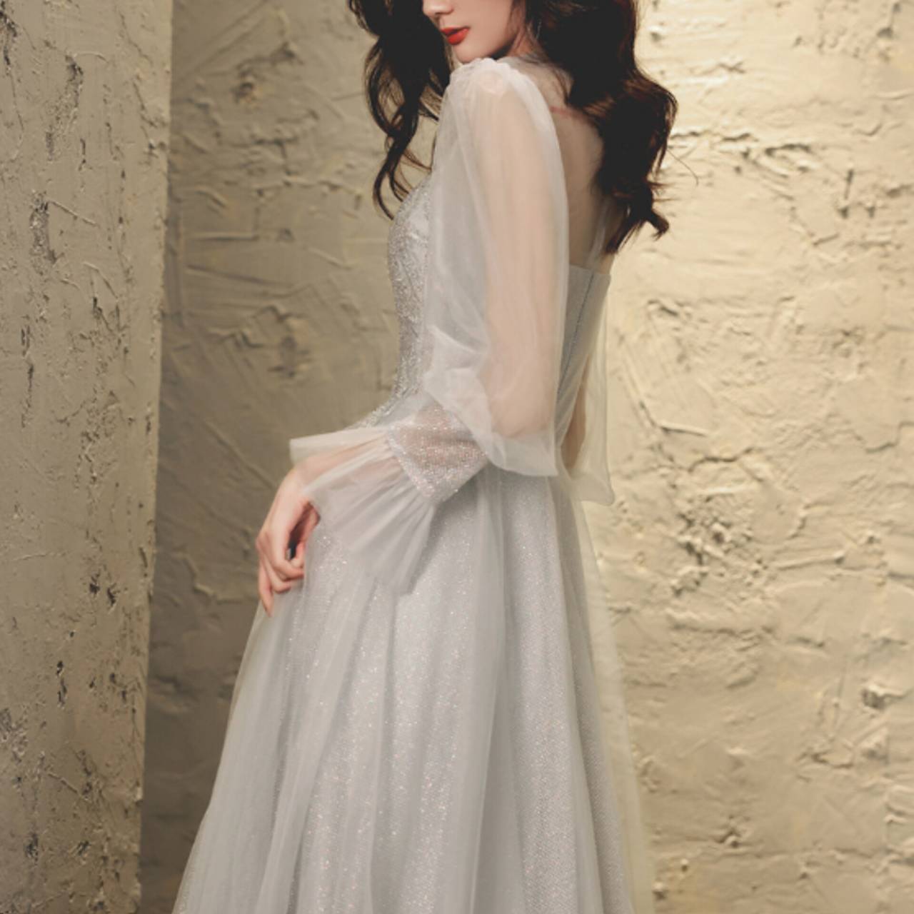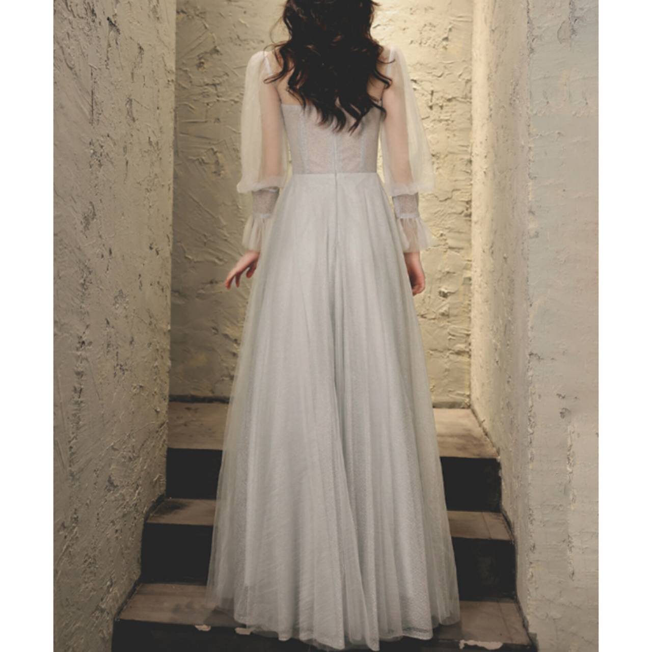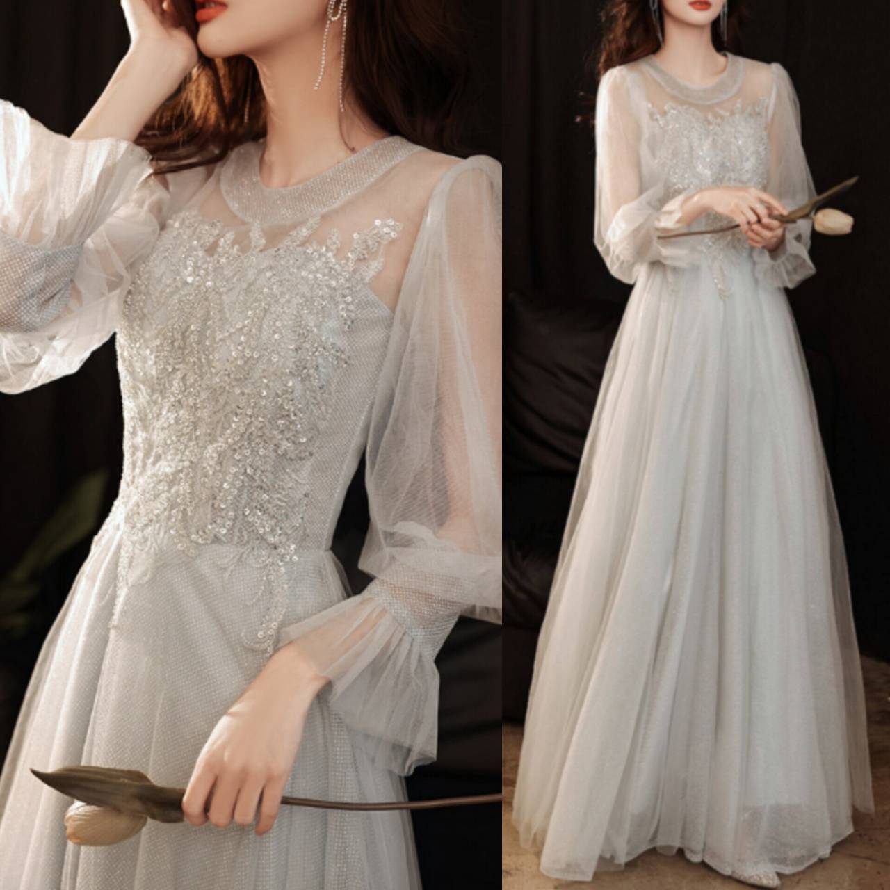 長袖 ウェディングドレス カラードレス 韓国ドレス クルーネック パフスリーブ ぽわん袖 ベルスリーブ シアー ビジュー スパンコール キラキラ ハイウエスト Aライン ロング フレア チュール エレガント 体型カバー XS/2XL 韓国【K2086】