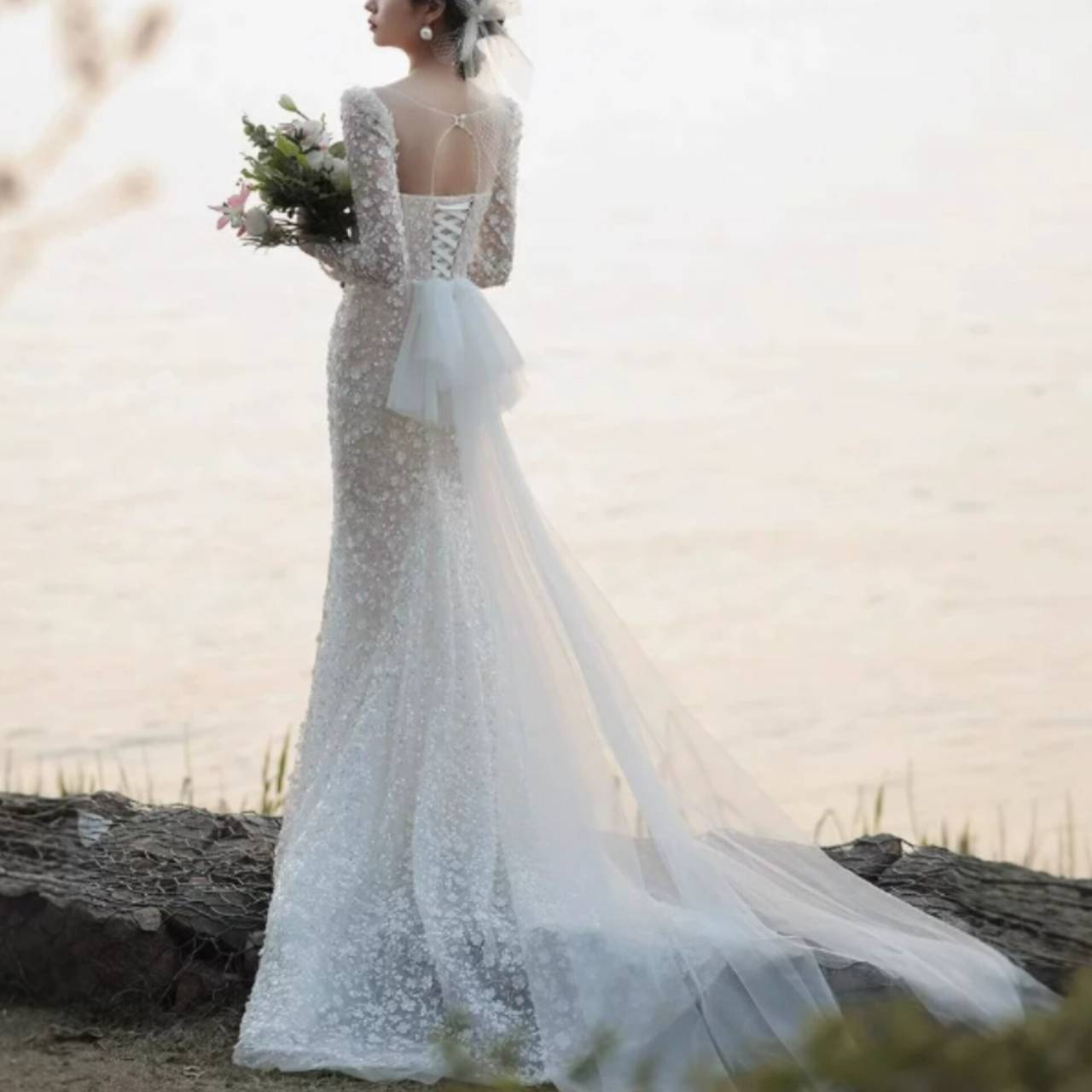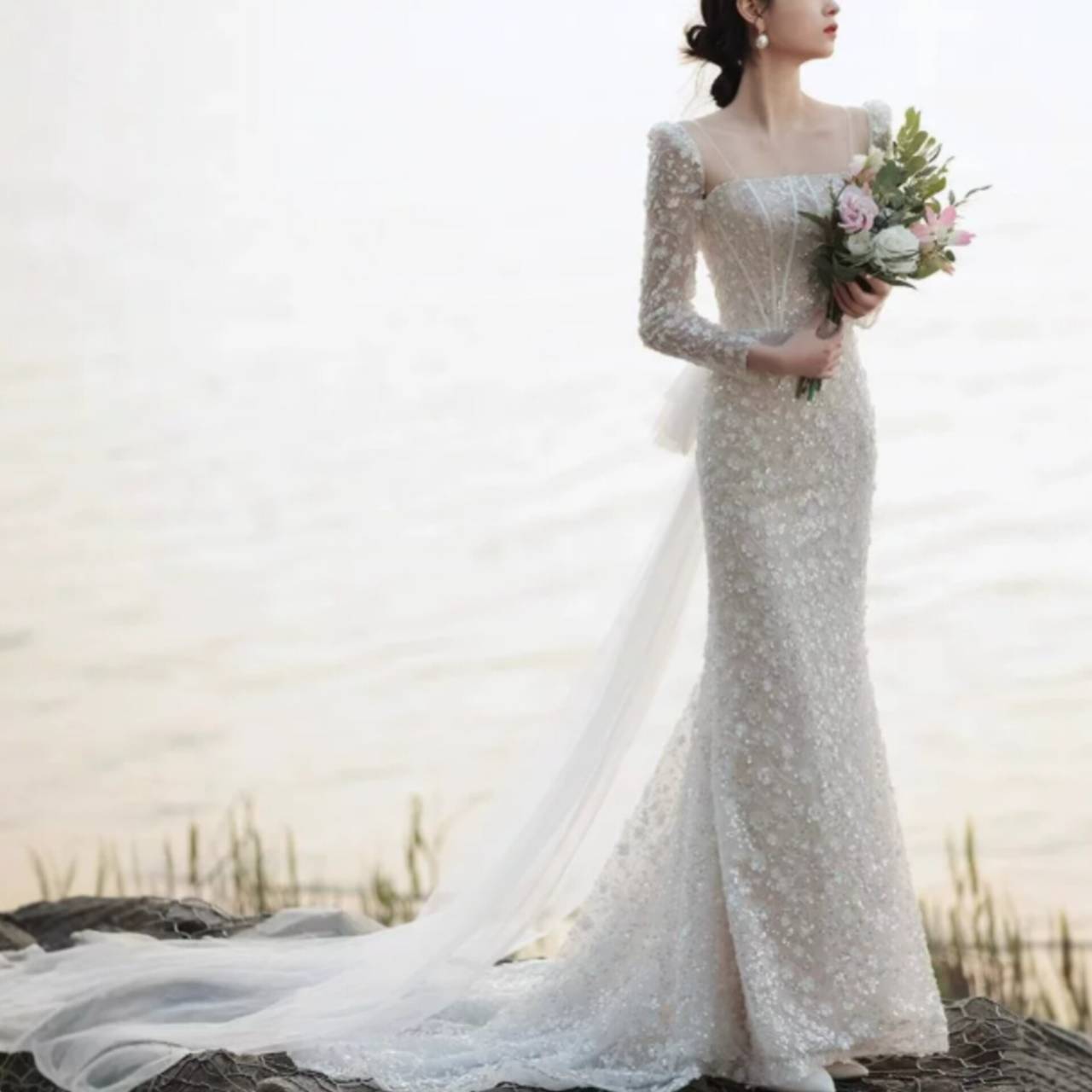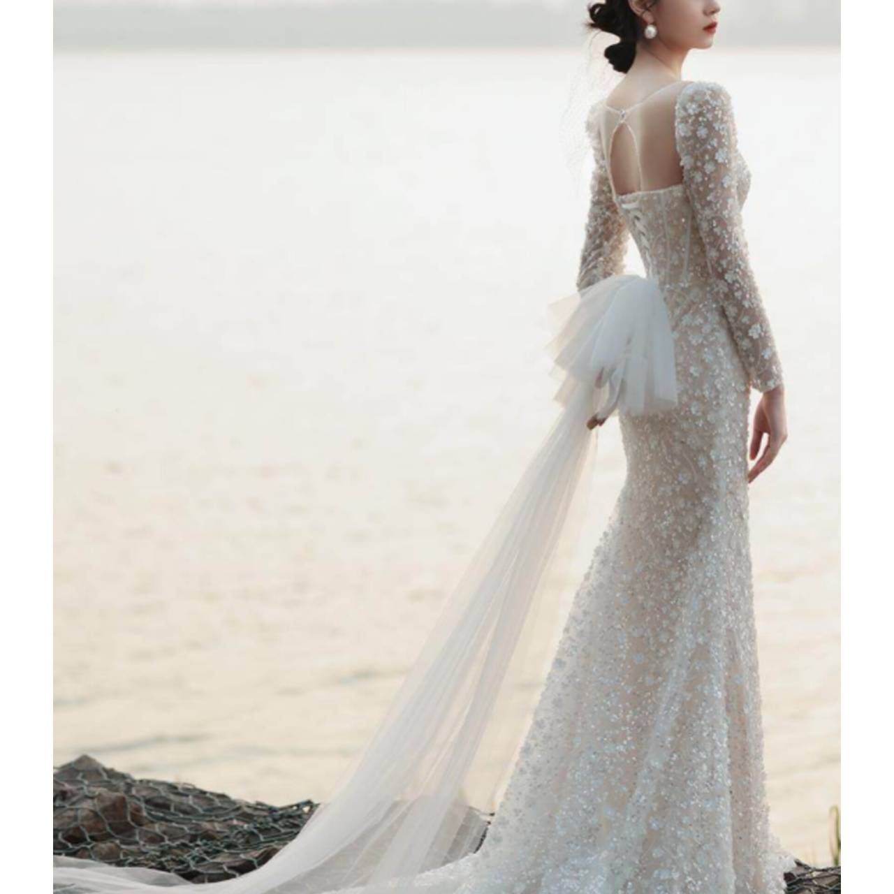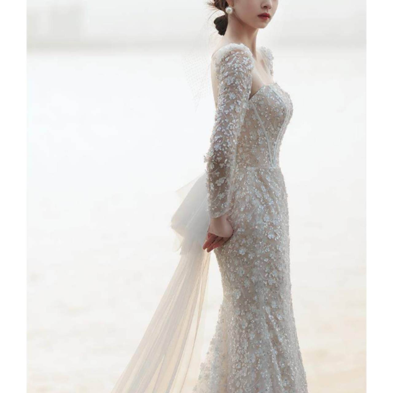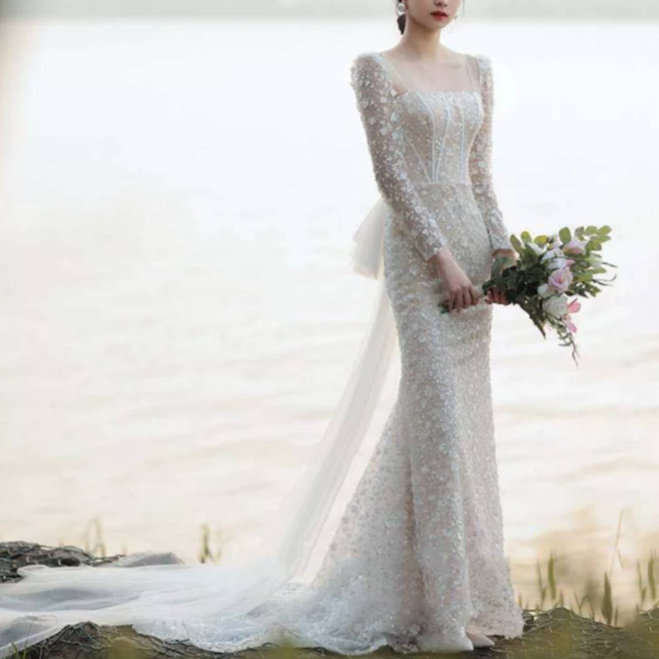 3Dフラワー ウェディングドレス 韓国ドレス スクエアネック 長袖 ロングスリーブ キラキラ 立体フラワー お花 花柄 ビジュー スパンコール バックオープン バックレースアップ バックコンシャス シアー チュール バックシャン ハイウエスト マーメイド ロングトレーン トレーン 異素材ミックス エレガント XS/3XL 韓国【K7089】