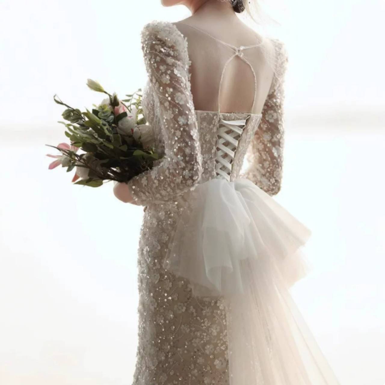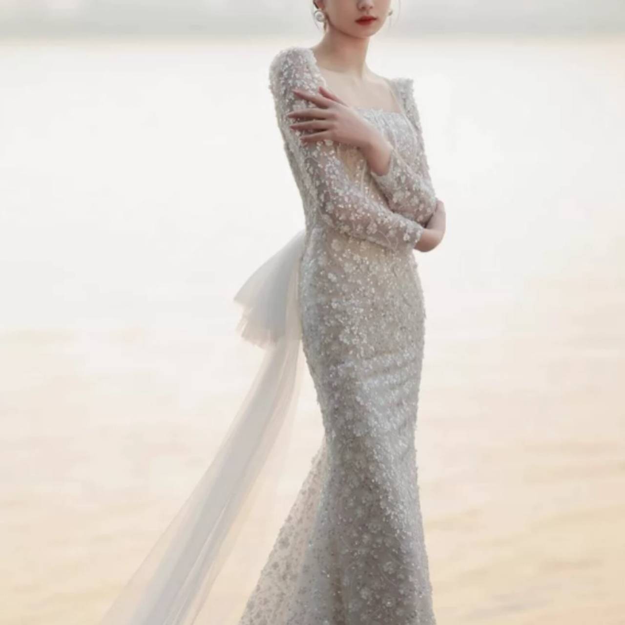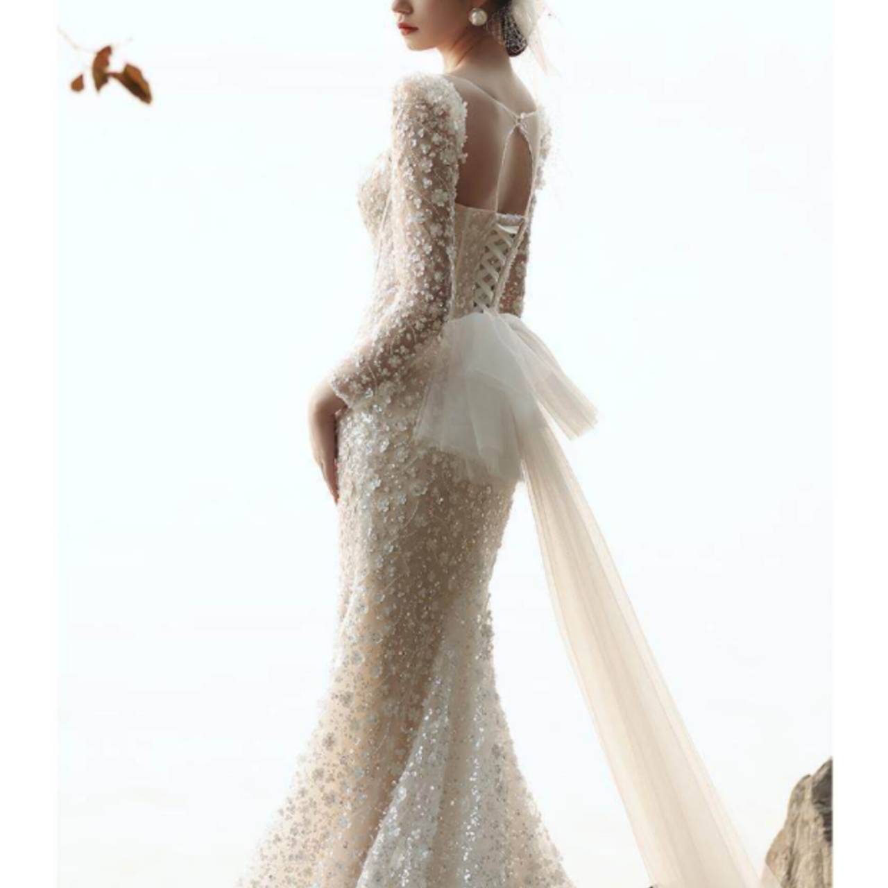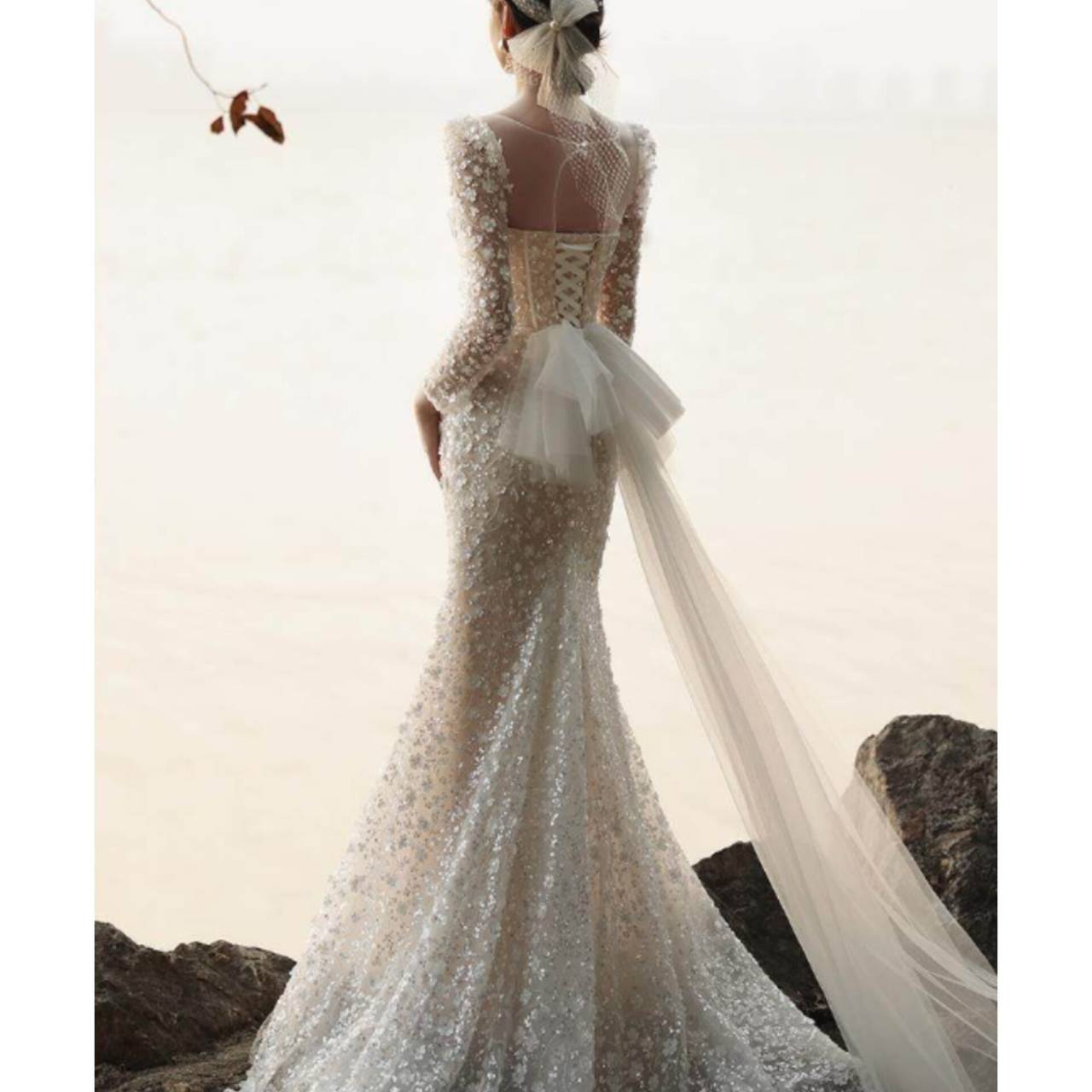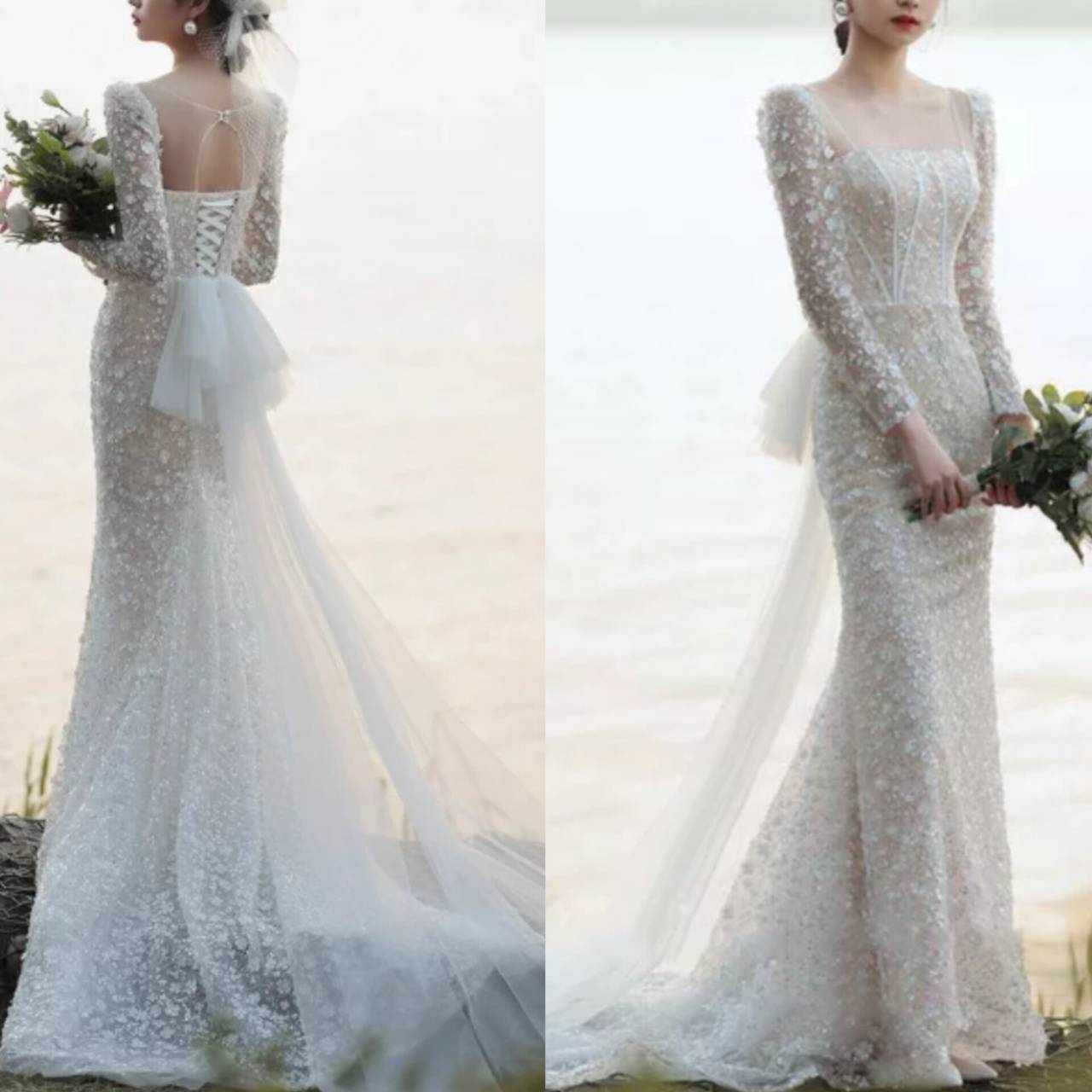 3Dフラワー ウェディングドレス 韓国ドレス スクエアネック 長袖 ロングスリーブ キラキラ 立体フラワー お花 花柄 ビジュー スパンコール バックオープン バックレースアップ バックコンシャス シアー チュール バックシャン ハイウエスト マーメイド ロングトレーン トレーン 異素材ミックス エレガント XS/3XL 韓国【K7089】