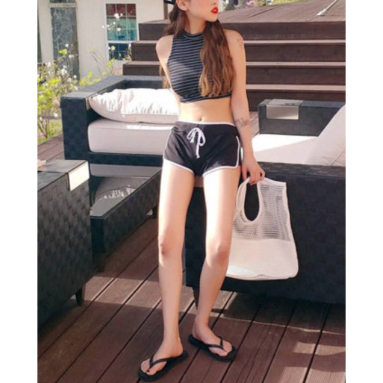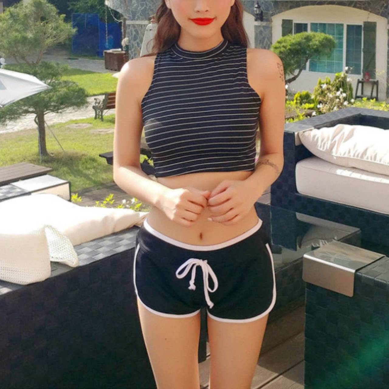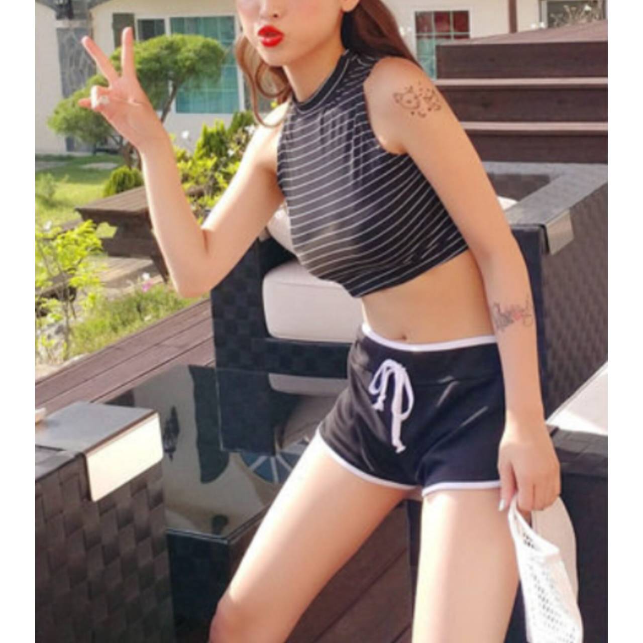 水着 セパレート水着 韓国水着 タンキニ クロップド丈 スタンドネック ボトルネック ノースリーブ ボーダー ハイウエスト ショートパンツ ボクサーパンツ モノトーン バイカラー 体型カバー かわいい S/XL 韓国【B9722】