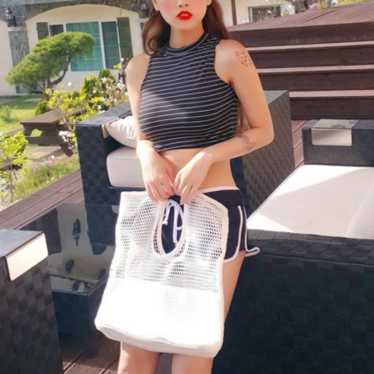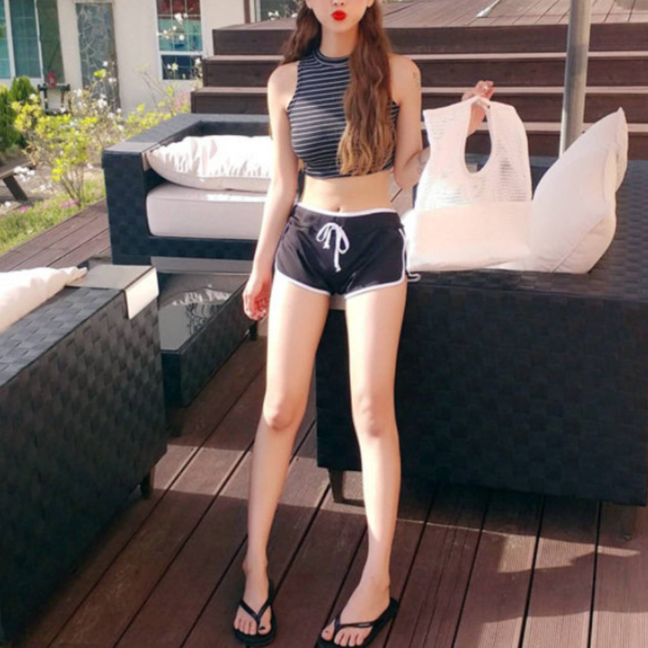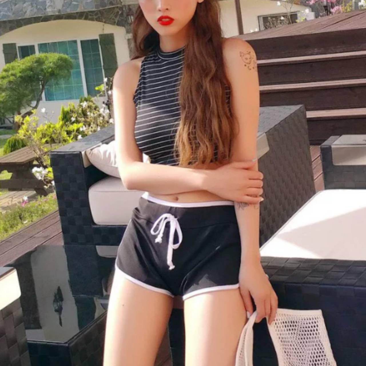 水着 セパレート水着 韓国水着 タンキニ クロップド丈 スタンドネック ボトルネック ノースリーブ ボーダー ハイウエスト ショートパンツ ボクサーパンツ モノトーン バイカラー 体型カバー かわいい S/XL 韓国【B9722】