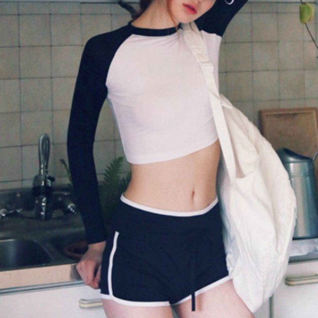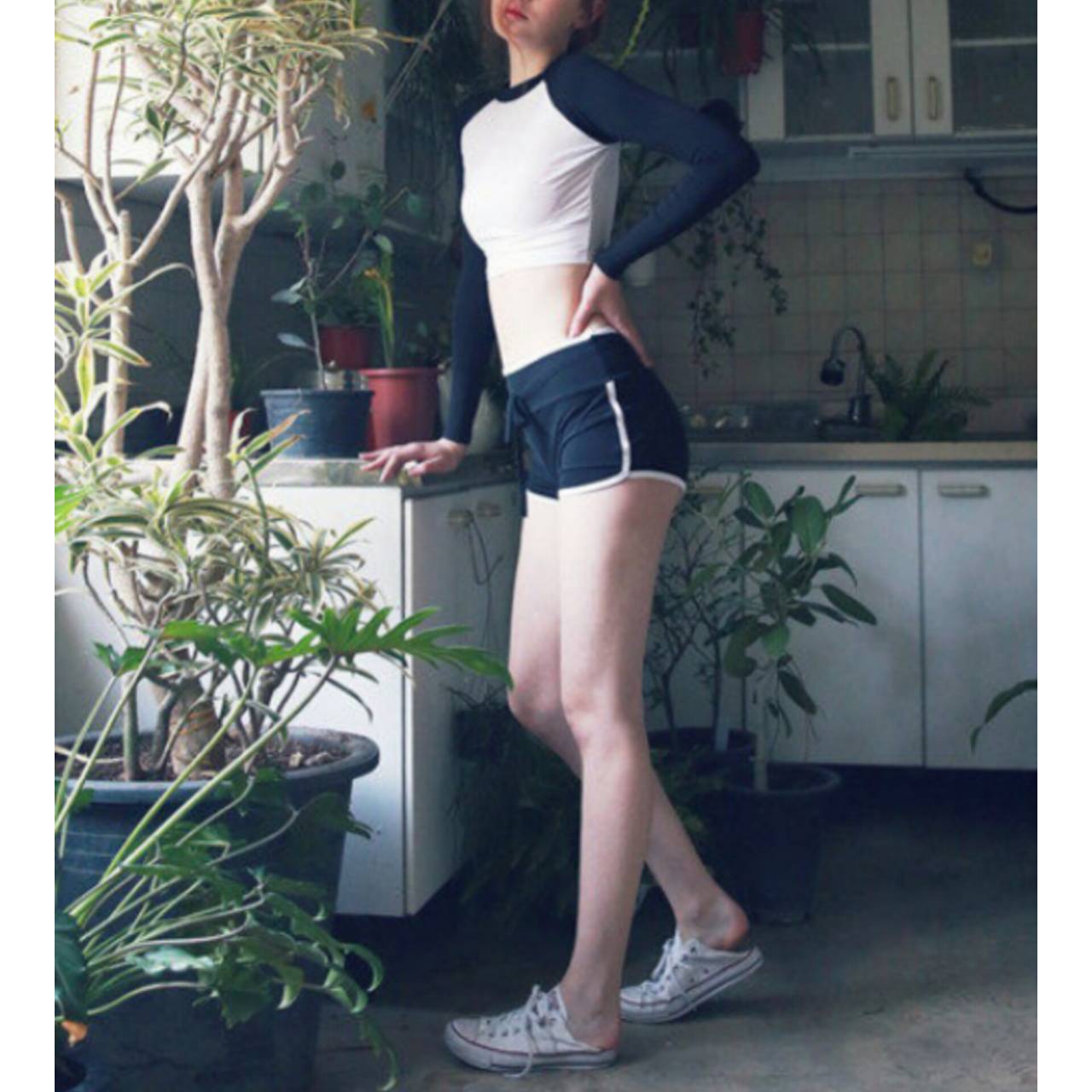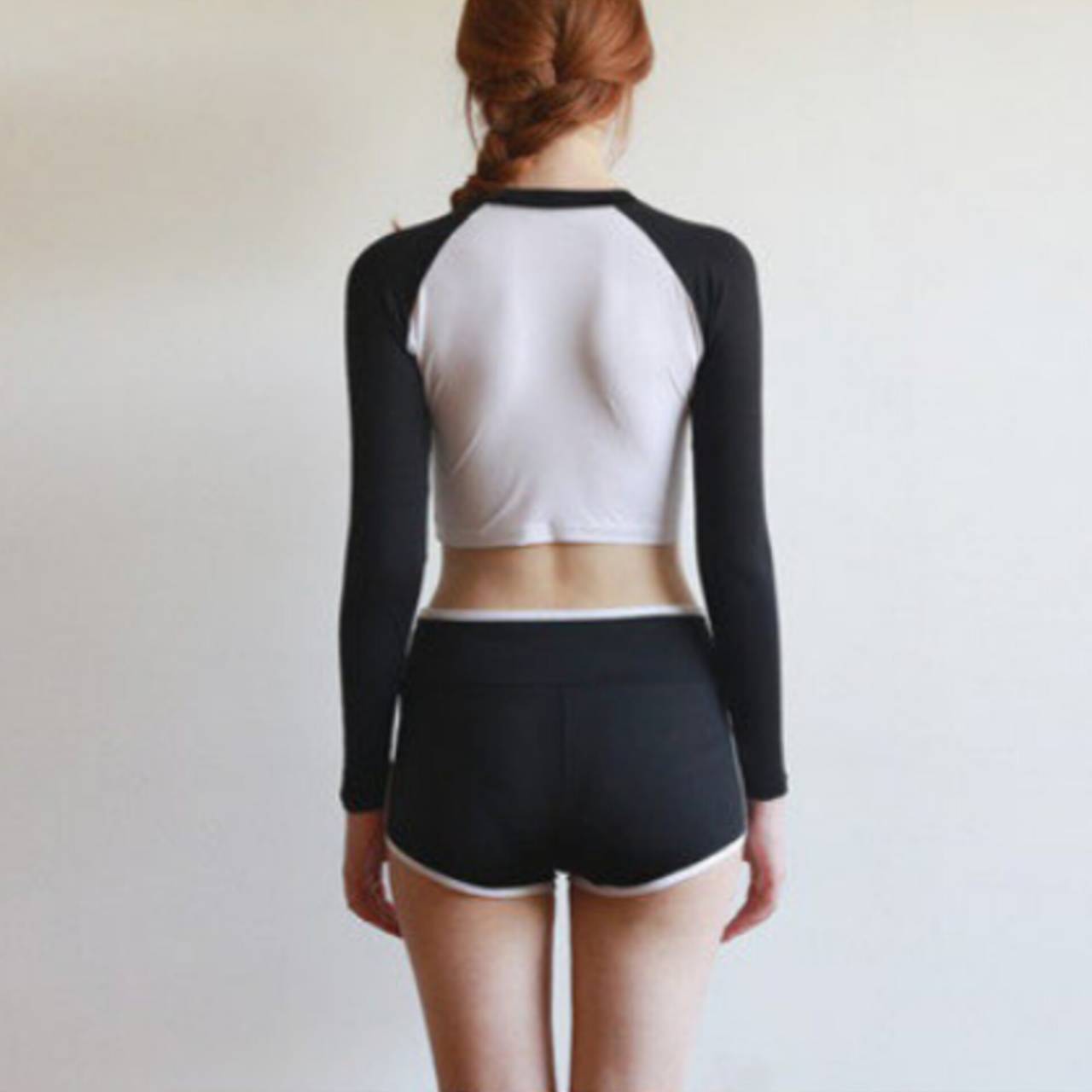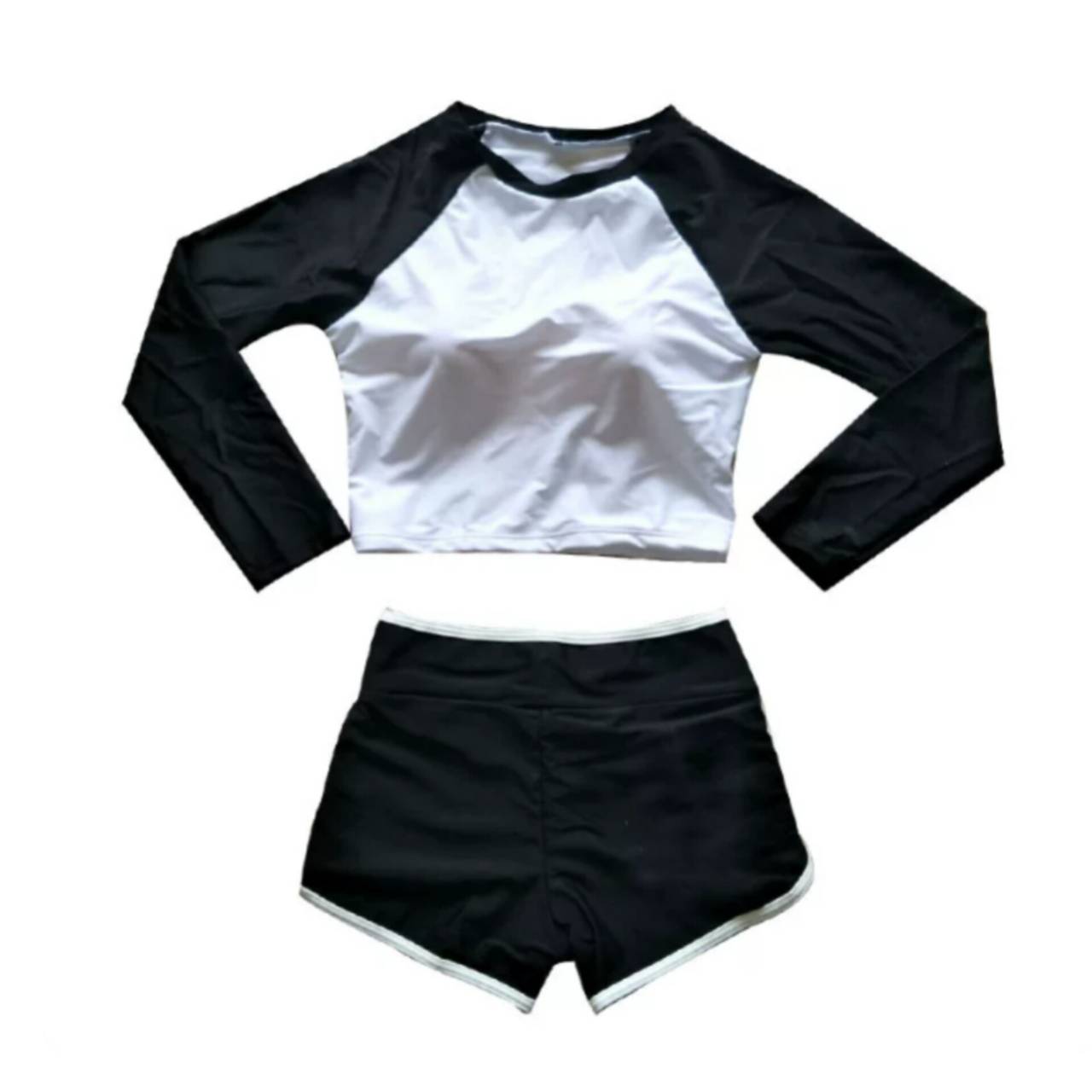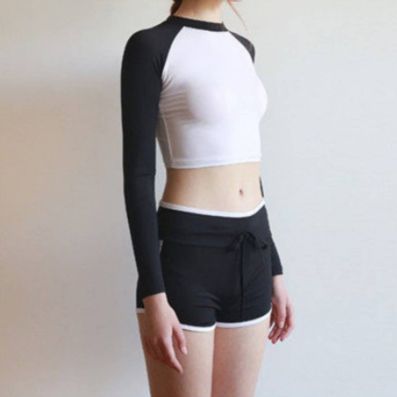 水着 タンキニ セパレート水着 韓国水着 長袖 クルーネック ロングスリーブ クロップド丈 ショート丈 ショートパンツ ハイウエスト バイカラー モノトーン ツートンカラー 体型カバー 日焼け防止 カジュアル かわいい S/XL 韓国【B9684】