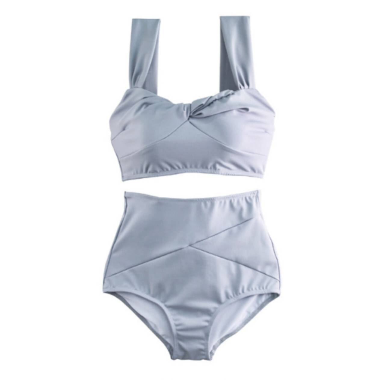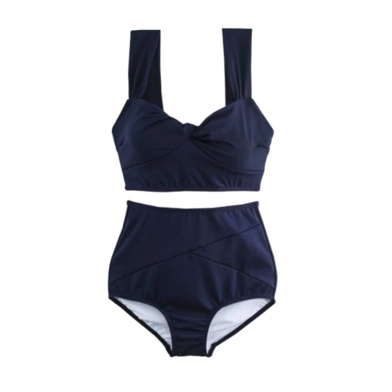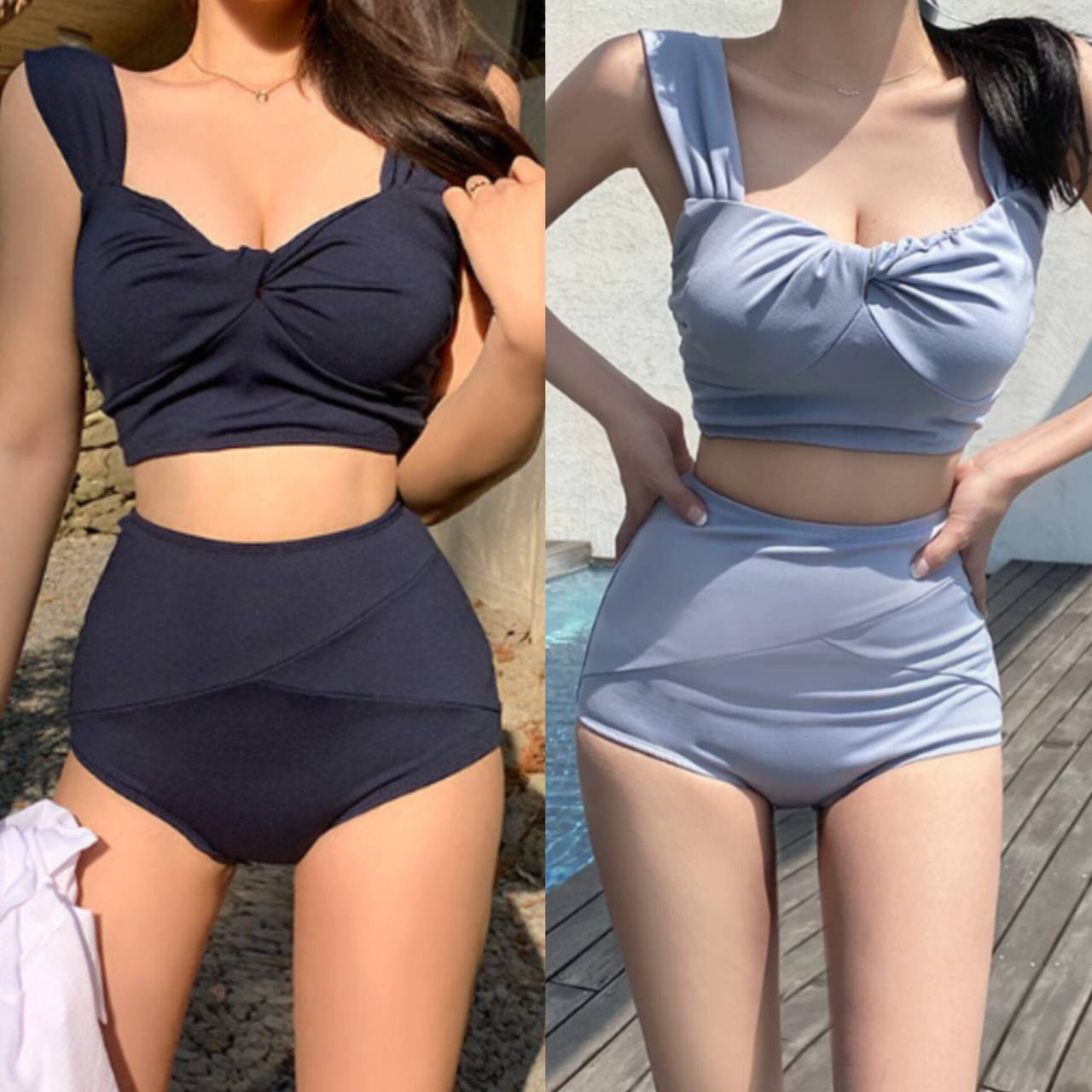 全2色 水着 タンキニ セパレート水着 韓国水着 太ストラップ ハートネック ねじりデザイン シャーリング ハイウエスト スタイルアップ 脚長効果 体型カバー M/XL 韓国【B9710】