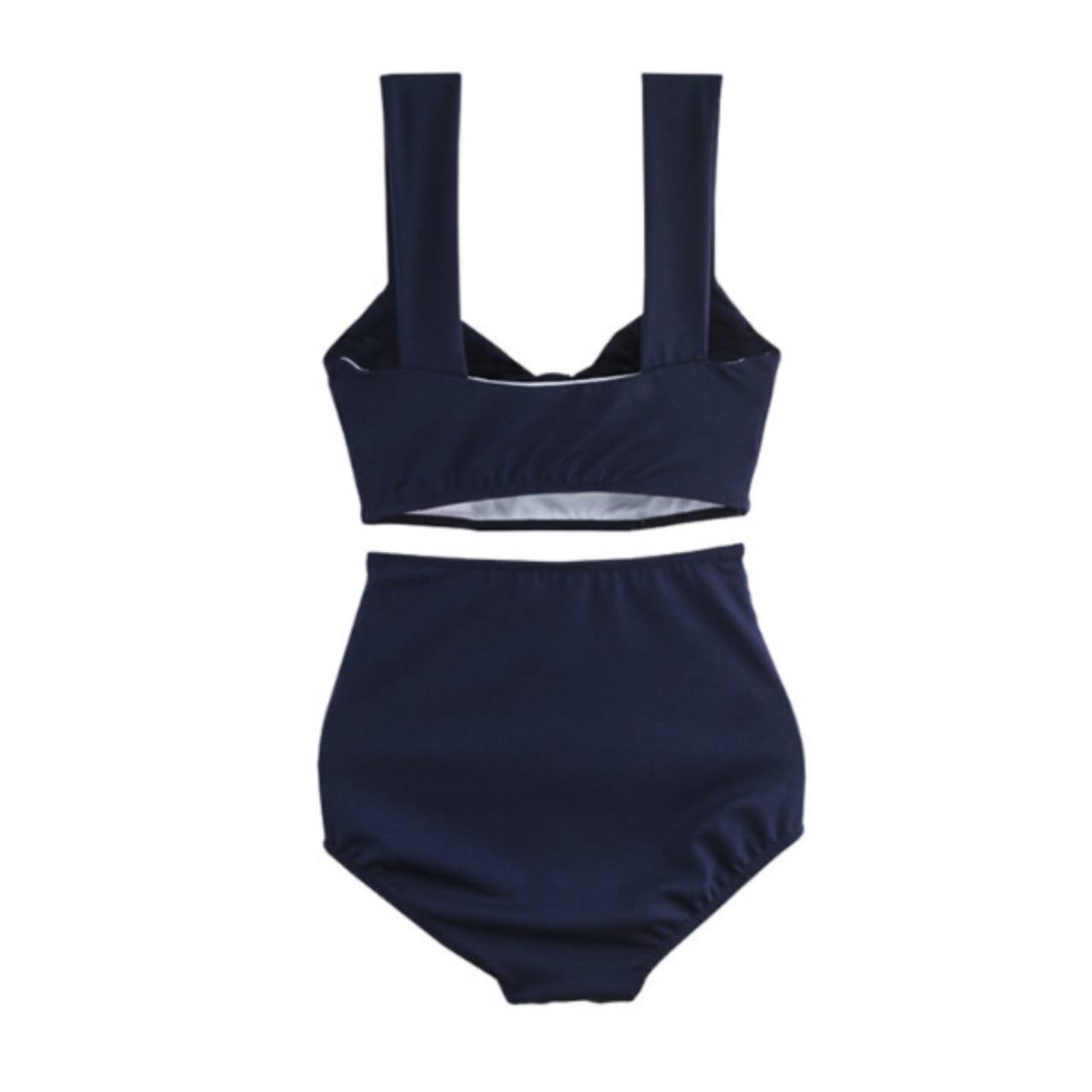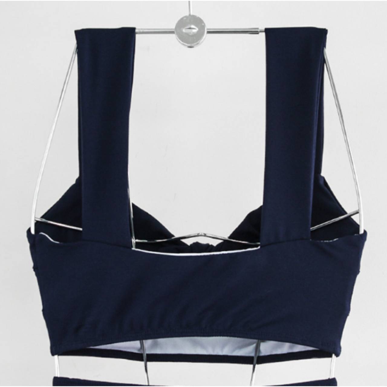 幅広ストラップが肩への負担を軽減しつつ、二の腕を華奢に見せます。ボトムはハイウエスト設計+クロスライン切替。