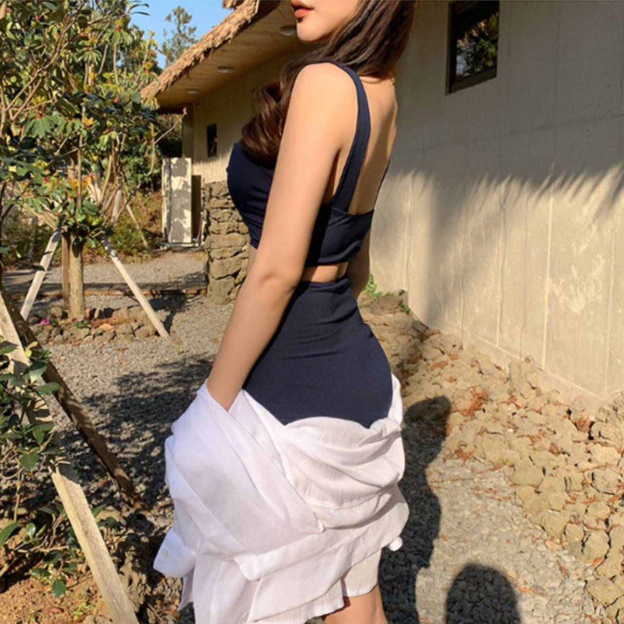 露出が控えめだから落ち着いて着られ、でも地味にはならない。リゾートでもホテルプールでも、上品に映える“大人の余裕”を纏えます。