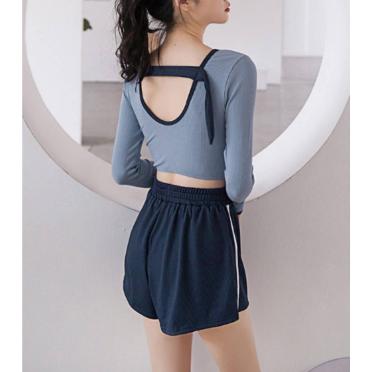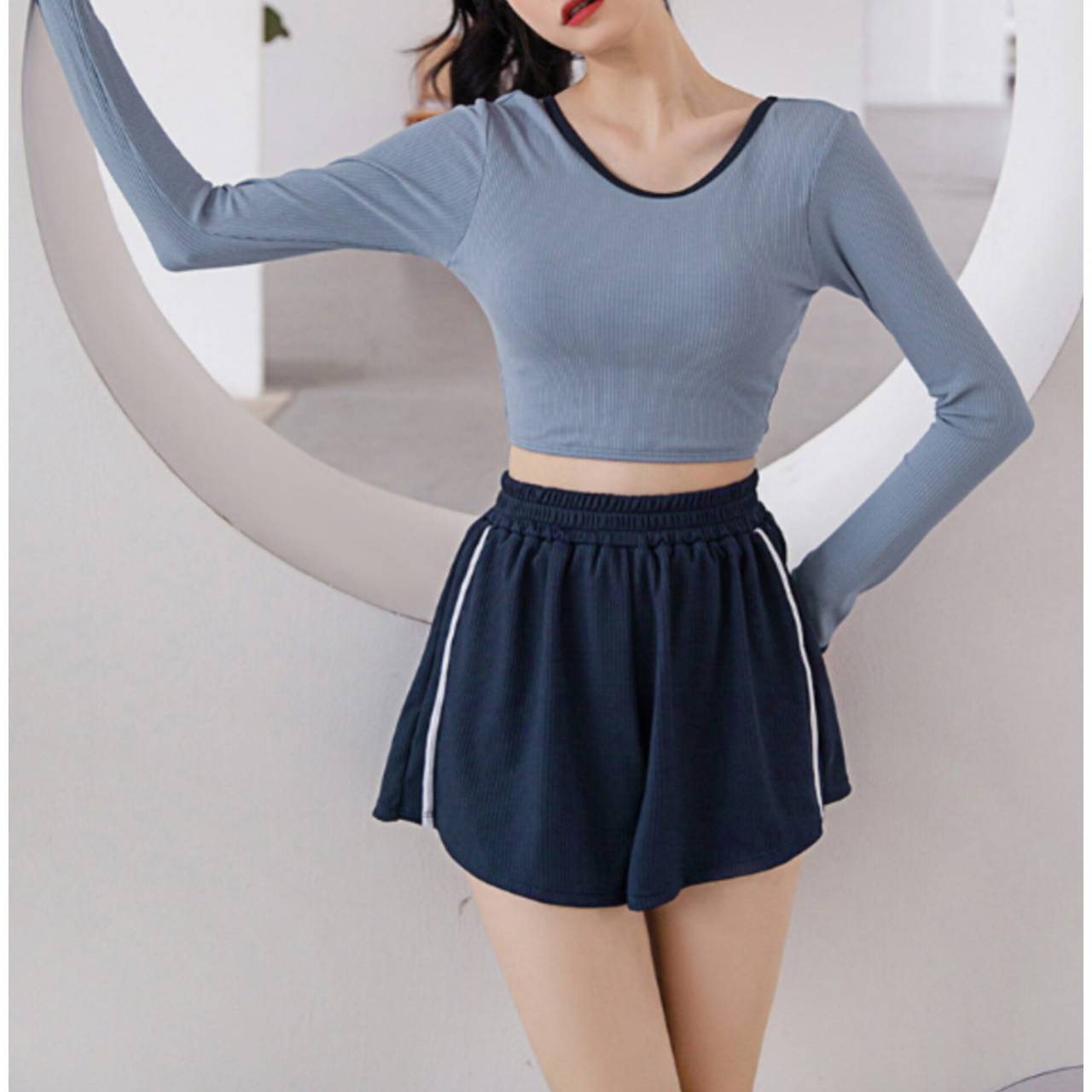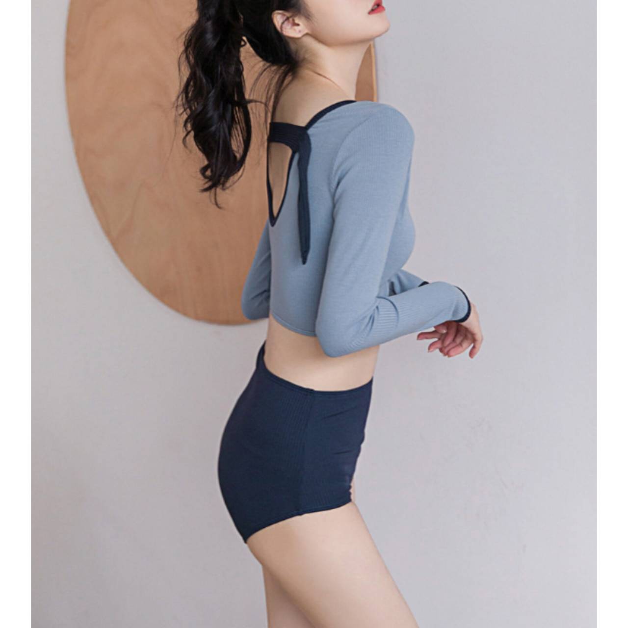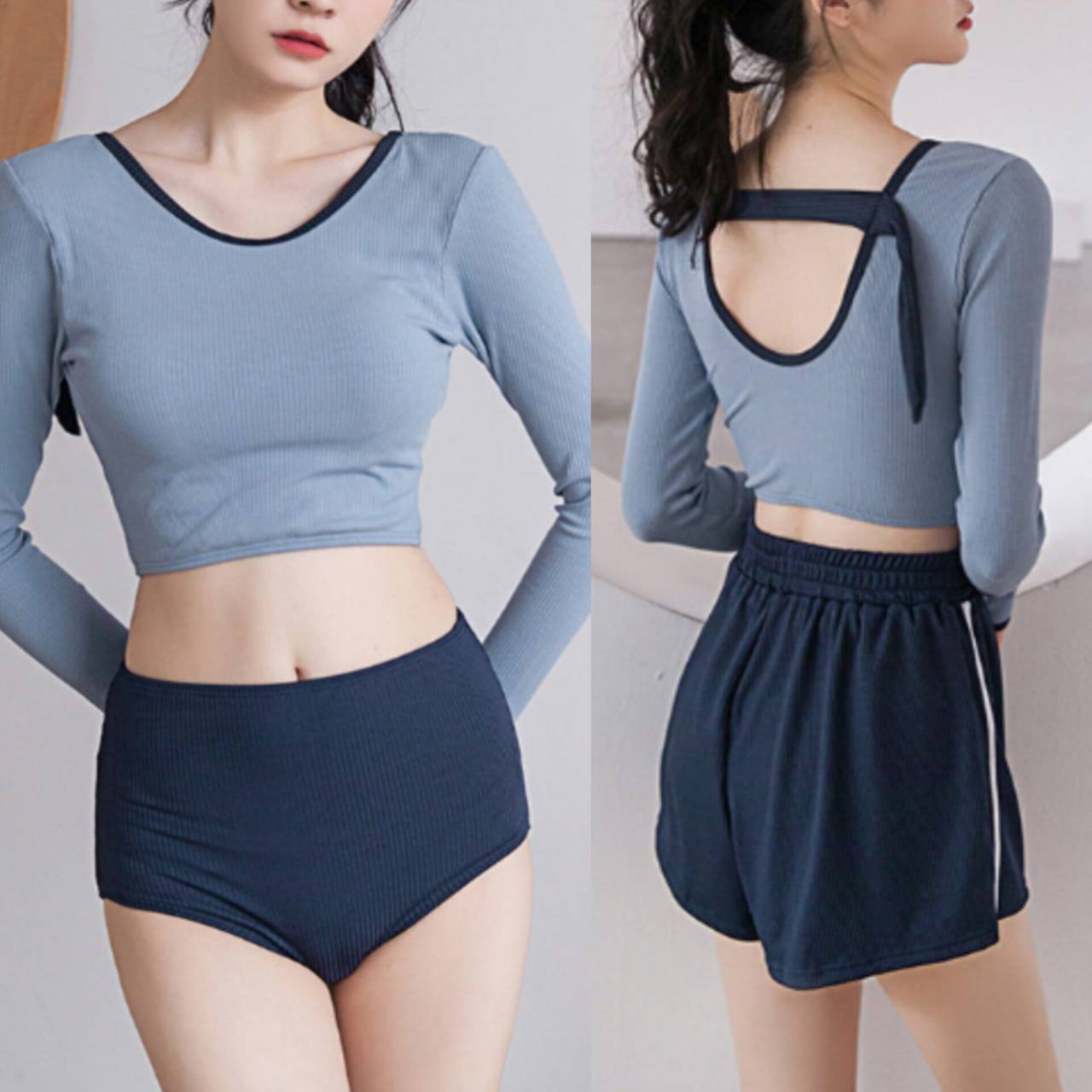 セットアップ タンキニ 水着 セットアップ水着 セパレート水着 韓国水着 クルーネック 長袖 ロングスリーブ クロップド丈 ショート丈 バックオープン ハイウエスト ショートパンツ リブ リブ素材 3ピース スリーピース バイカラー ツートンカラー 体型カバー 日焼け防止 M/XL 韓国【B9712】
