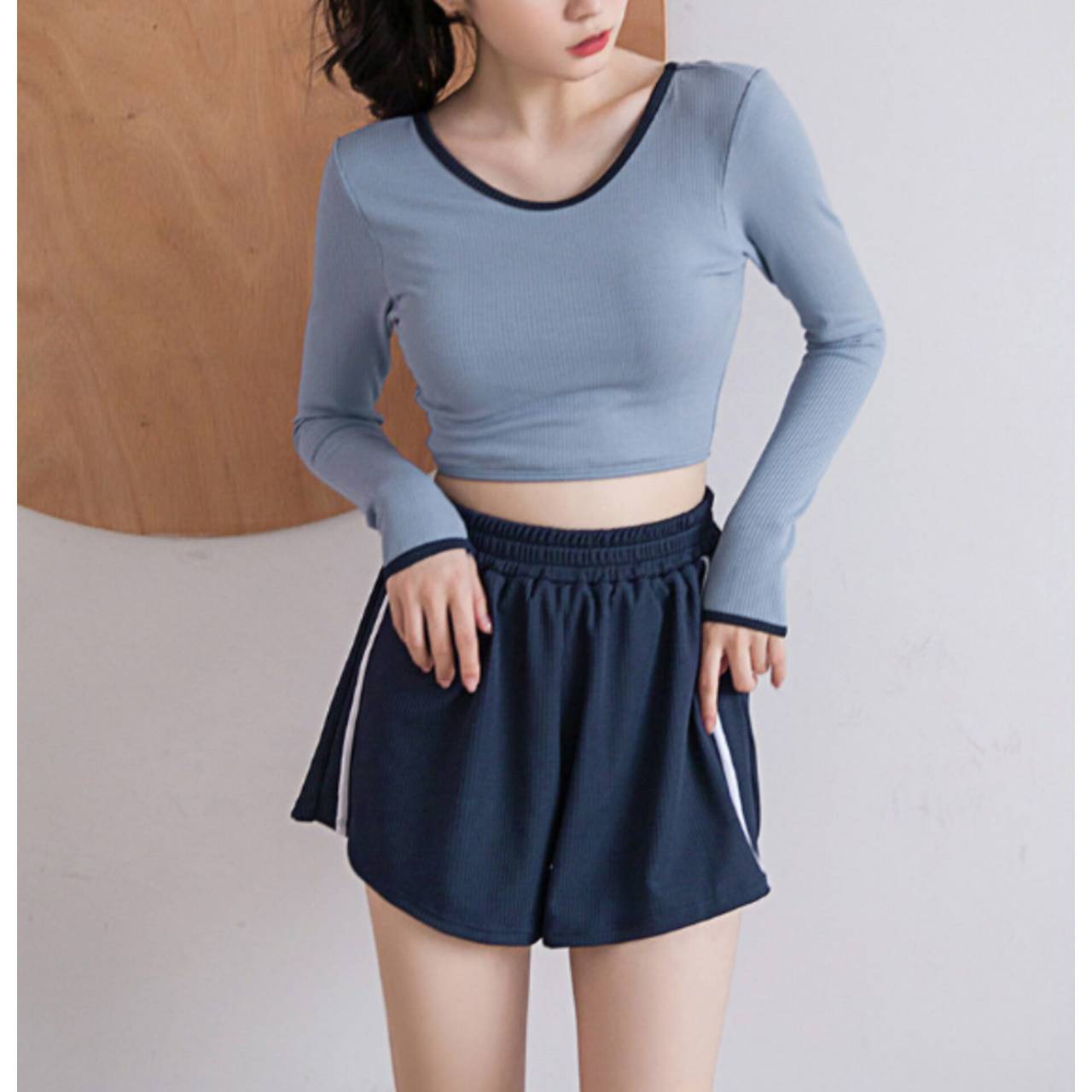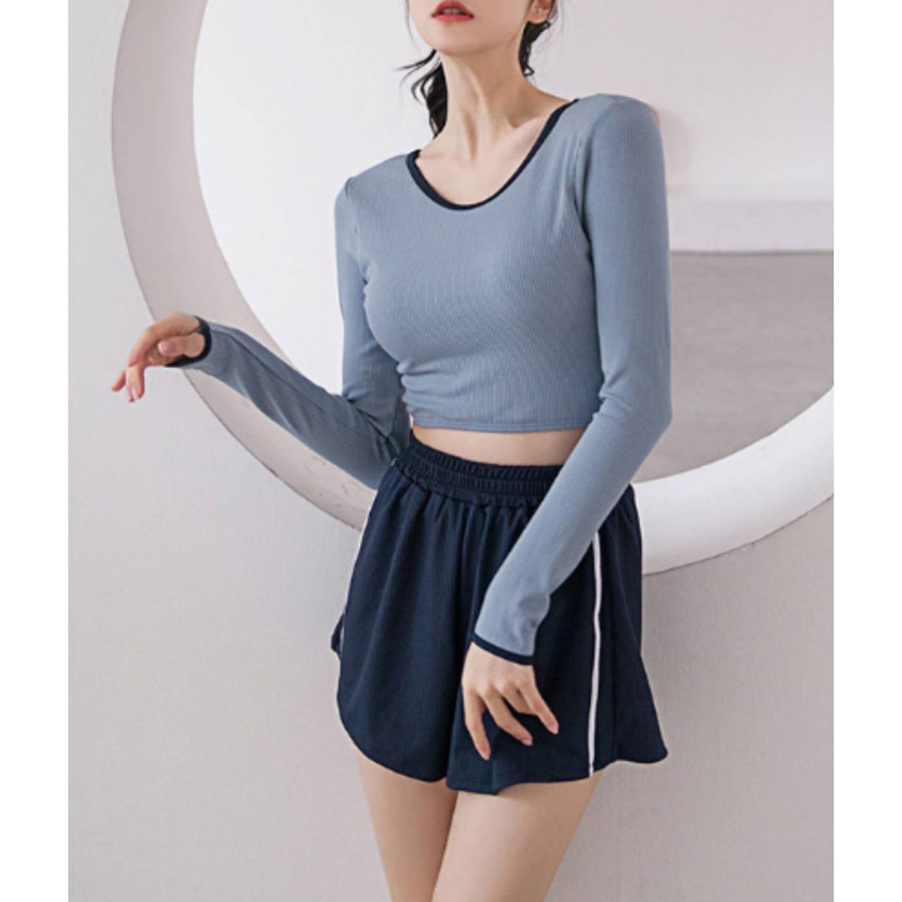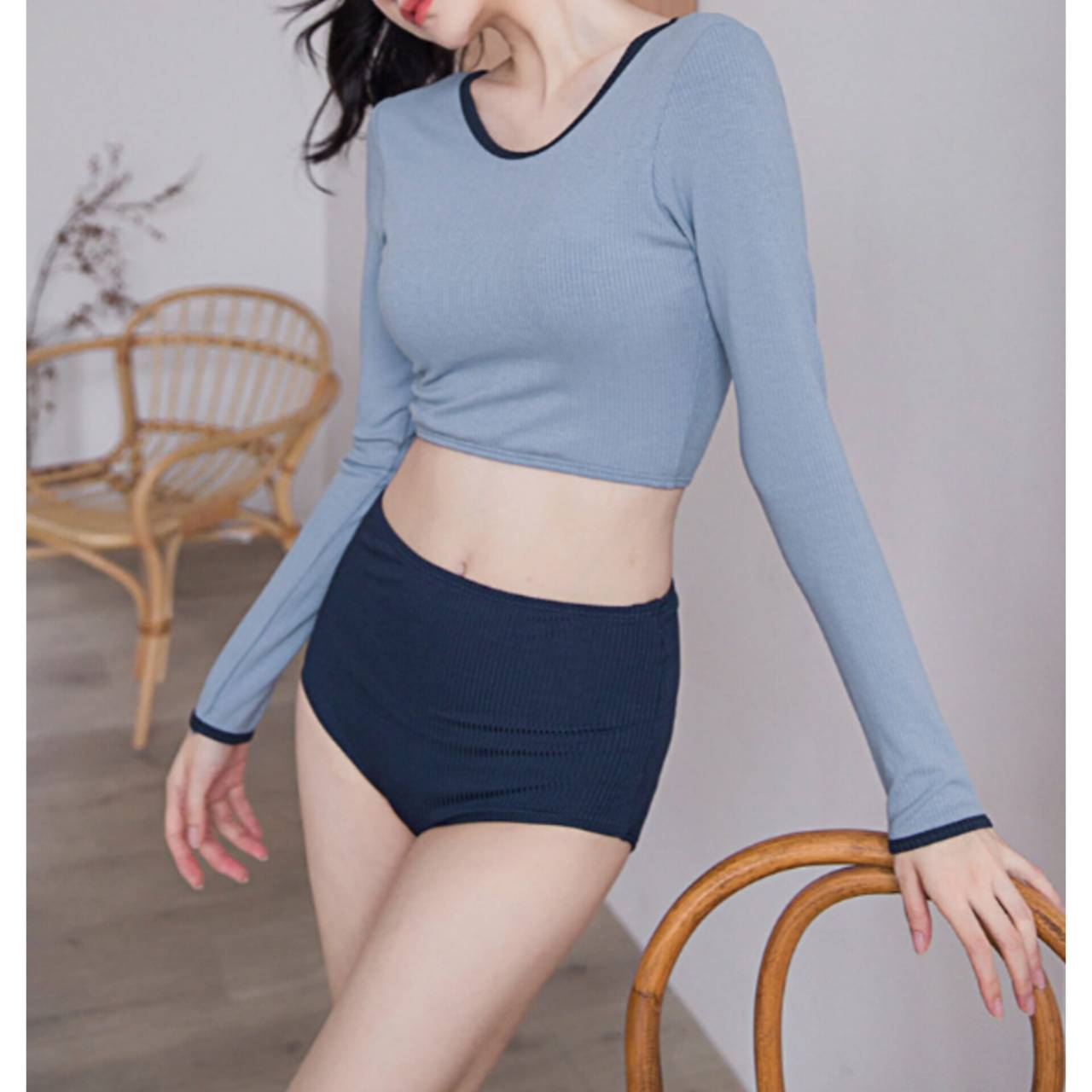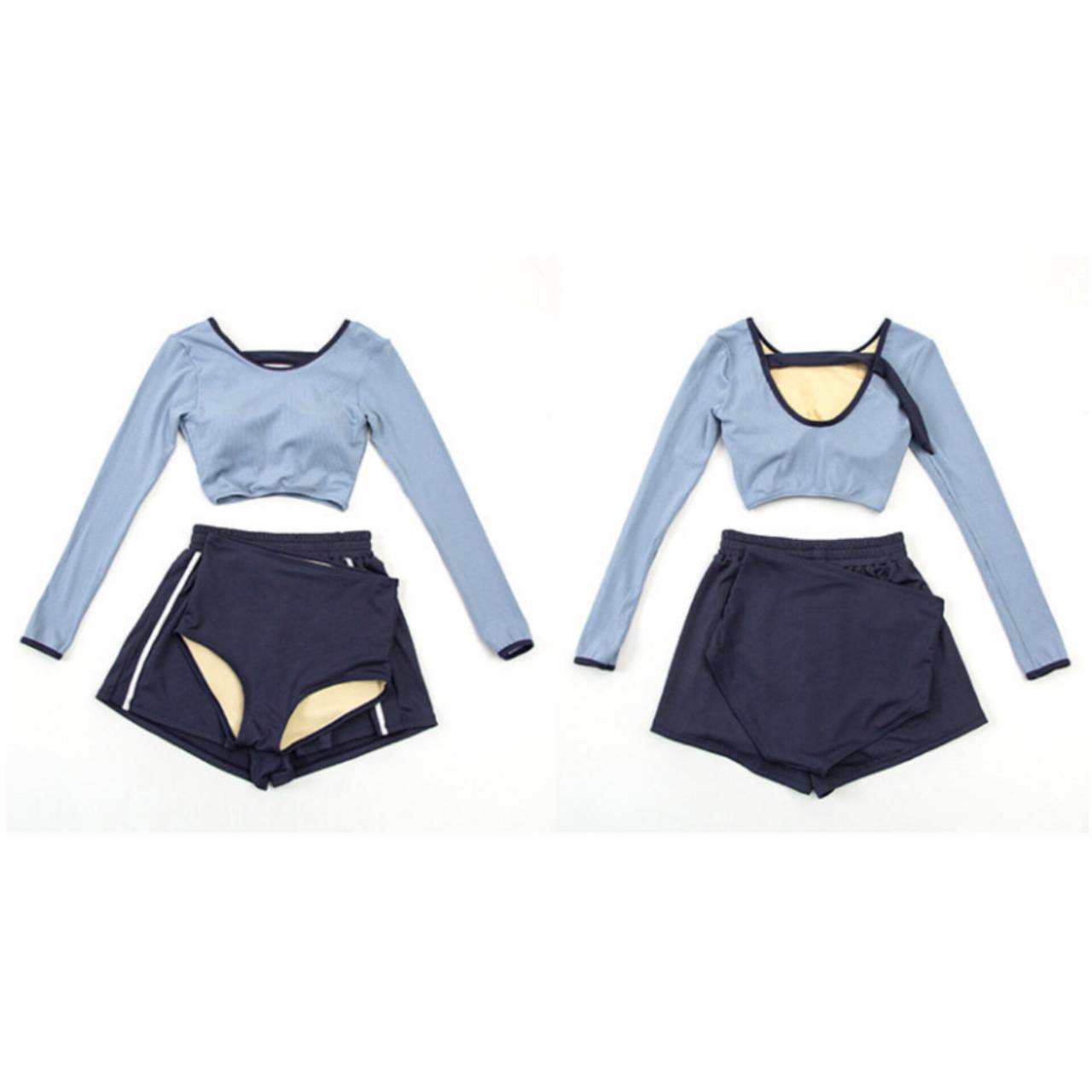 セットアップ タンキニ 水着 セットアップ水着 セパレート水着 韓国水着 クルーネック 長袖 ロングスリーブ クロップド丈 ショート丈 バックオープン ハイウエスト ショートパンツ リブ リブ素材 3ピース スリーピース バイカラー ツートンカラー 体型カバー 日焼け防止 M/XL 韓国【B9712】