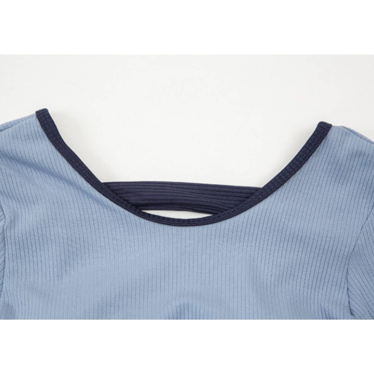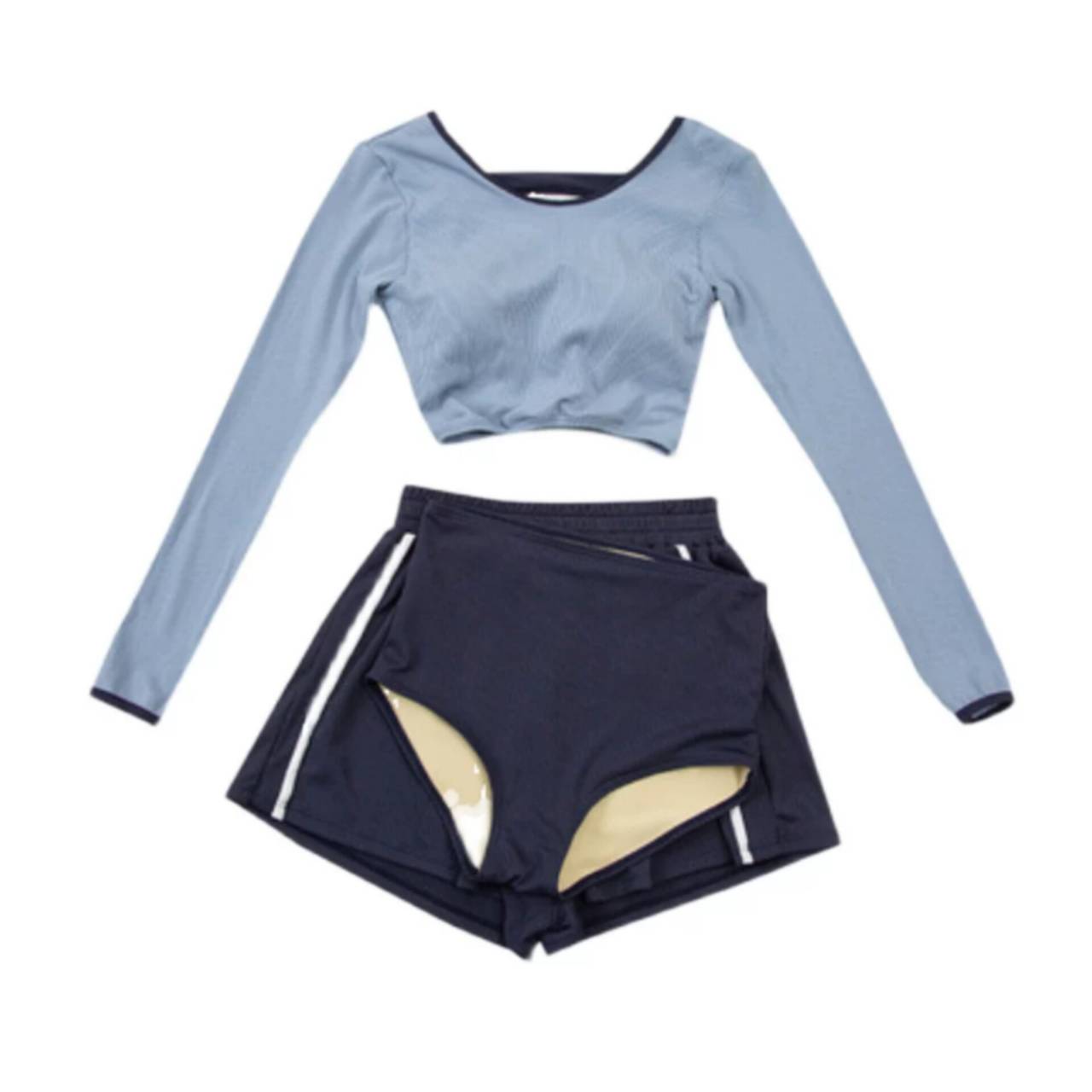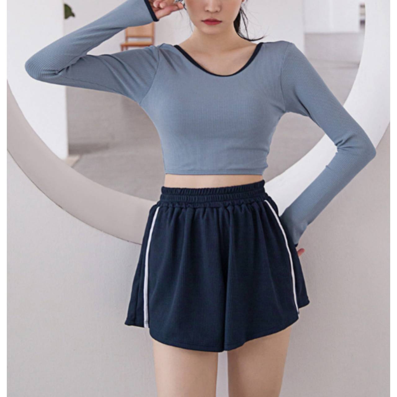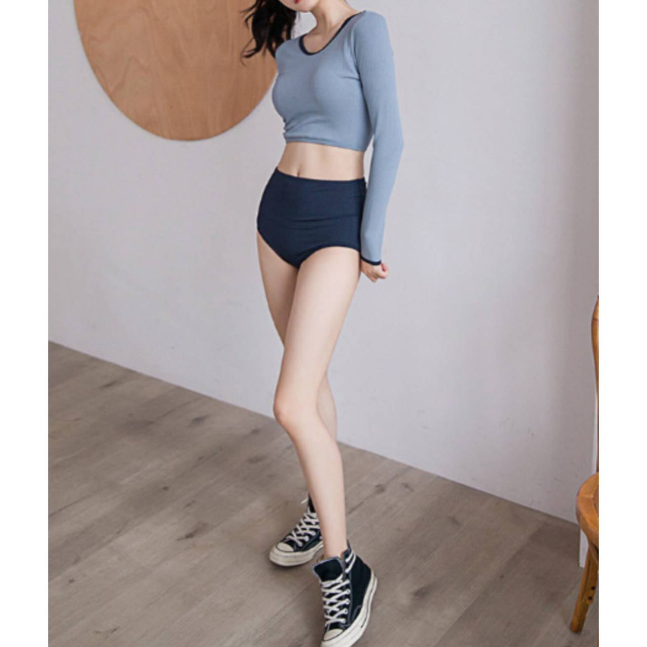 セットアップ タンキニ 水着 セットアップ水着 セパレート水着 韓国水着 クルーネック 長袖 ロングスリーブ クロップド丈 ショート丈 バックオープン ハイウエスト ショートパンツ リブ リブ素材 3ピース スリーピース バイカラー ツートンカラー 体型カバー 日焼け防止 M/XL 韓国【B9712】