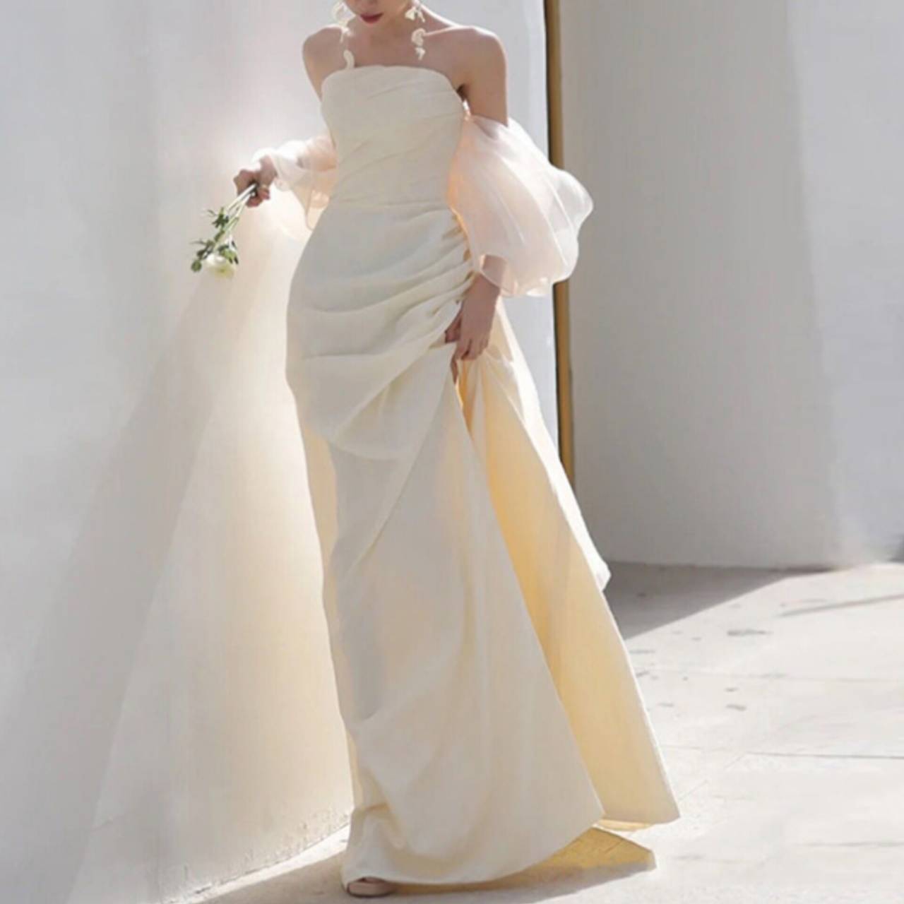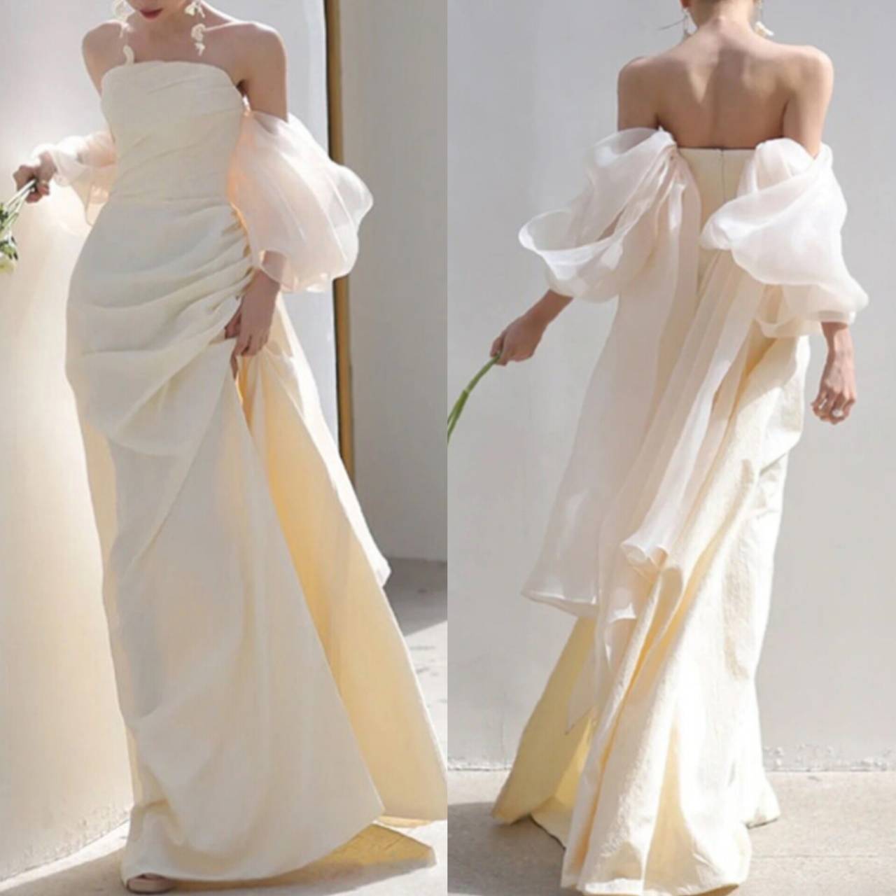 前・横・後ろ、どこから見ても写真映えする一着です。カラー展開:オフホワイト(アイボリー寄り)