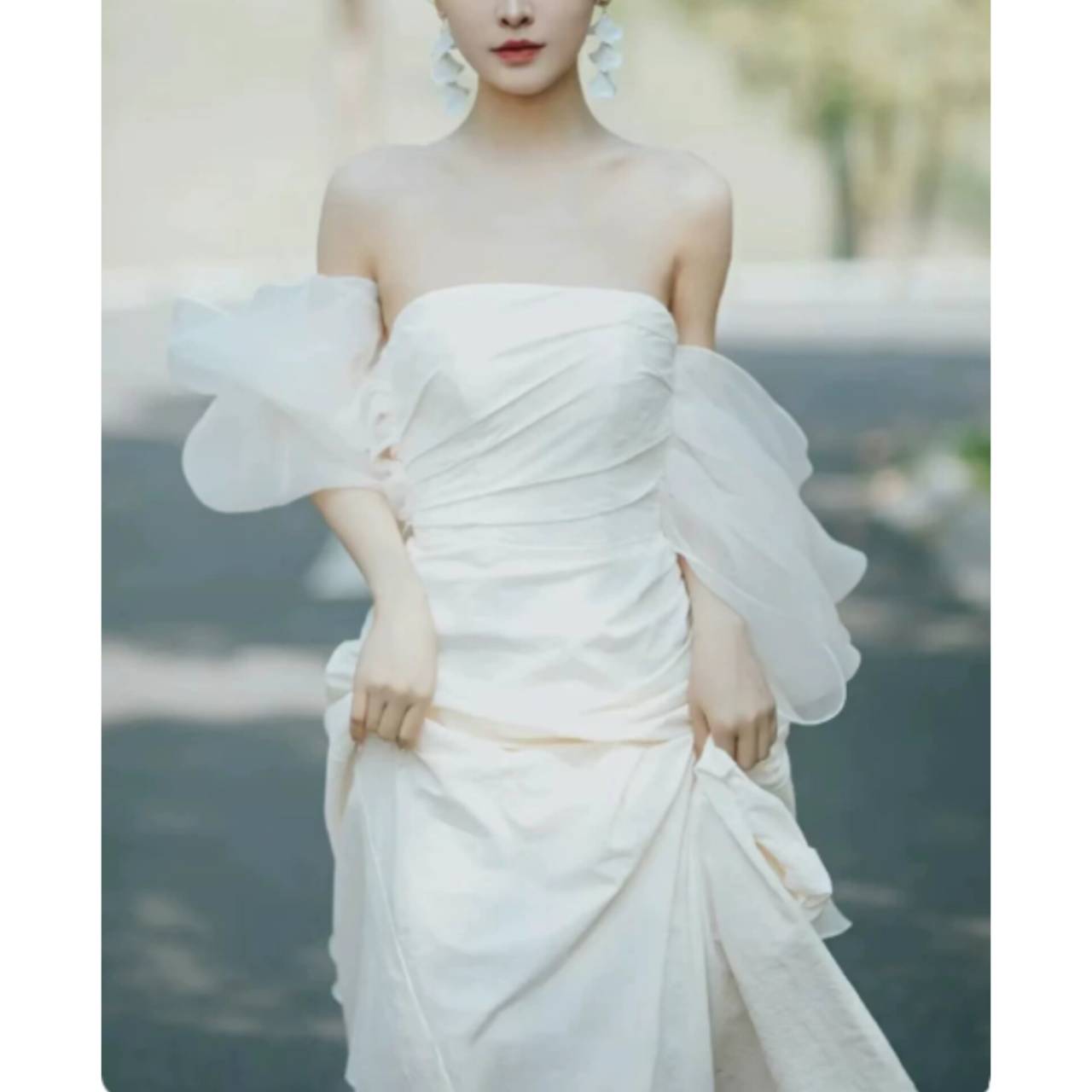 柔らかな透け感と落ち感のある生地が、動くたびに空気を含み、自然な立体感と奥行きを生み出します。・ストラップレスの美しい直線ラインがデコルテをすっきり見せ、首元・肩まわりを上品に演出